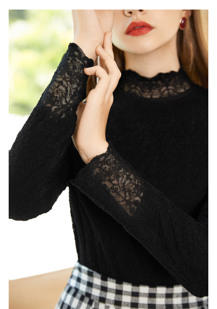 【女子图鉴】冬装半高领打底衫女蕾丝绣花网纱内搭上衣 002260