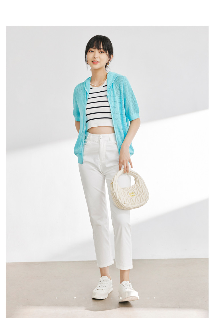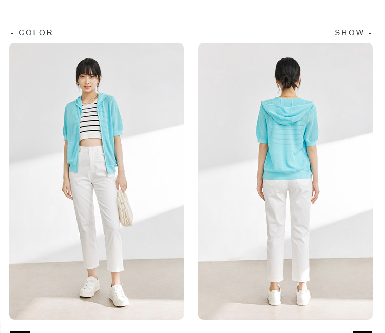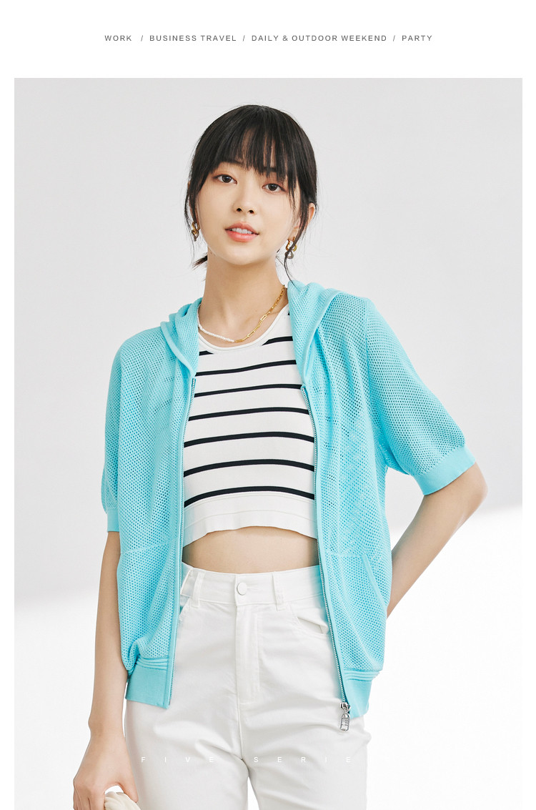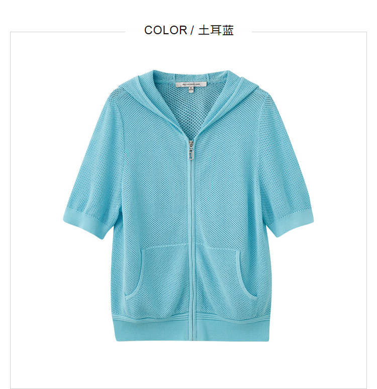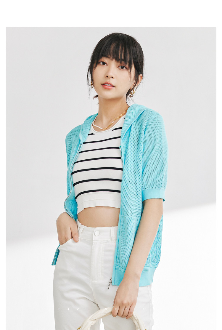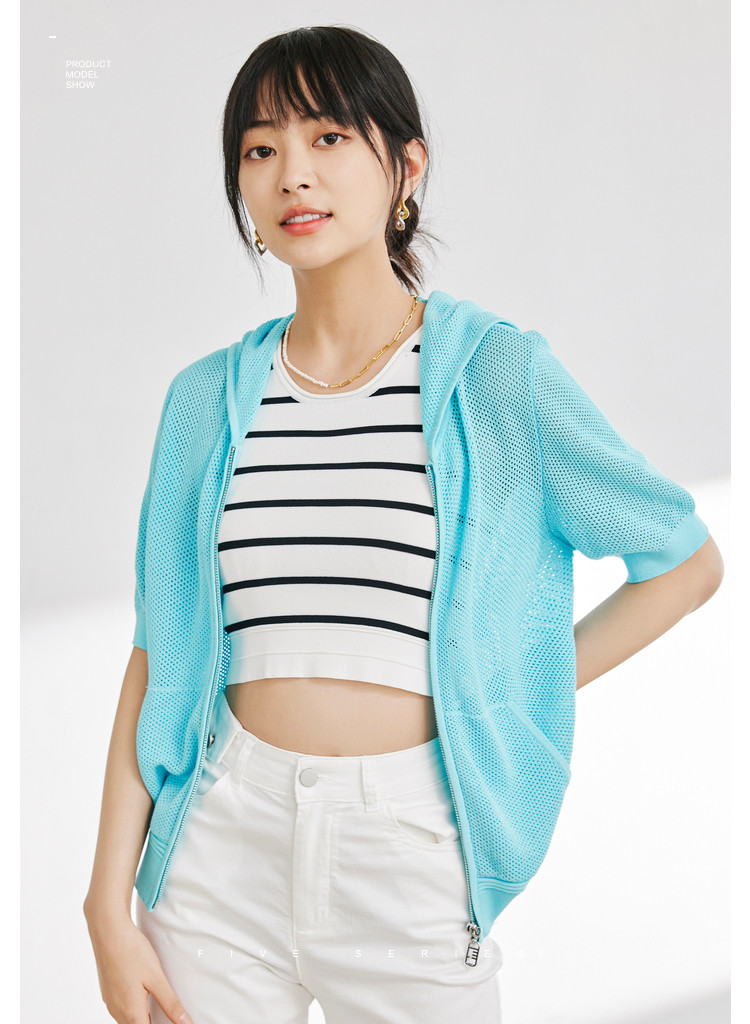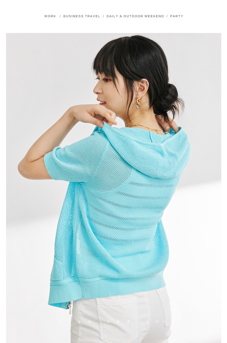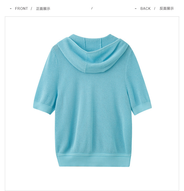 商品名称:五分袖纯色针织衫女夏款运动休闲风短袖上衣镂空拉链连帽卫衣女 628675