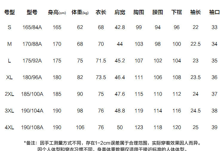 | 4XL(推荐98~106kg) | 76 | 50 | 118 | 25 | 123 | 120 | 190/108A |