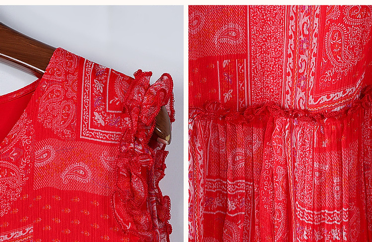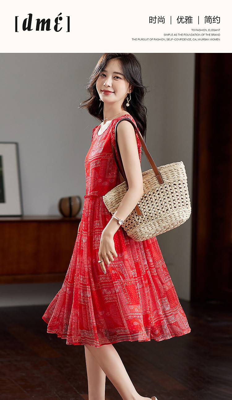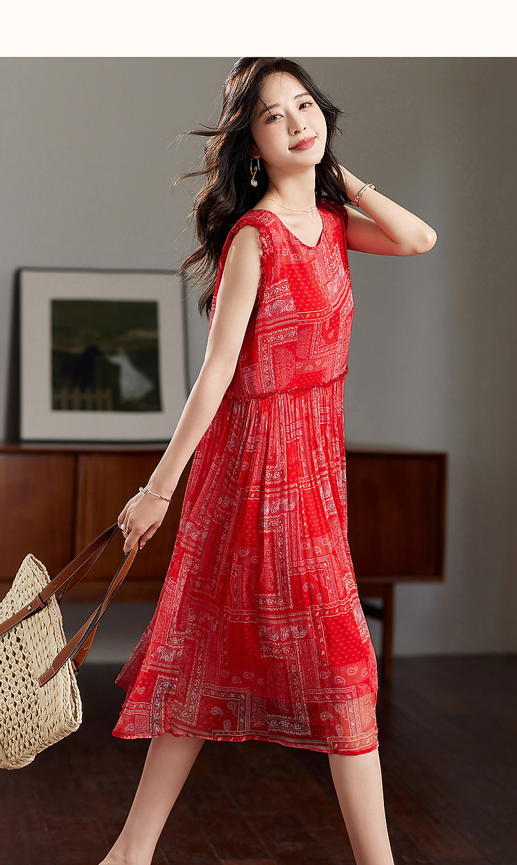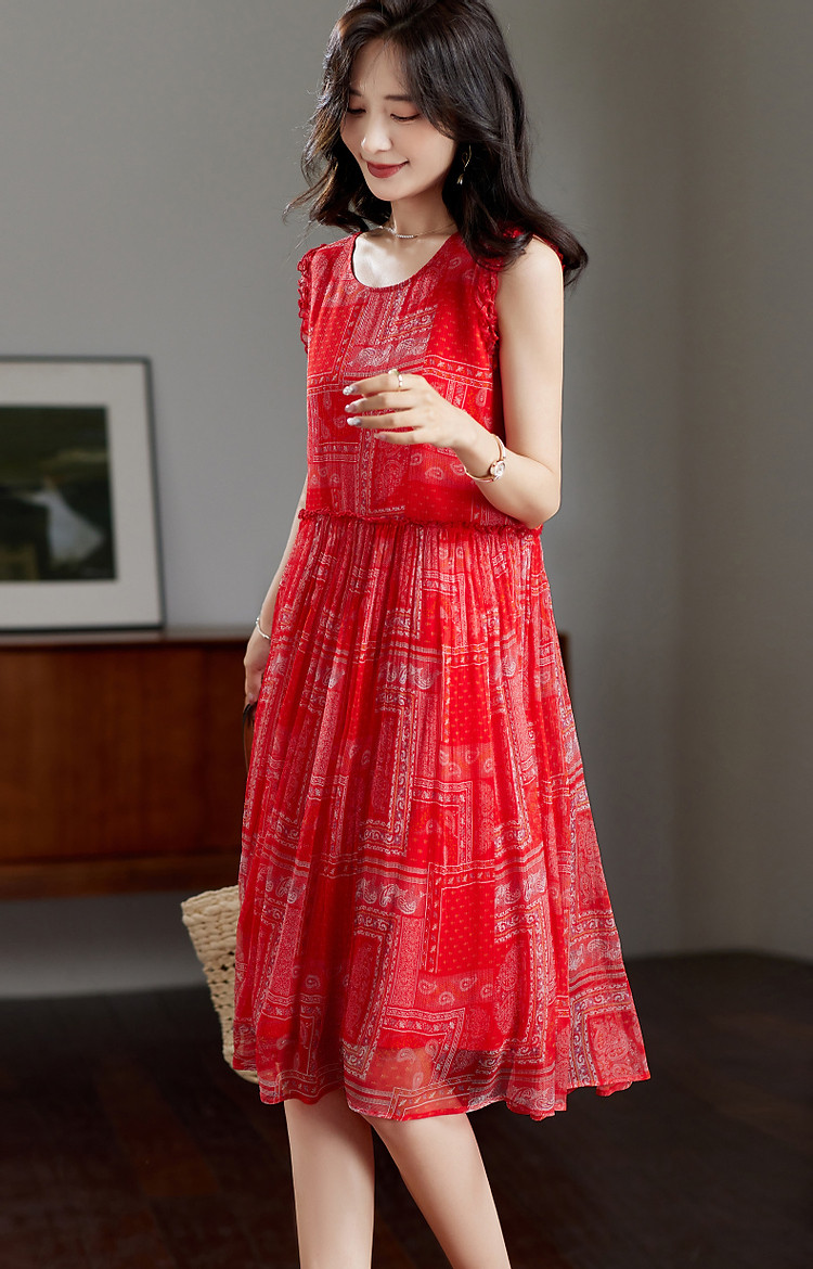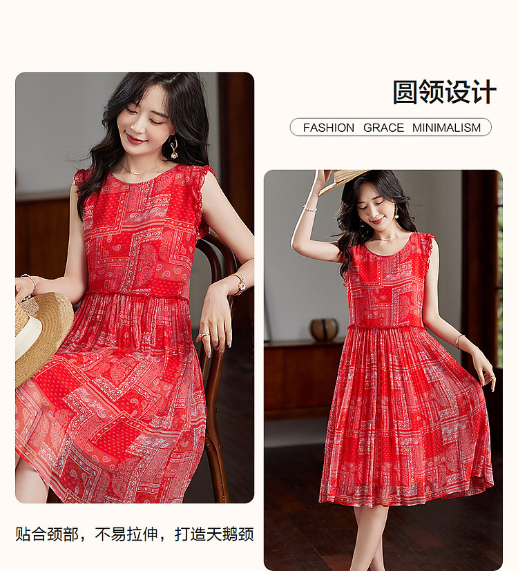 商品名称:【确幸红】夏度假慵懒柔润真丝桑蚕丝抽褶显瘦a字连衣裙 398657