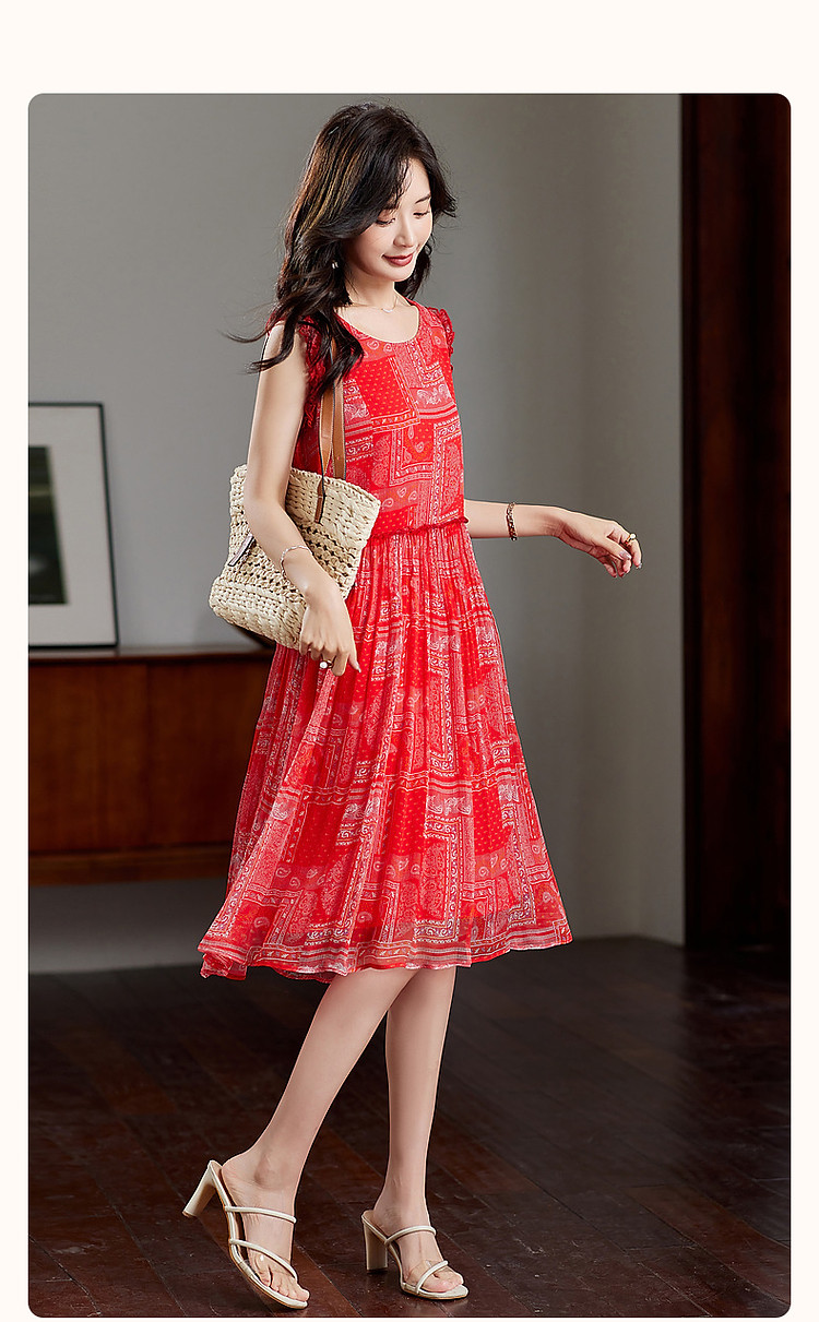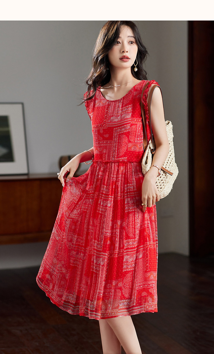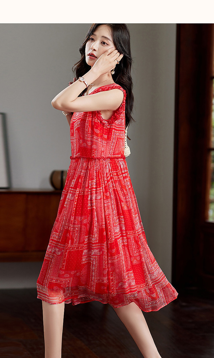 【确幸红】夏度假慵懒柔润真丝桑蚕丝抽褶显瘦a字连衣裙 398657