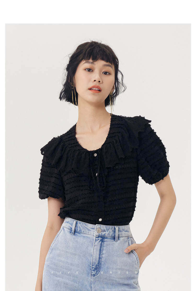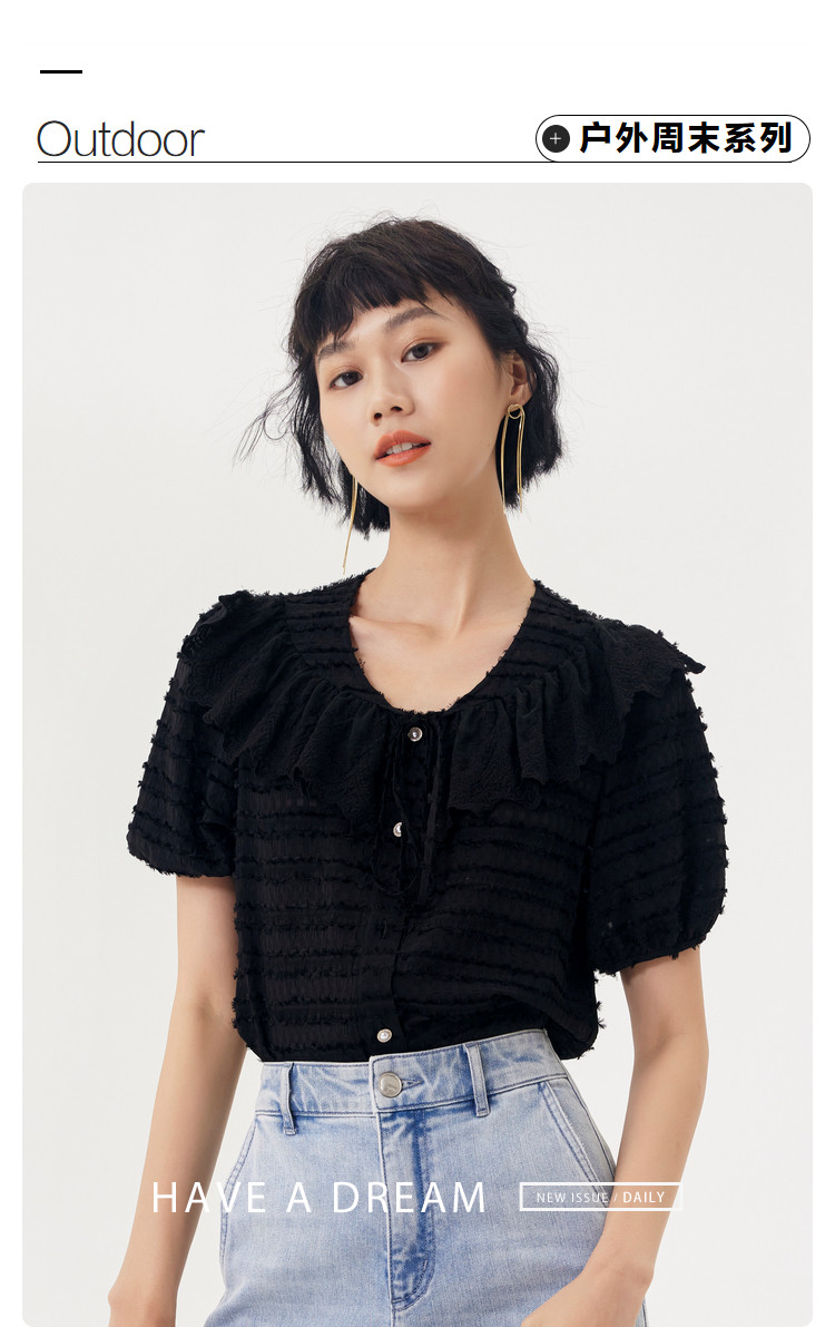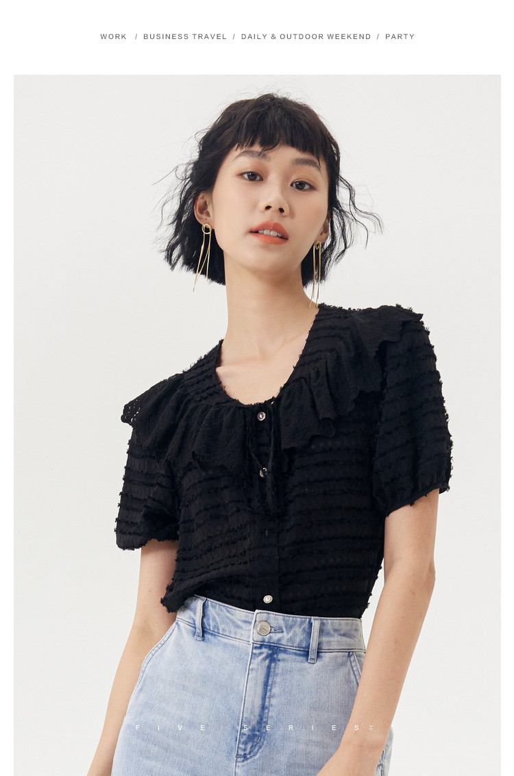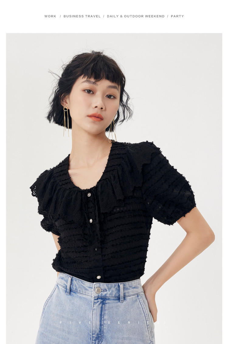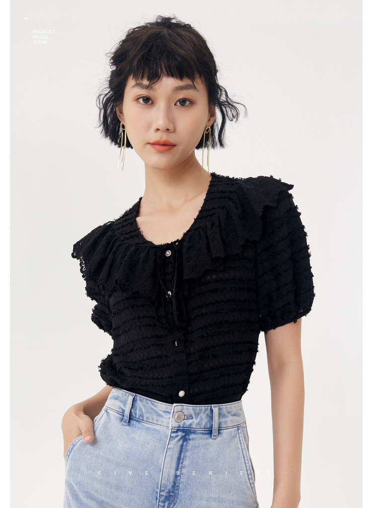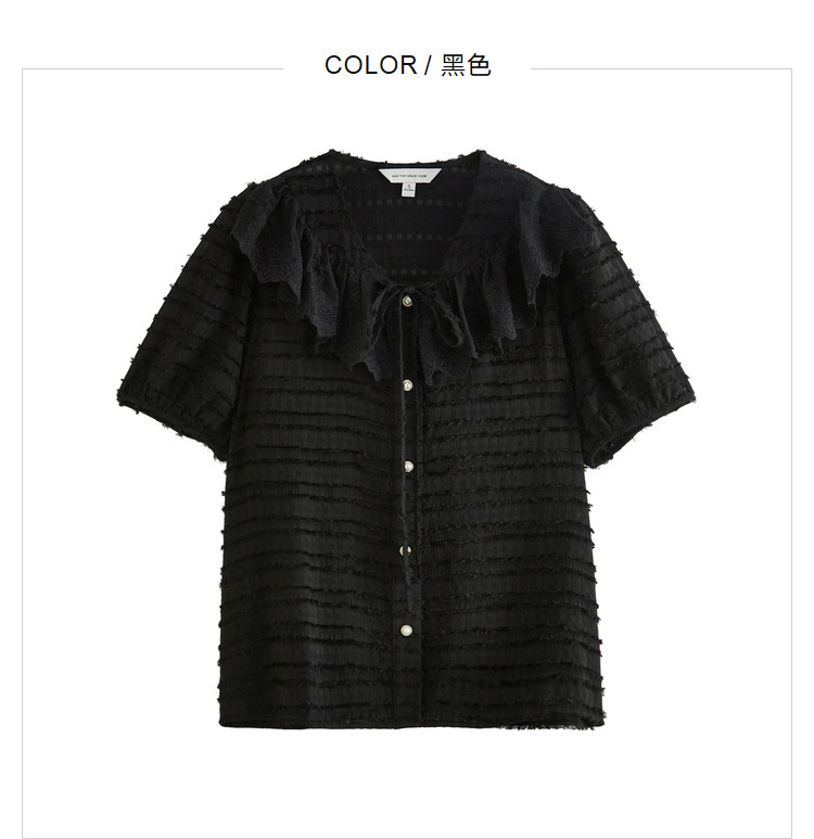商品名称:浪漫花边拼接衬衫女夏季款气质泡泡袖单排扣圆领上衣女短袖衬衣 681923