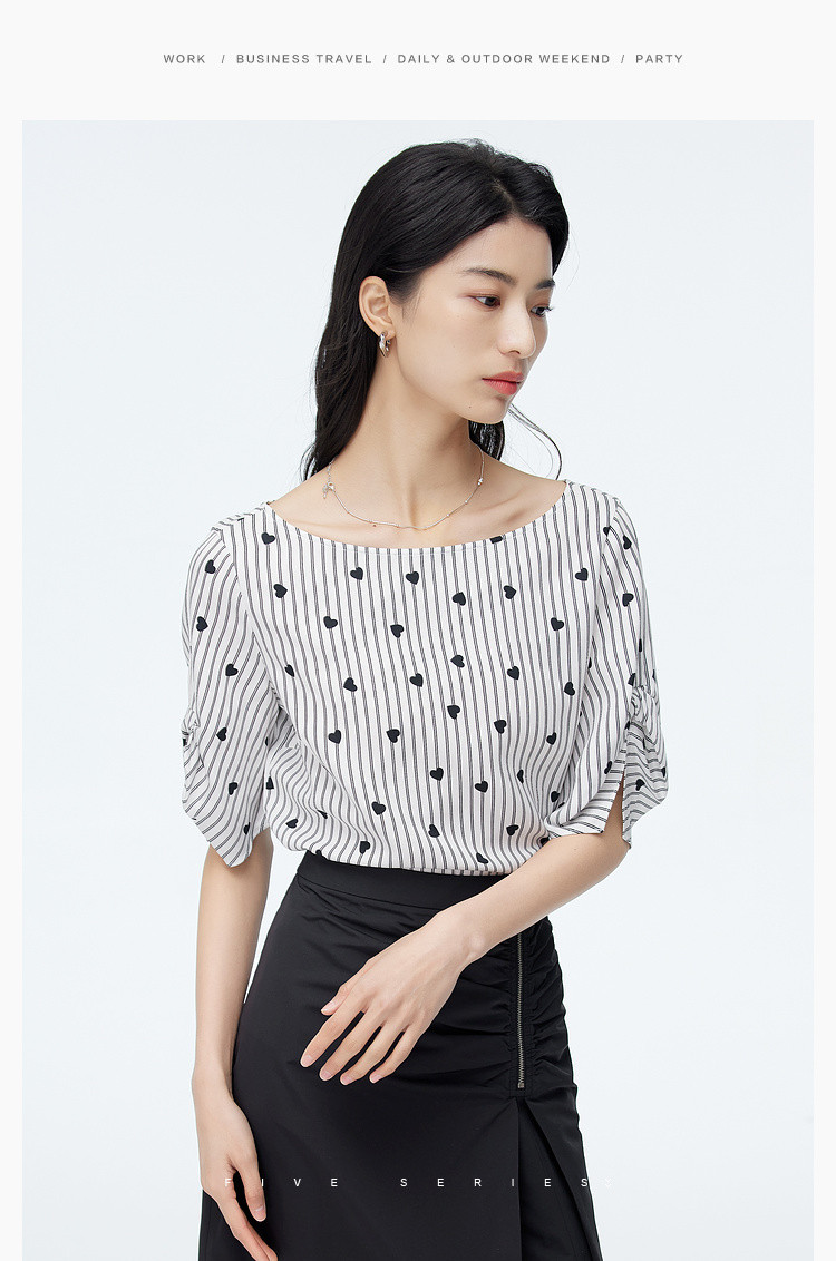 爱心印花短袖衬衫女夏季气质天丝圆领上衣通勤条纹衬衣女 497731