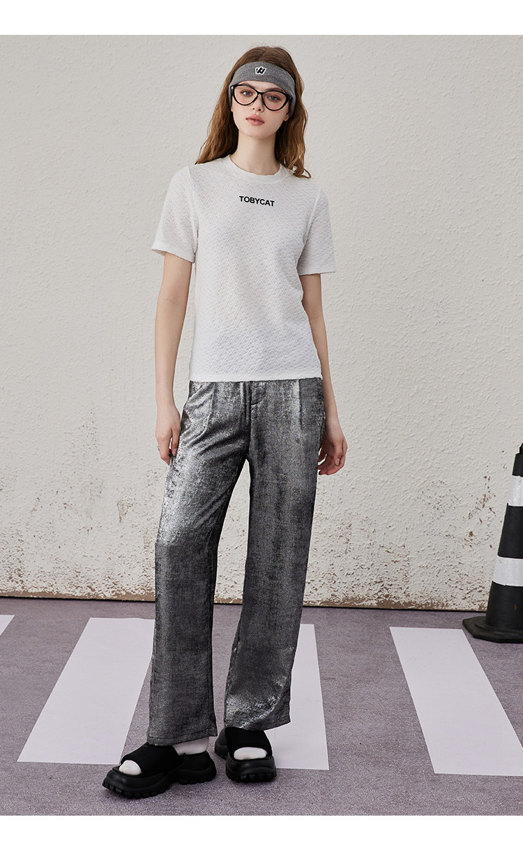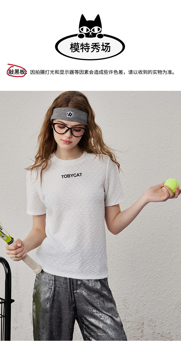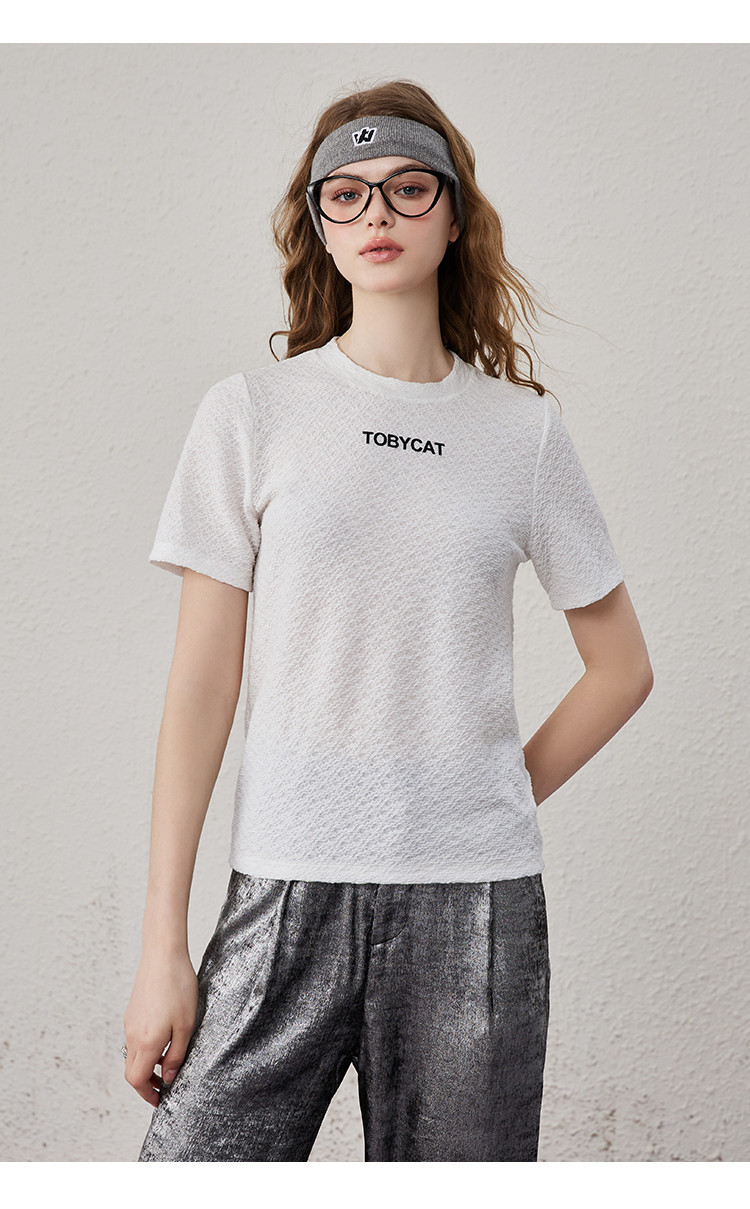 商品名称:纹理感弹性针织面料皮印印花正肩显瘦女式T恤夏季短袖 691357