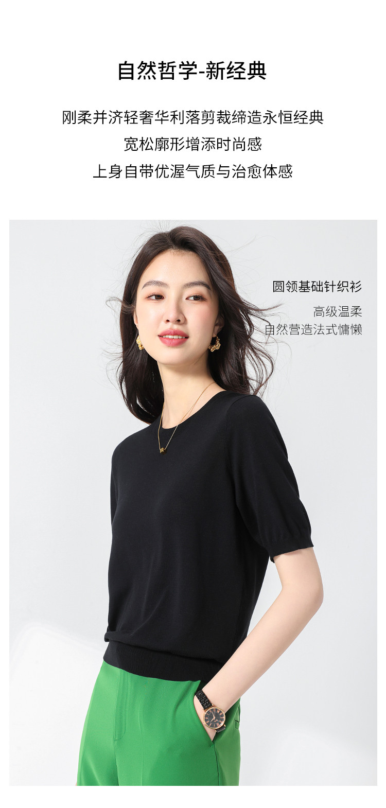 【含桑蚕丝】轻薄透气基础百搭纯色圆领针织打底衫短袖T恤女夏 399763