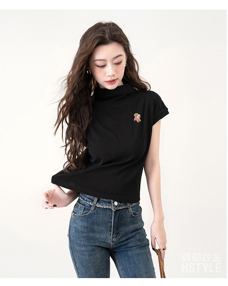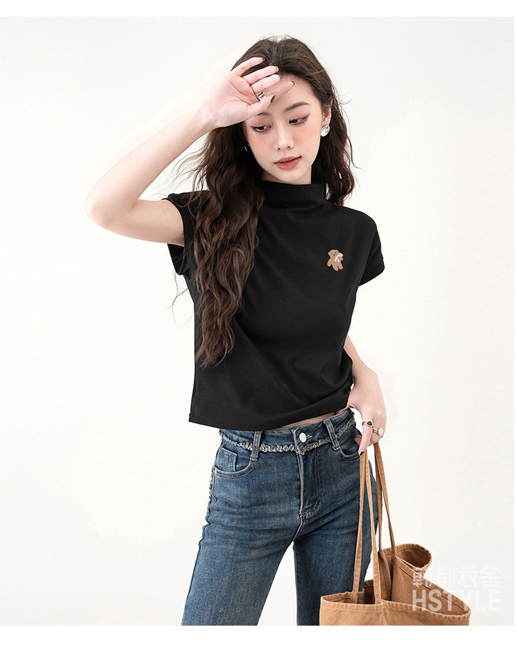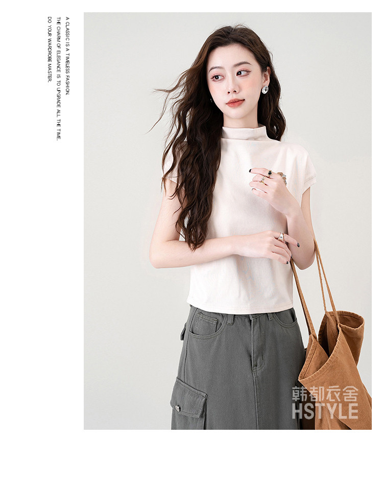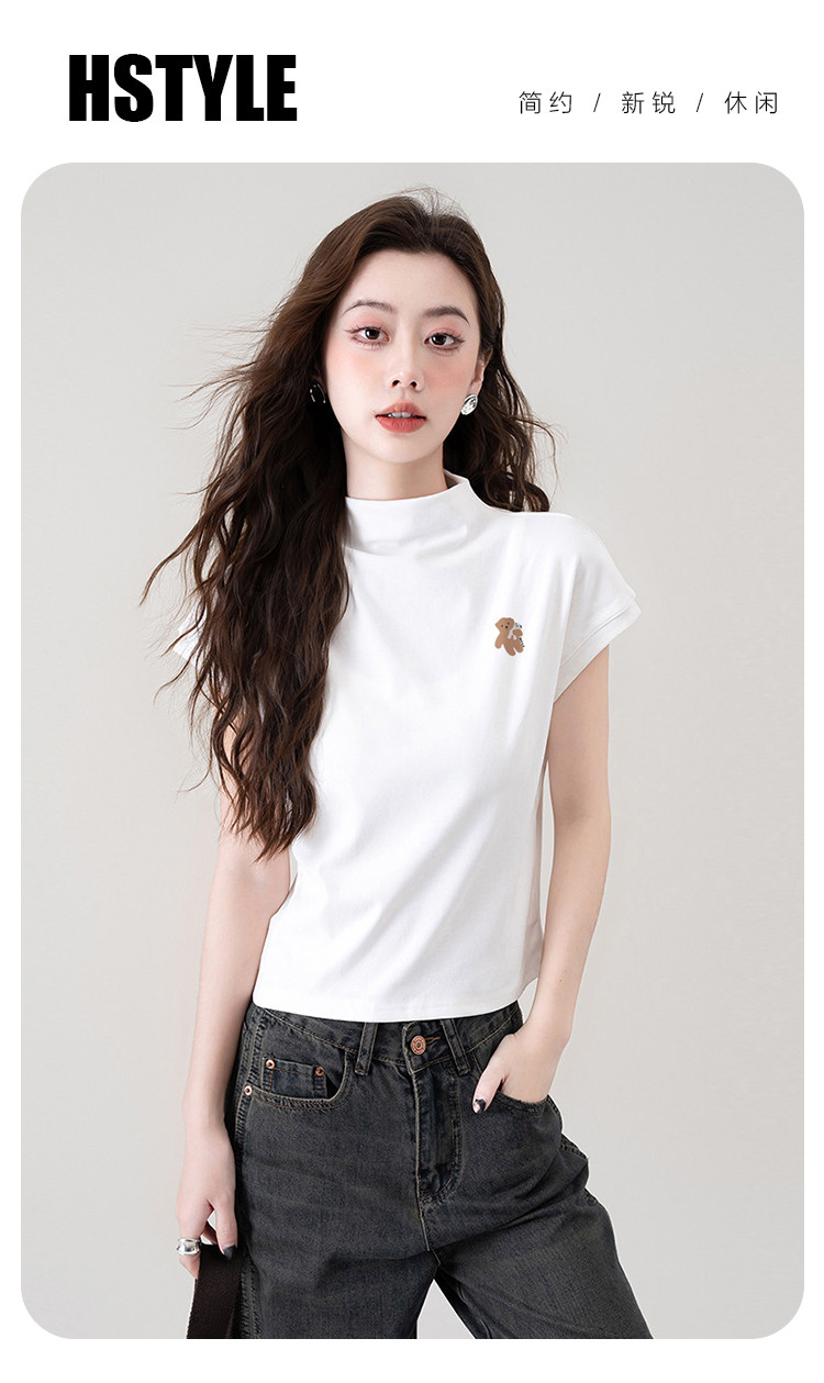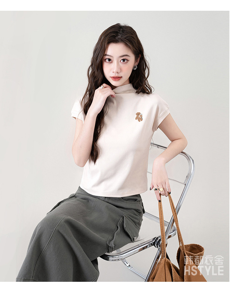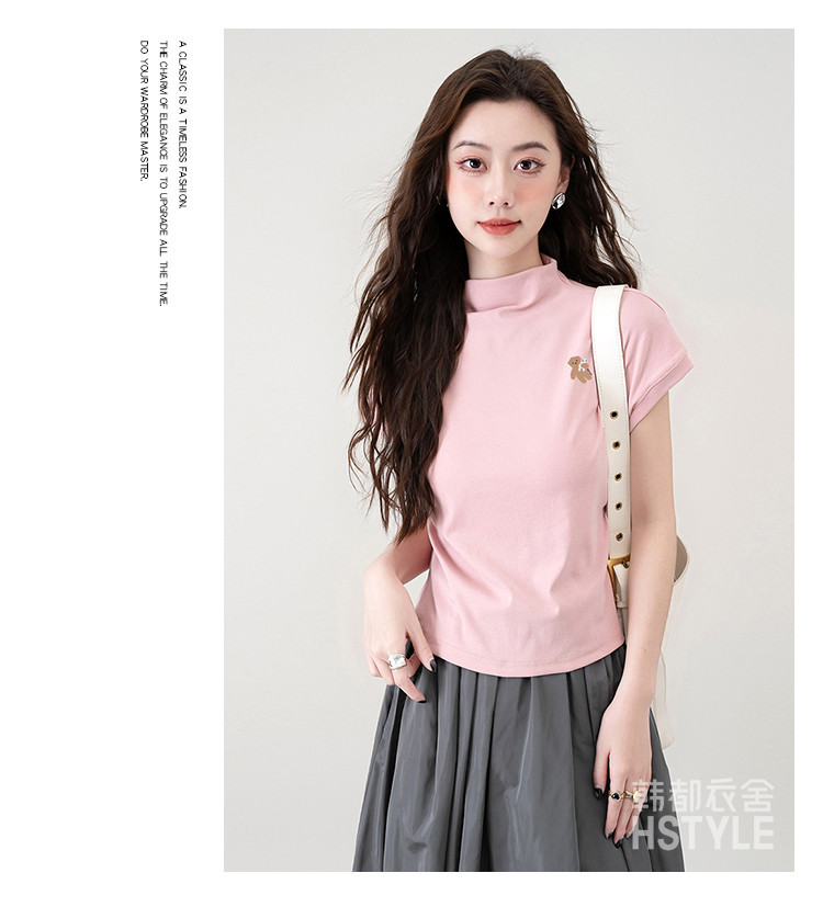 半高领小飞袖上衣印花舒适内搭春季款女式T恤休闲时尚 880075