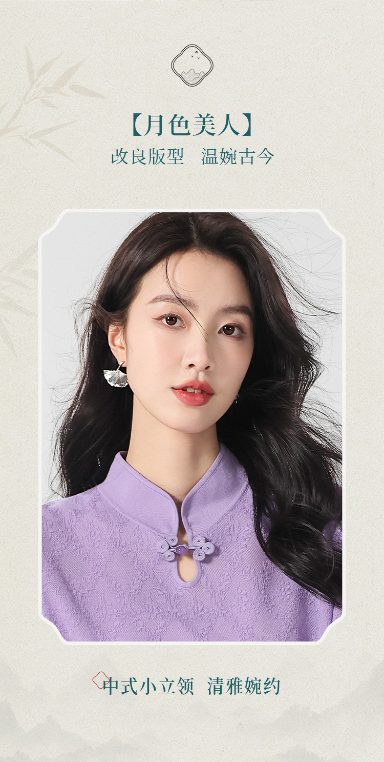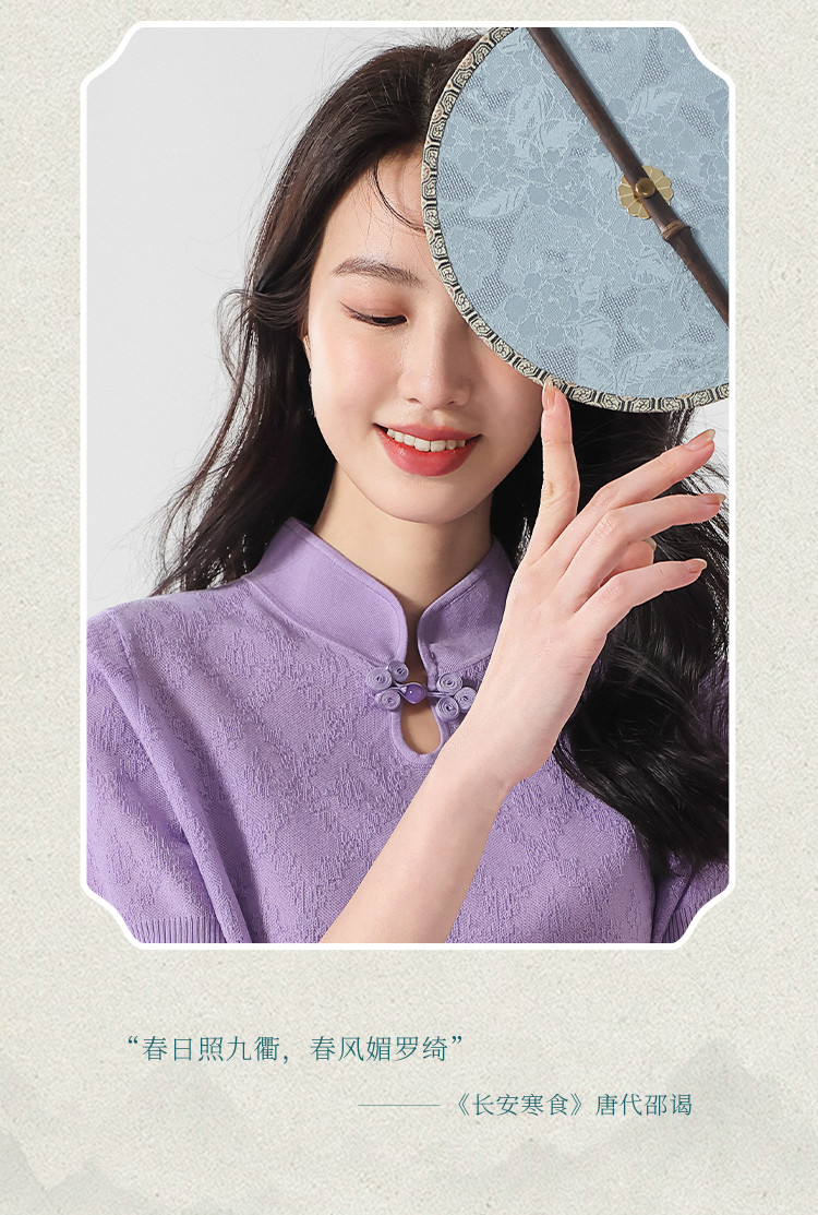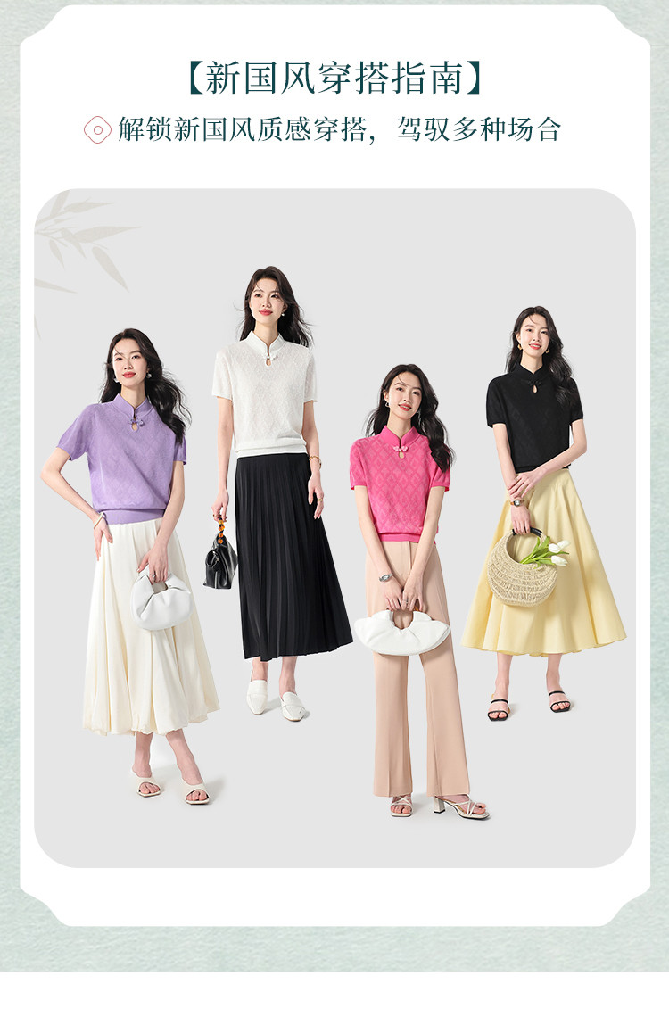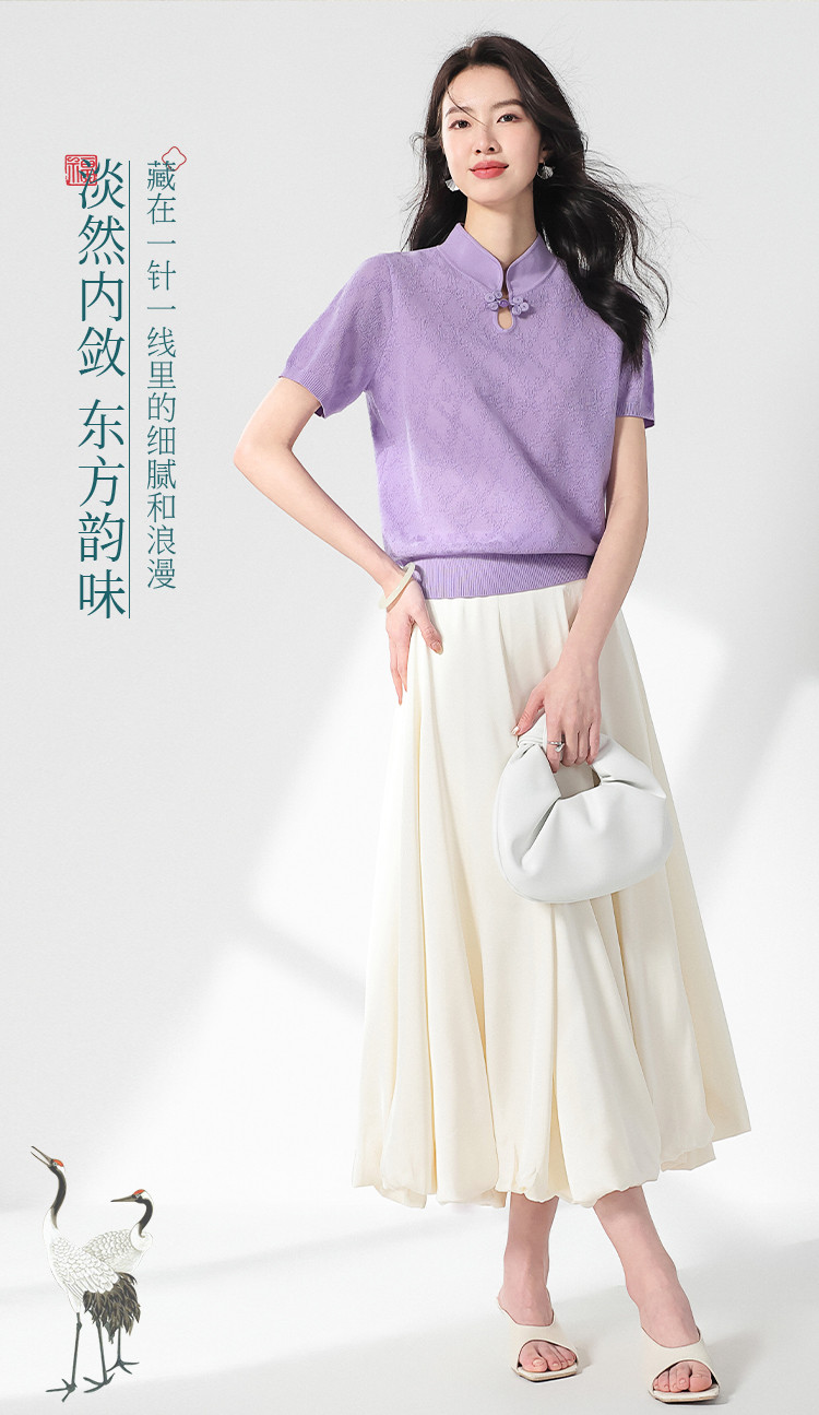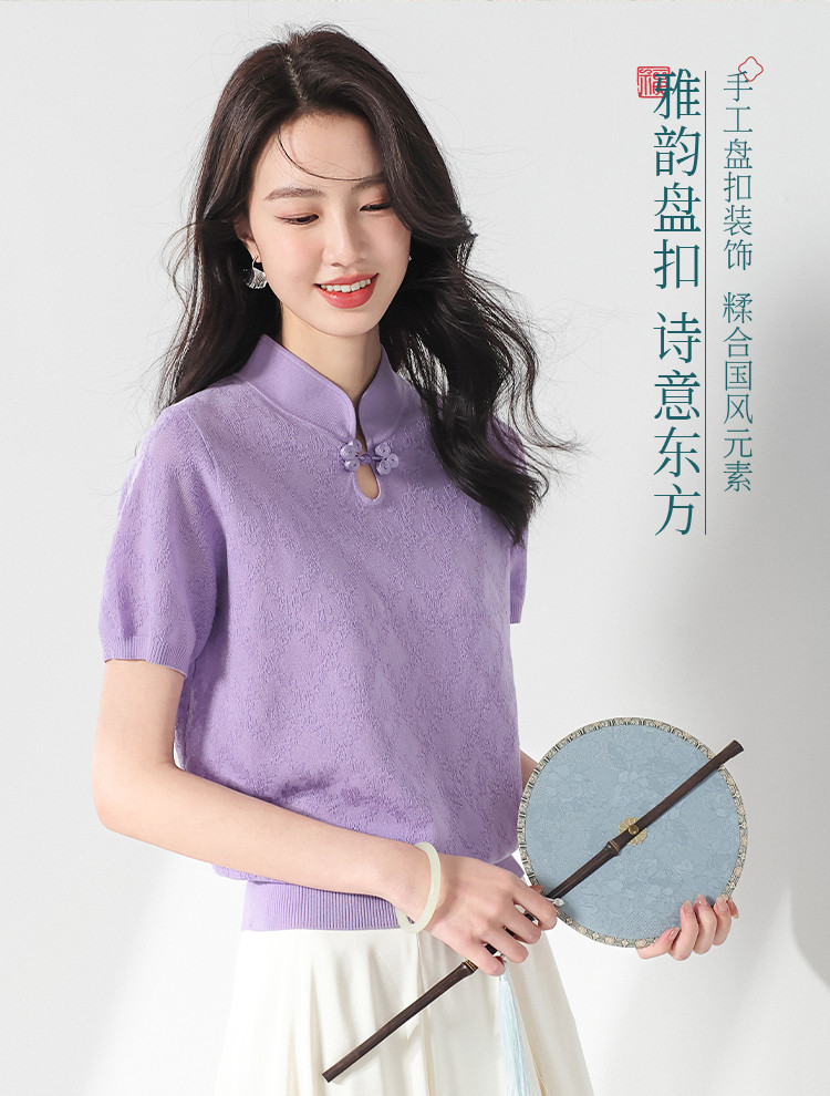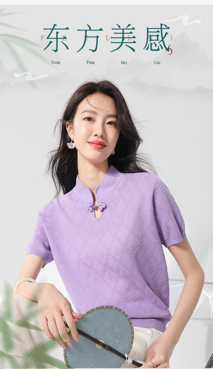 国风~轻薄透气含桑蚕丝立领打底衫短袖T恤针织衫女夏妈妈装上衣 166291