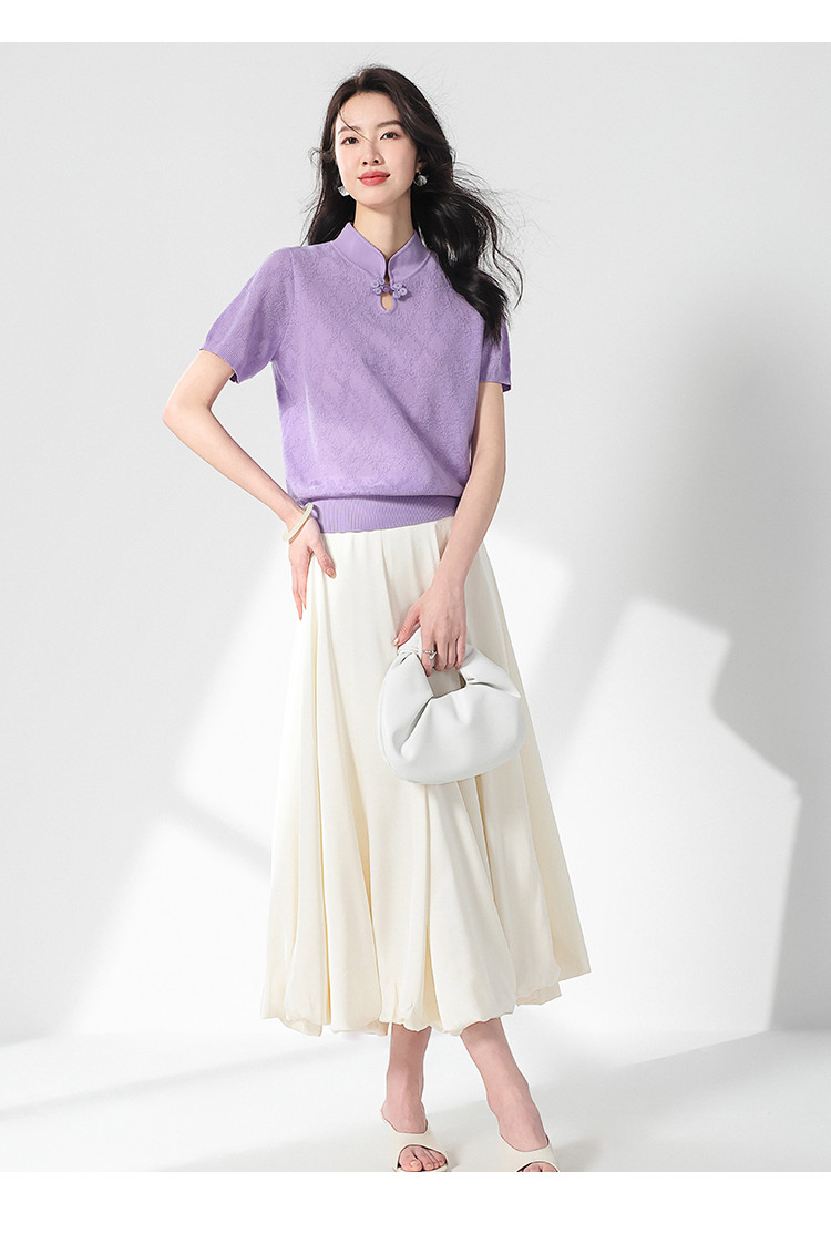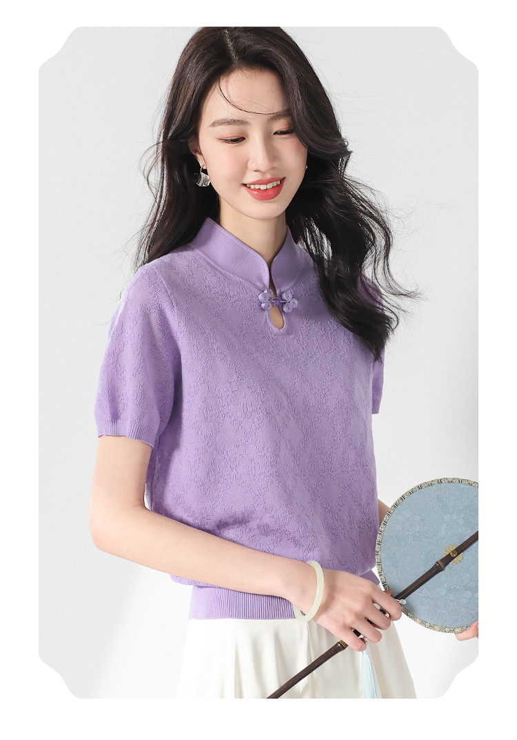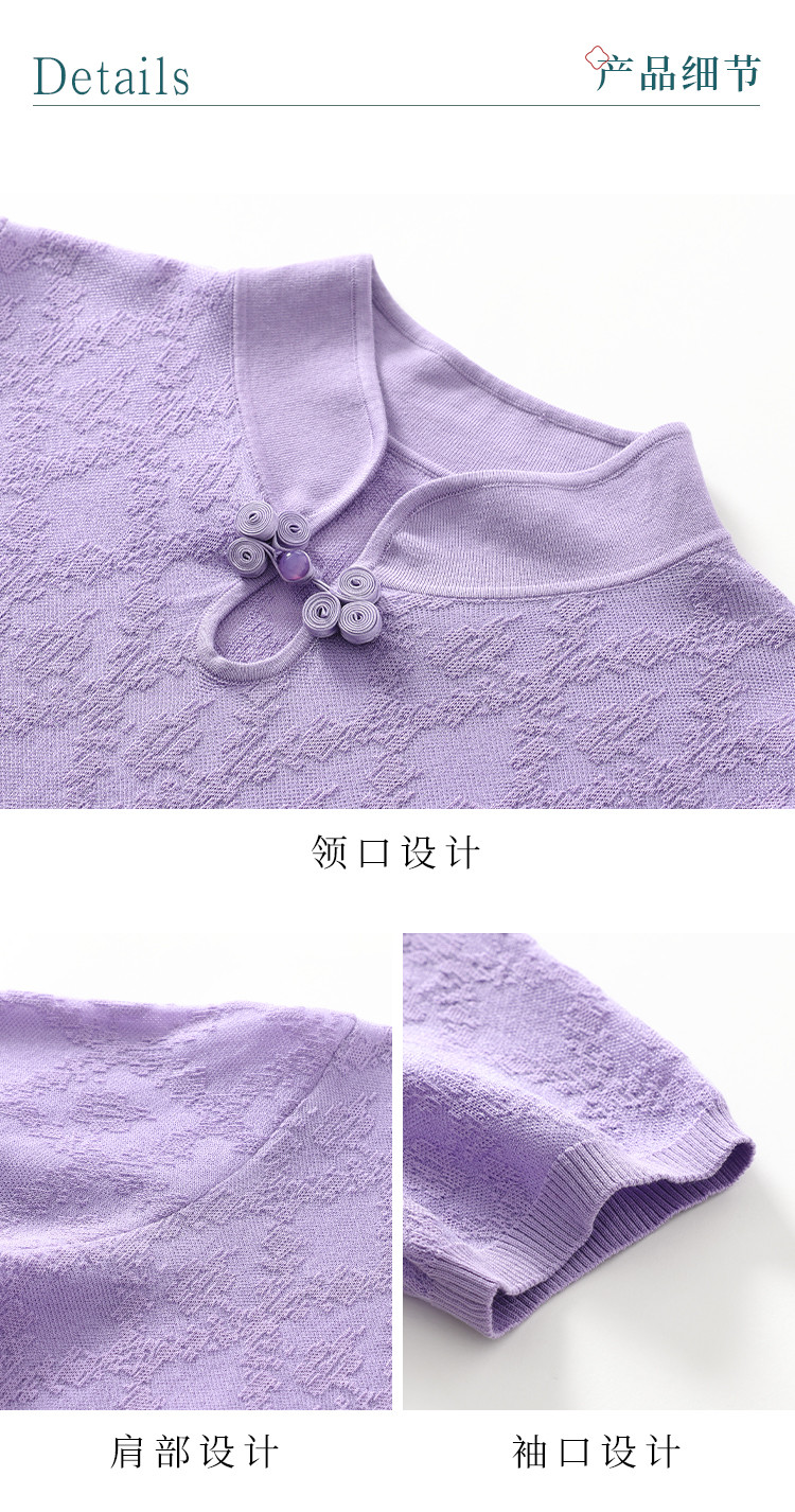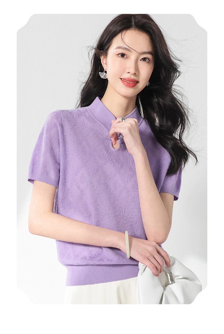 商品名称:国风~轻薄透气含桑蚕丝立领打底衫短袖T恤针织衫女夏妈妈装上衣 166291