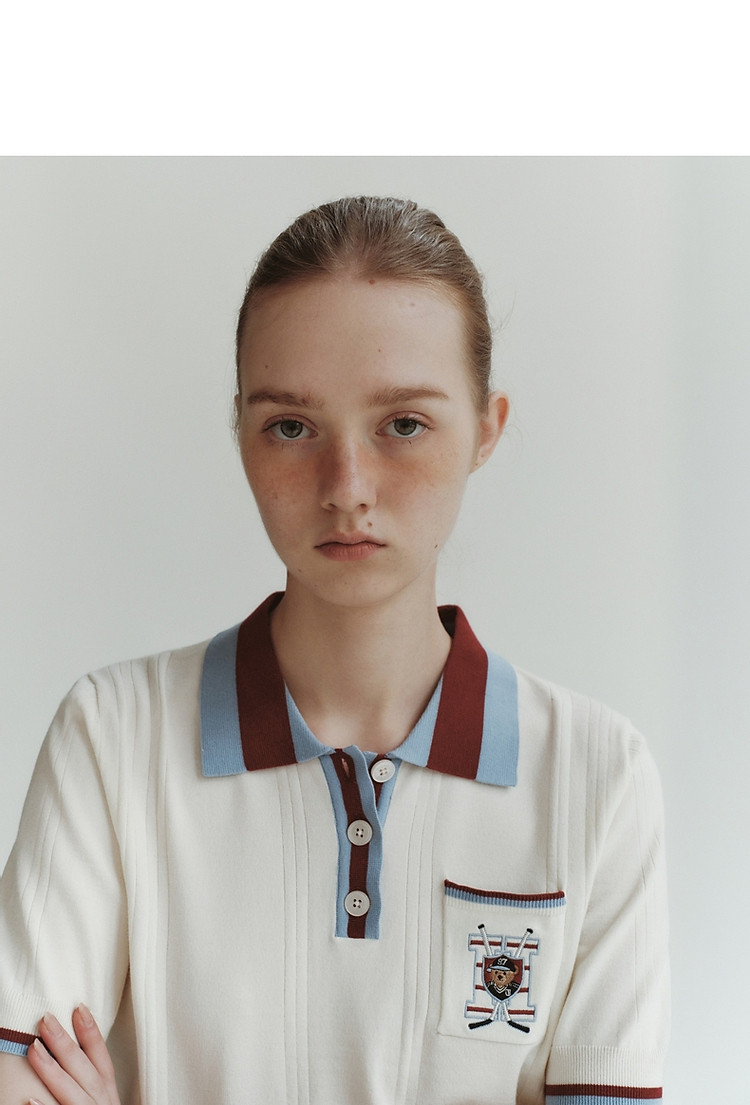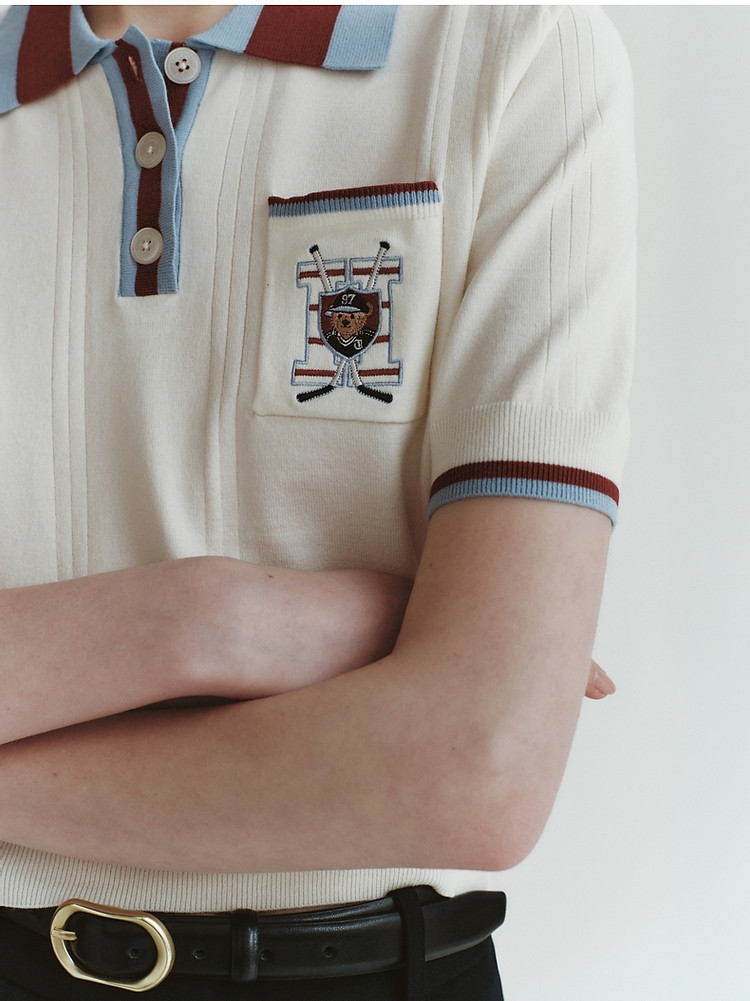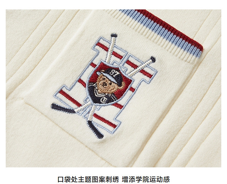 小熊气质学院风撞色Polo领短袖针织衫包芯纱毛衣 324225