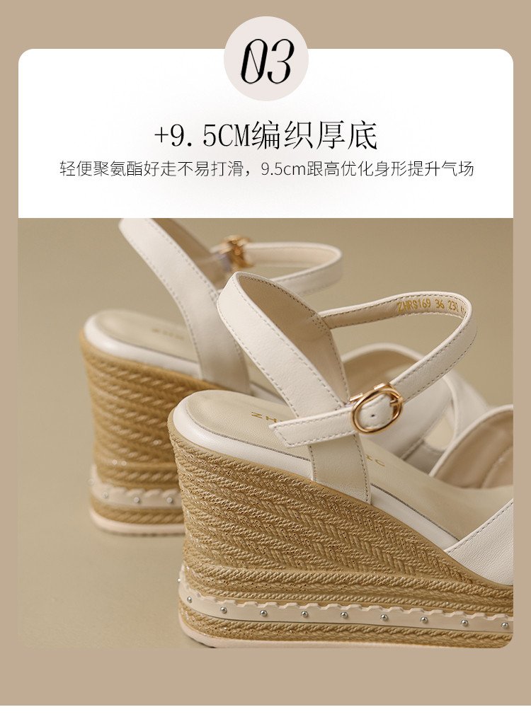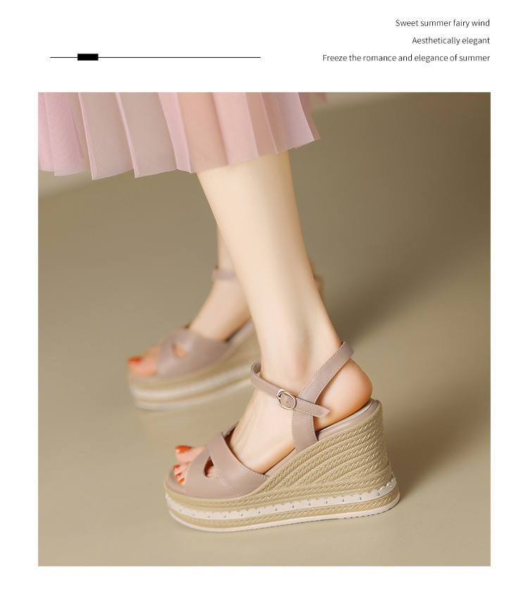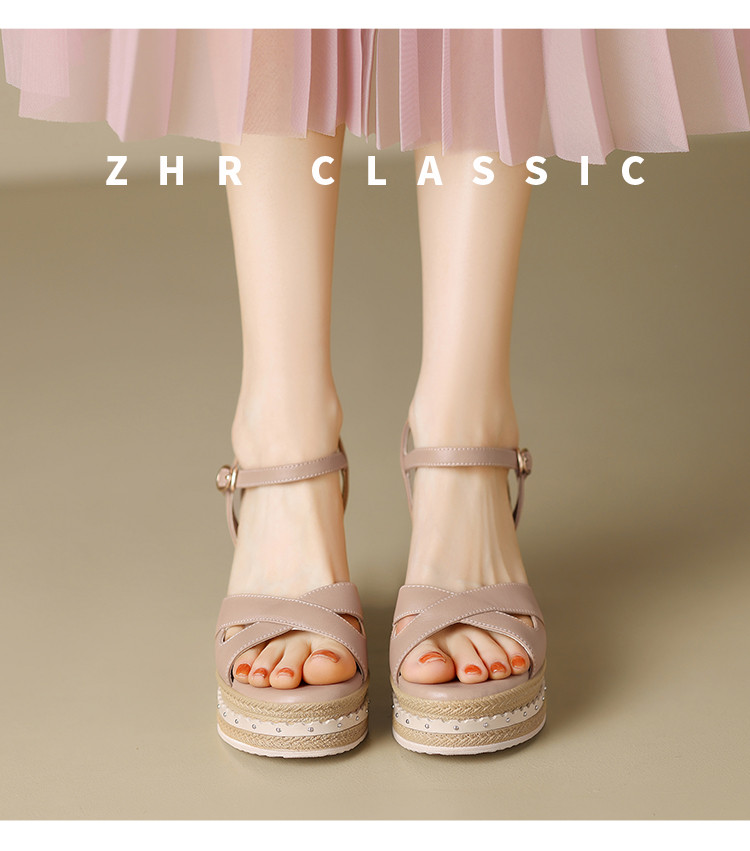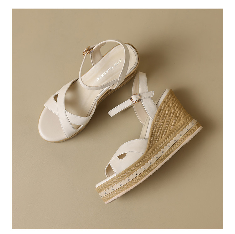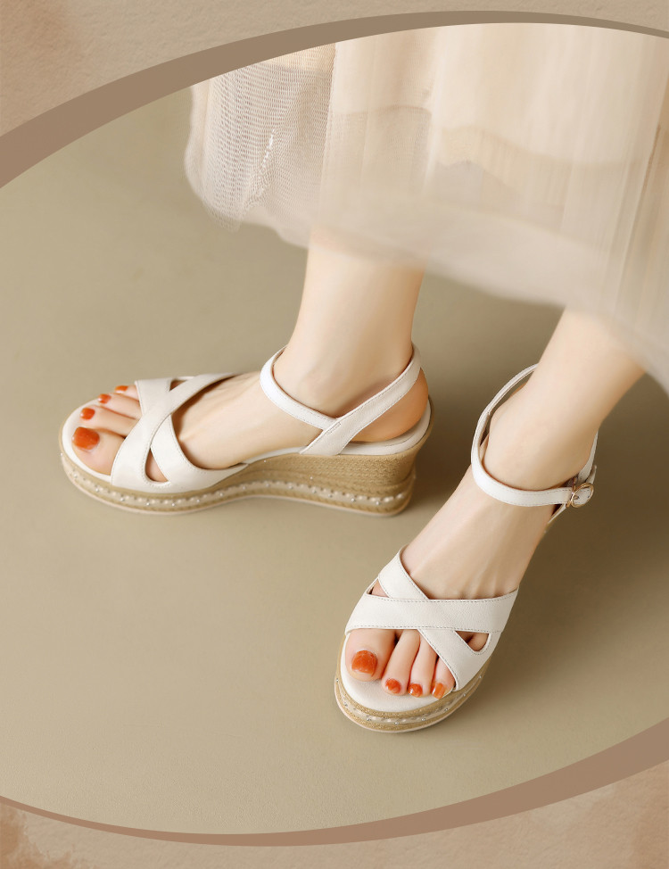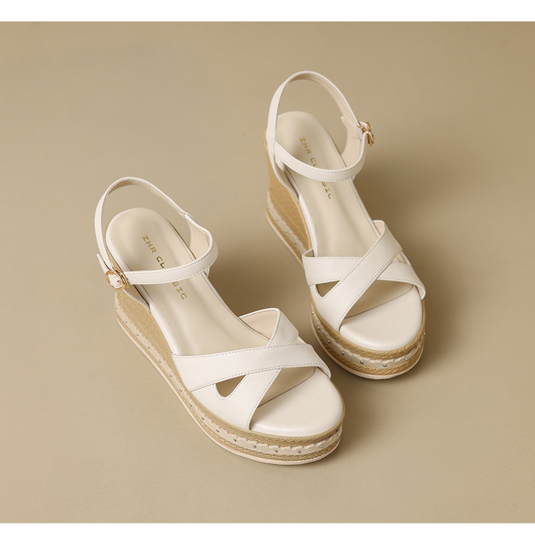 【头层牛皮】交叉束带坡跟女凉鞋一字带凉鞋女百搭小个子高跟凉鞋 562880