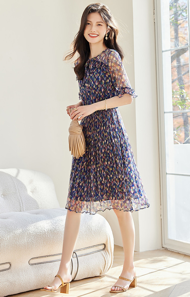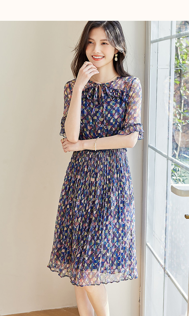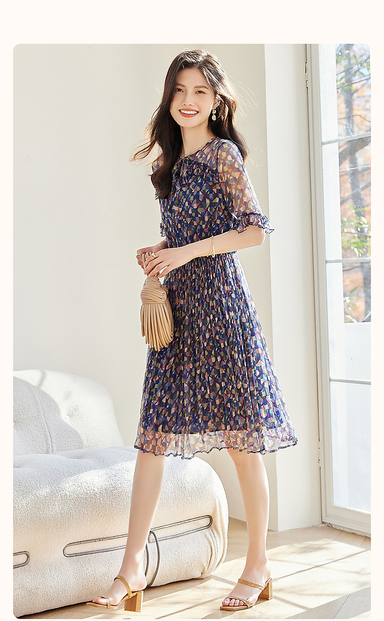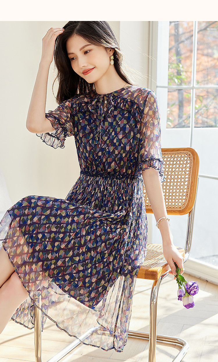 【浣溪沙】夏季千金风桑蚕丝真丝荷叶边松紧腰遮肉连衣裙女 458177