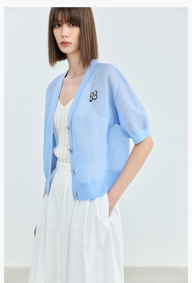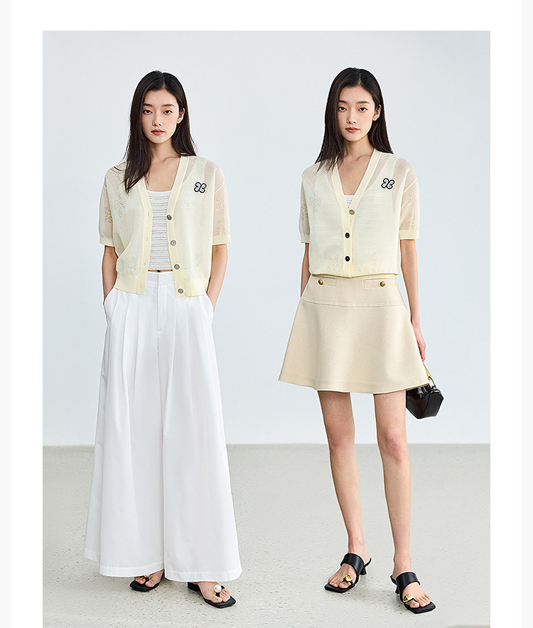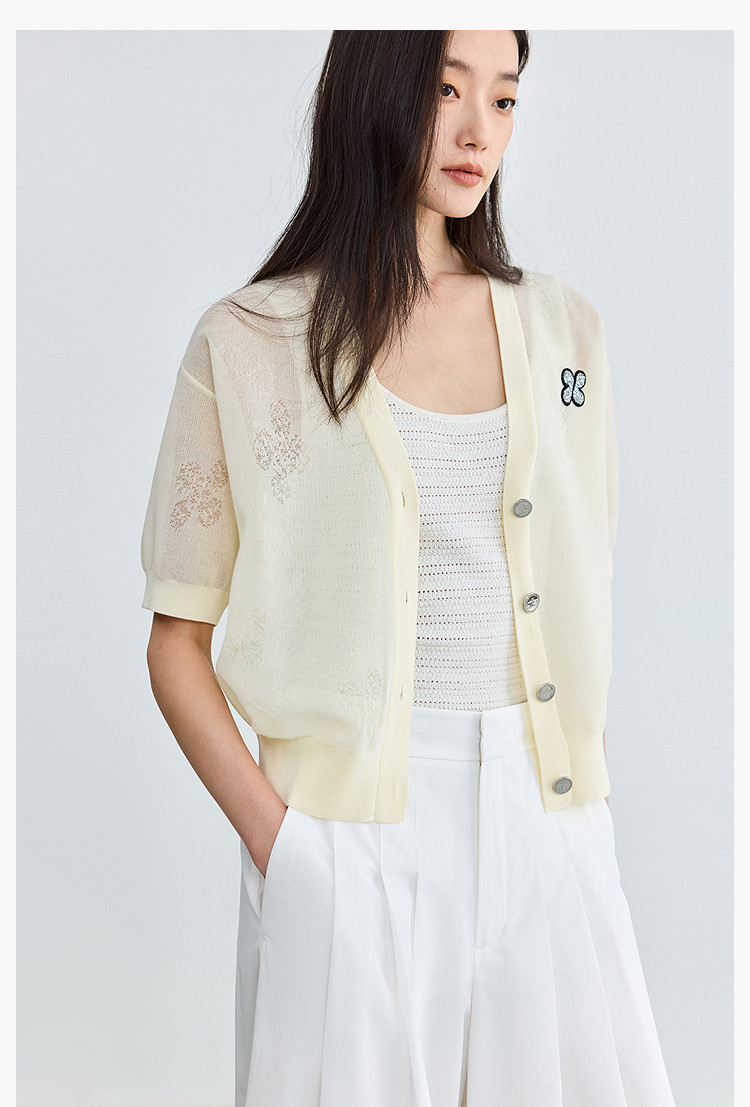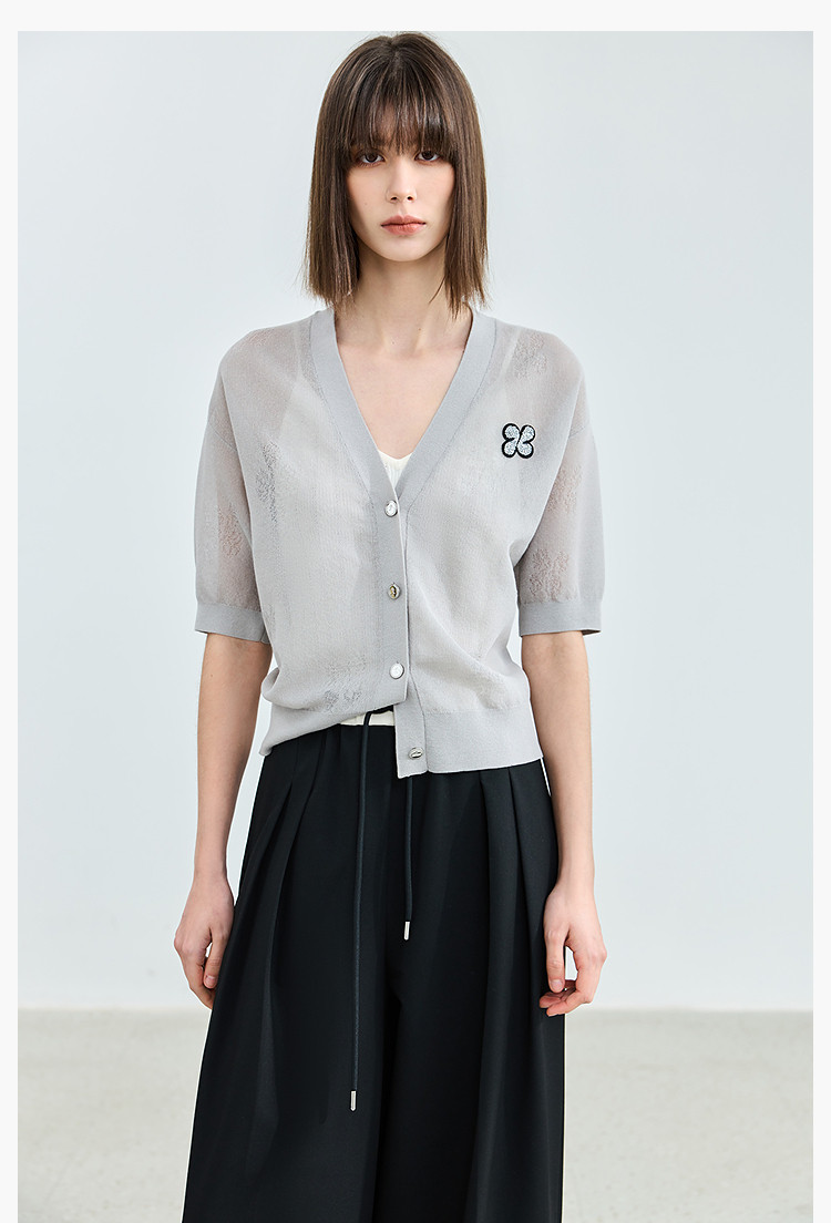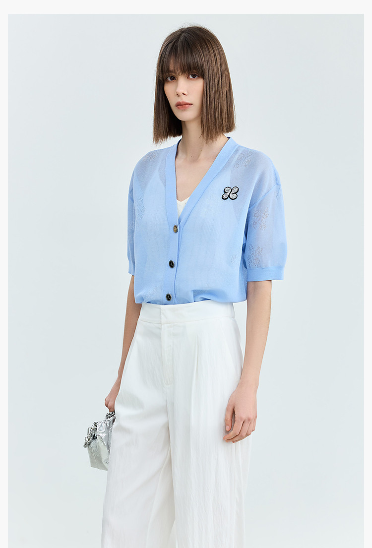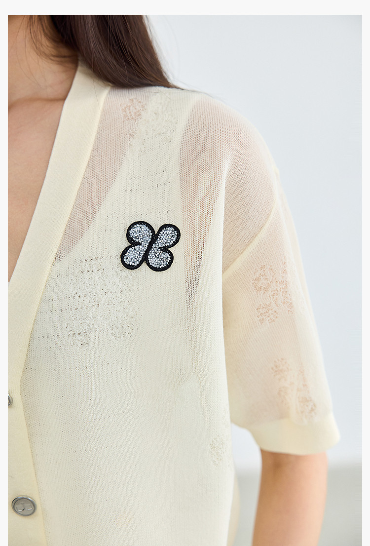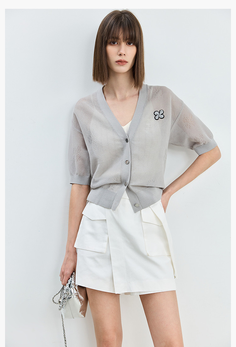 商品名称:【春季】毛针织衫短袖设计感四叶草印花V领针织衫女上衣 678107