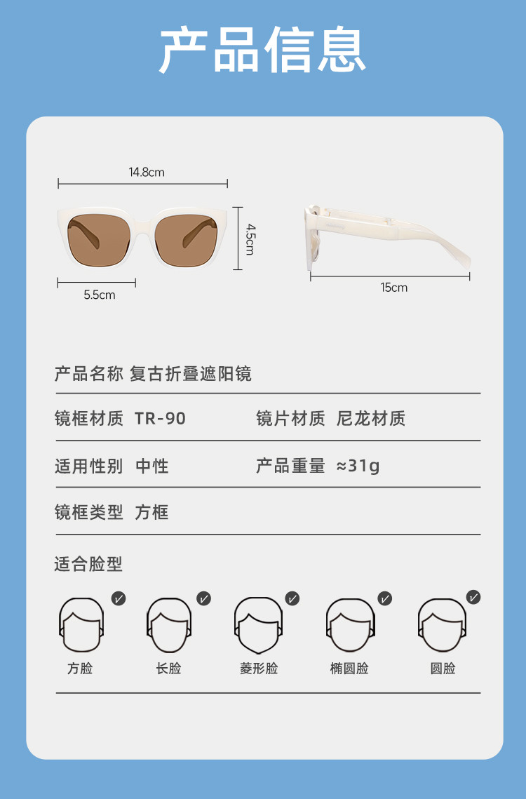 商品名称:复古可折叠轻盈开车防紫外线防晒显瘦遮阳镜 451021