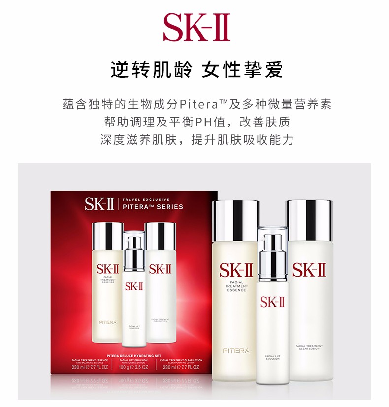 商品名称:SK-II 多方位PITERA保湿修护套组清莹露230ml+神仙水230ml+乳液100ml 免税版