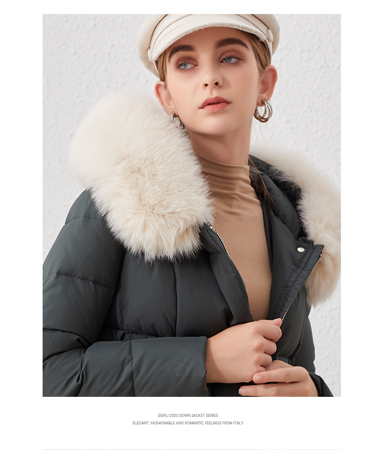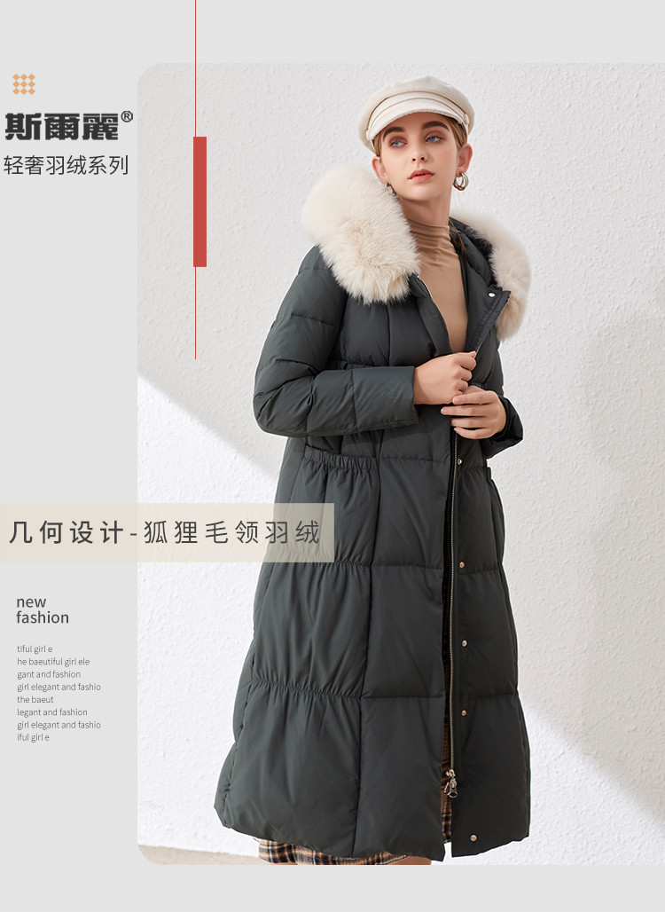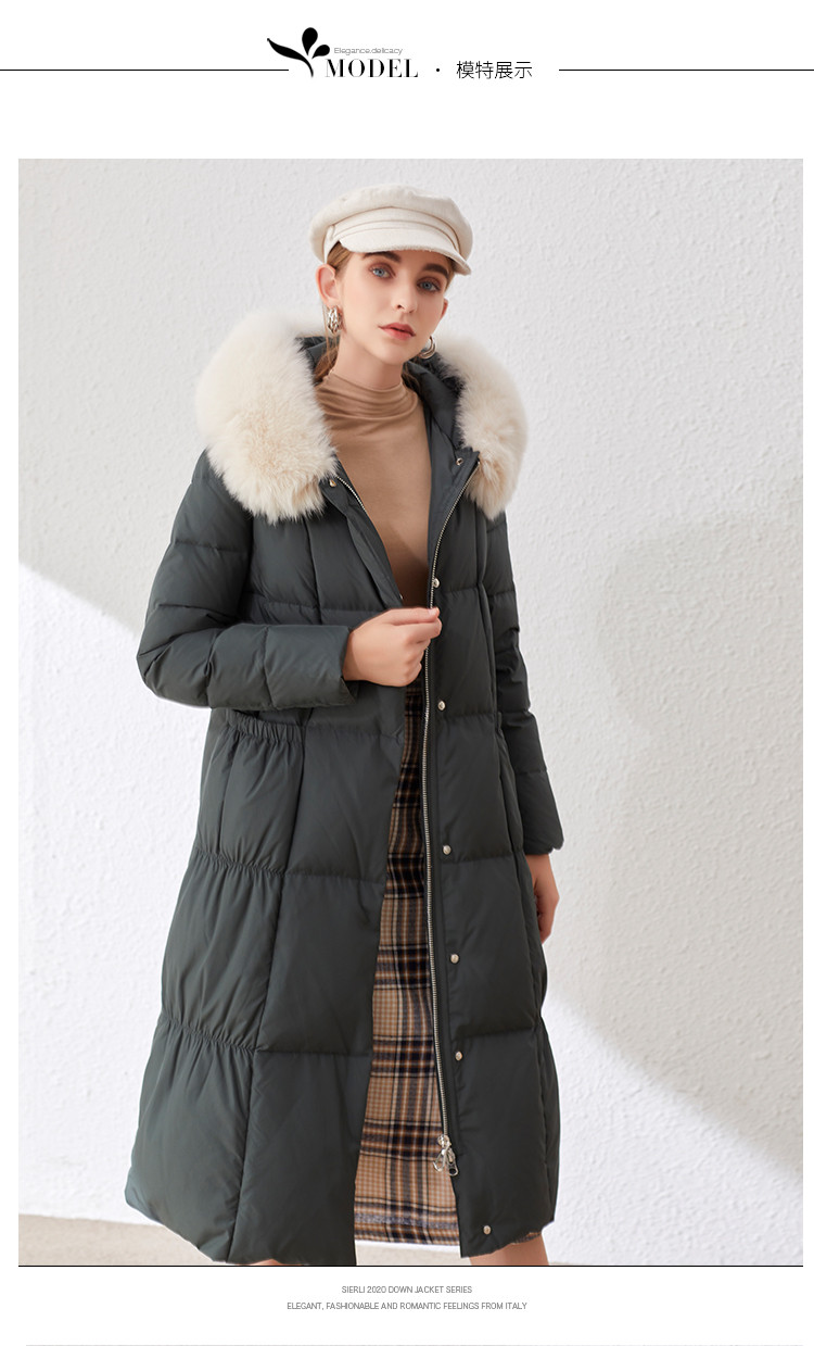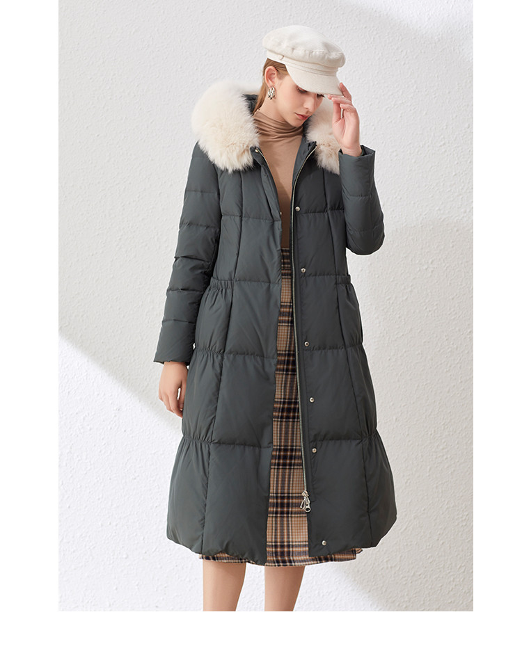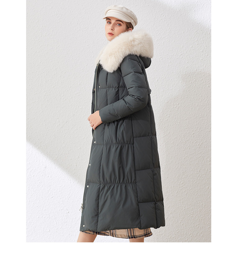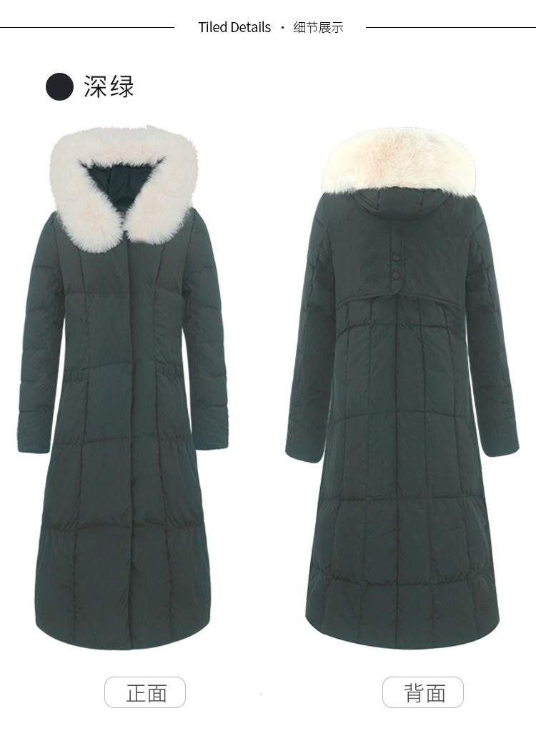 【好物推荐】都市休闲风天然大毛领连帽厚款竖切格长款女式羽绒服 516319
