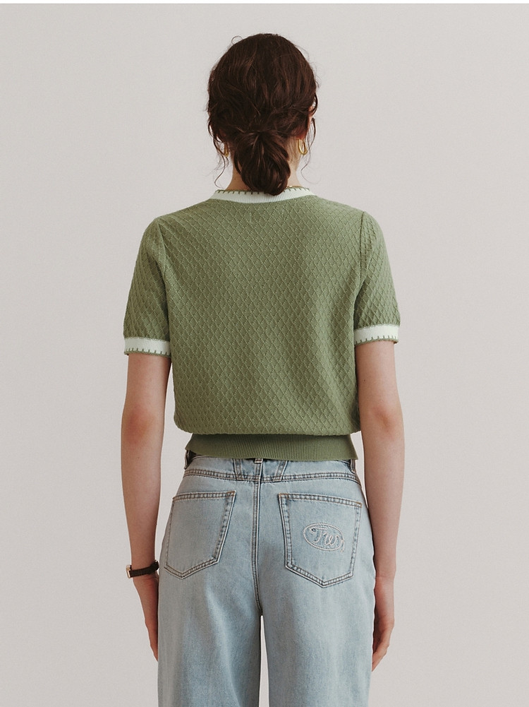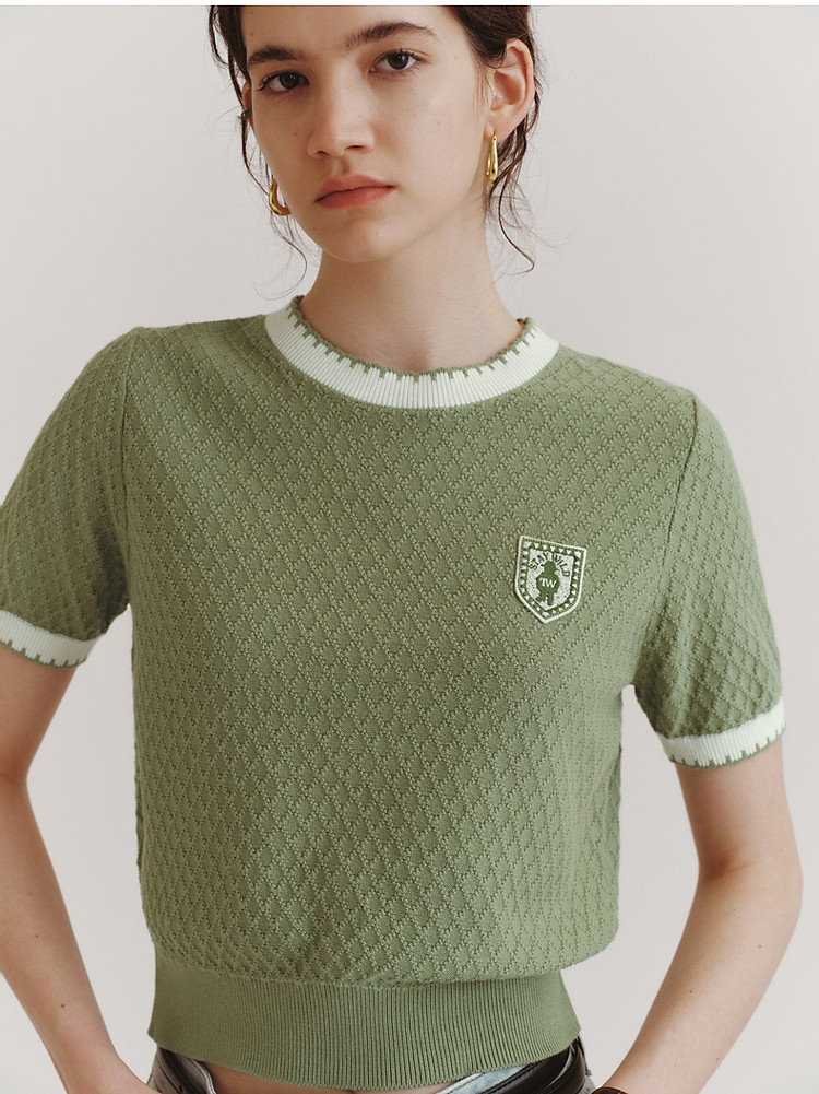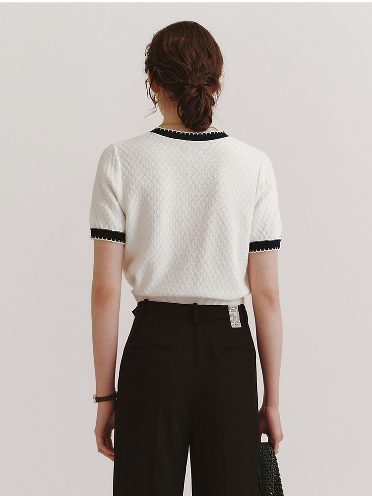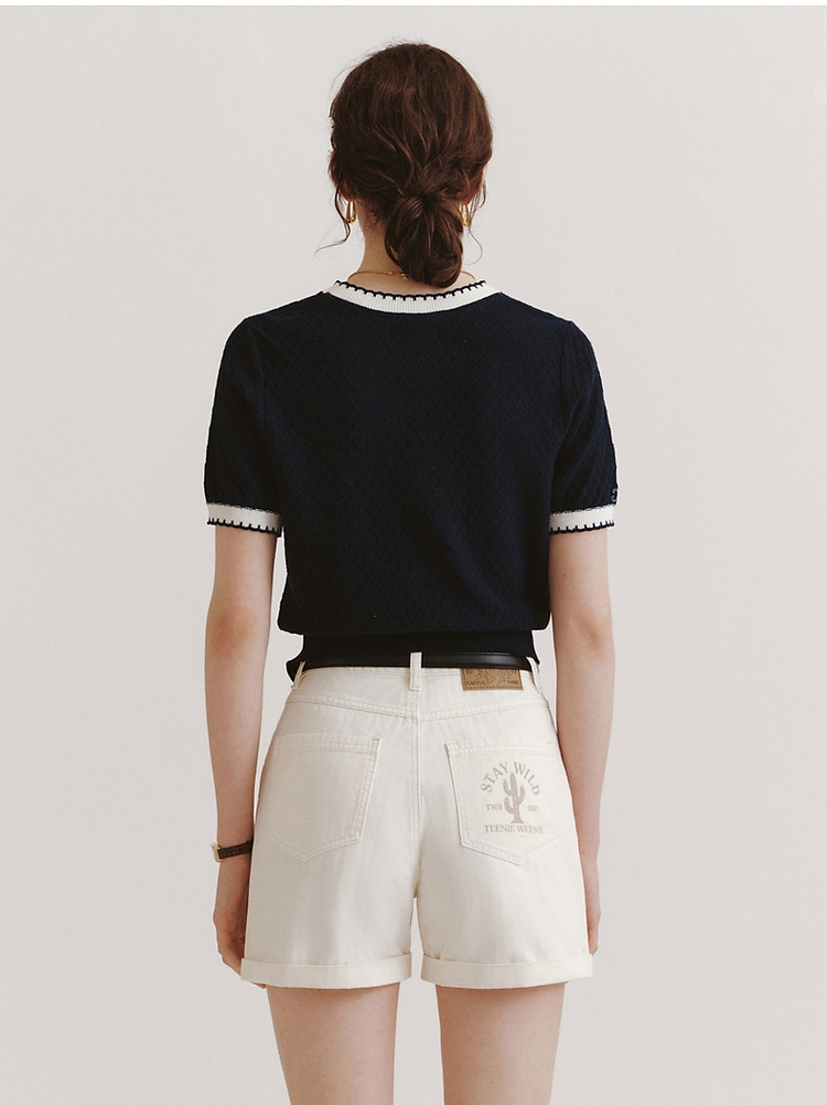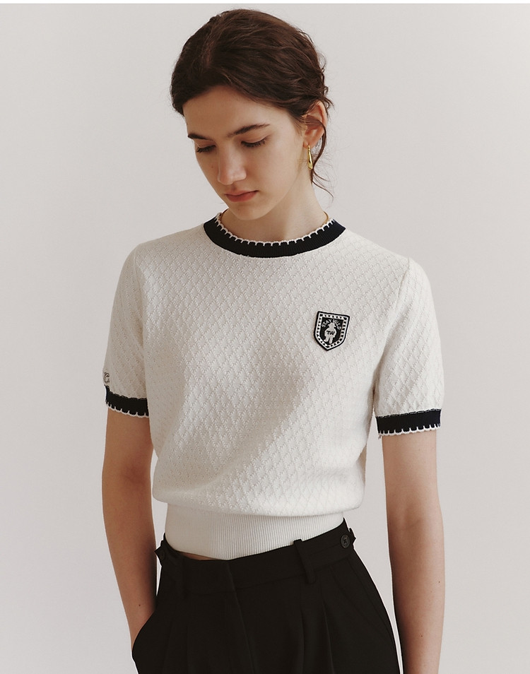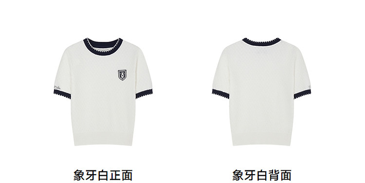 毛衣小熊款夏装撞色肌理感月牙勾边圆领短袖毛衣女装 353793