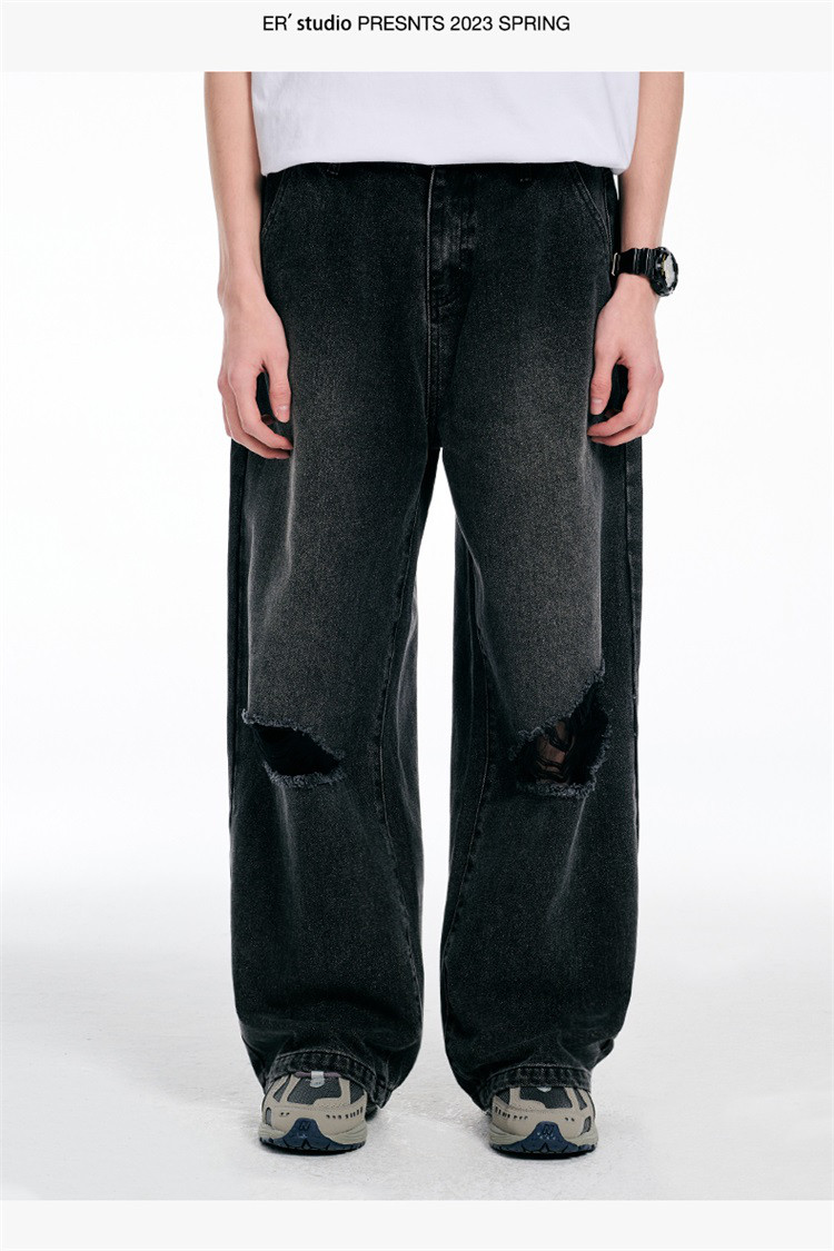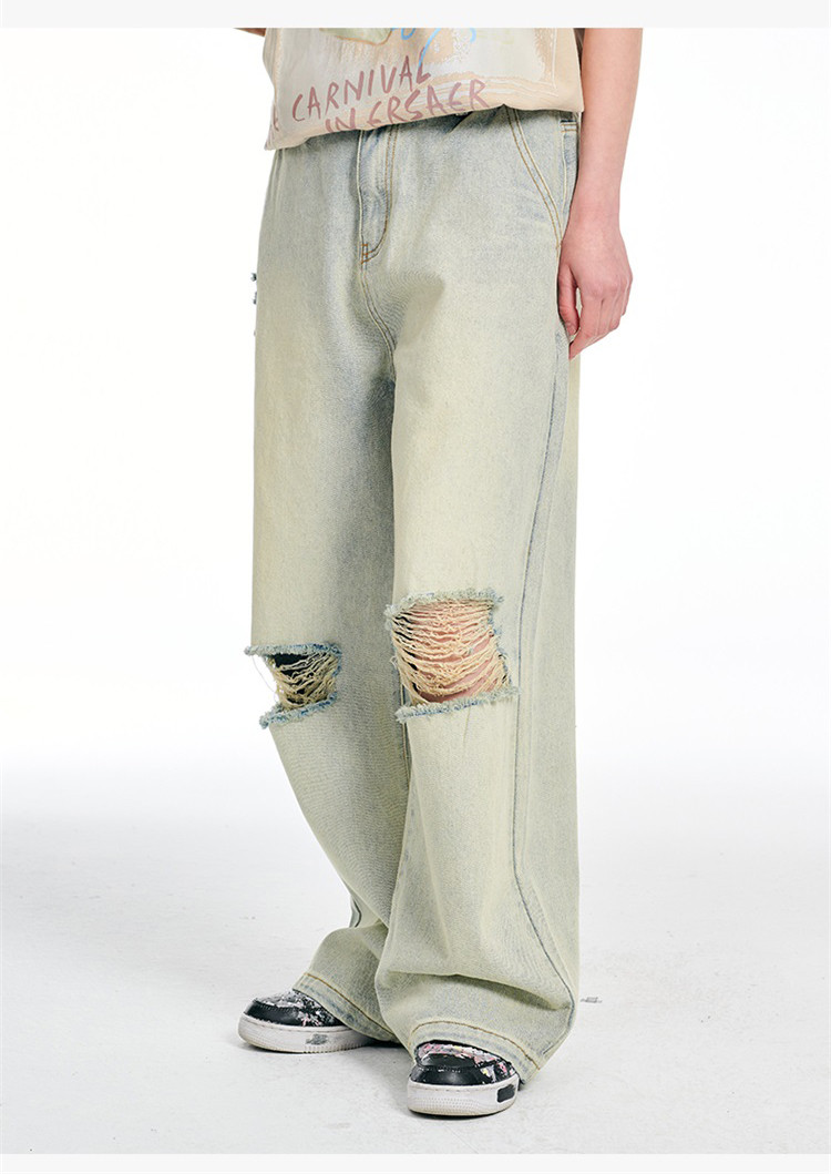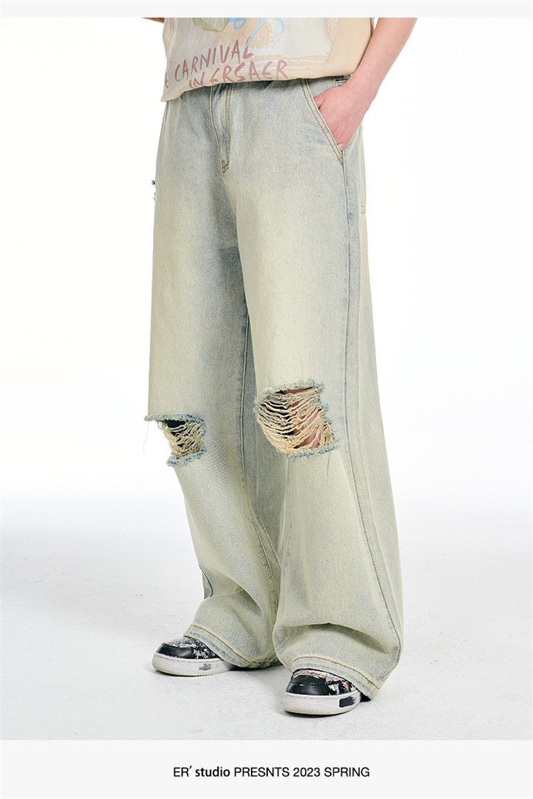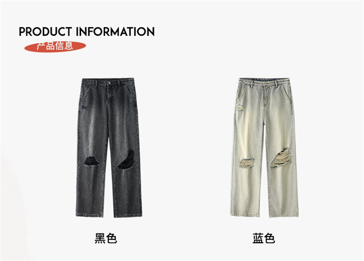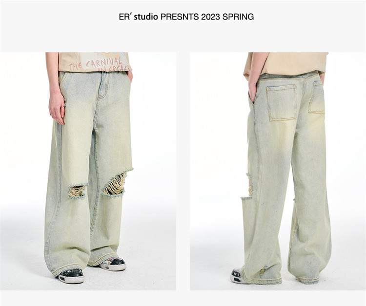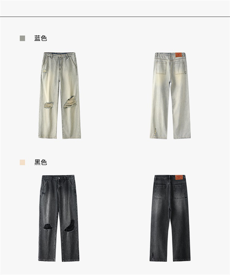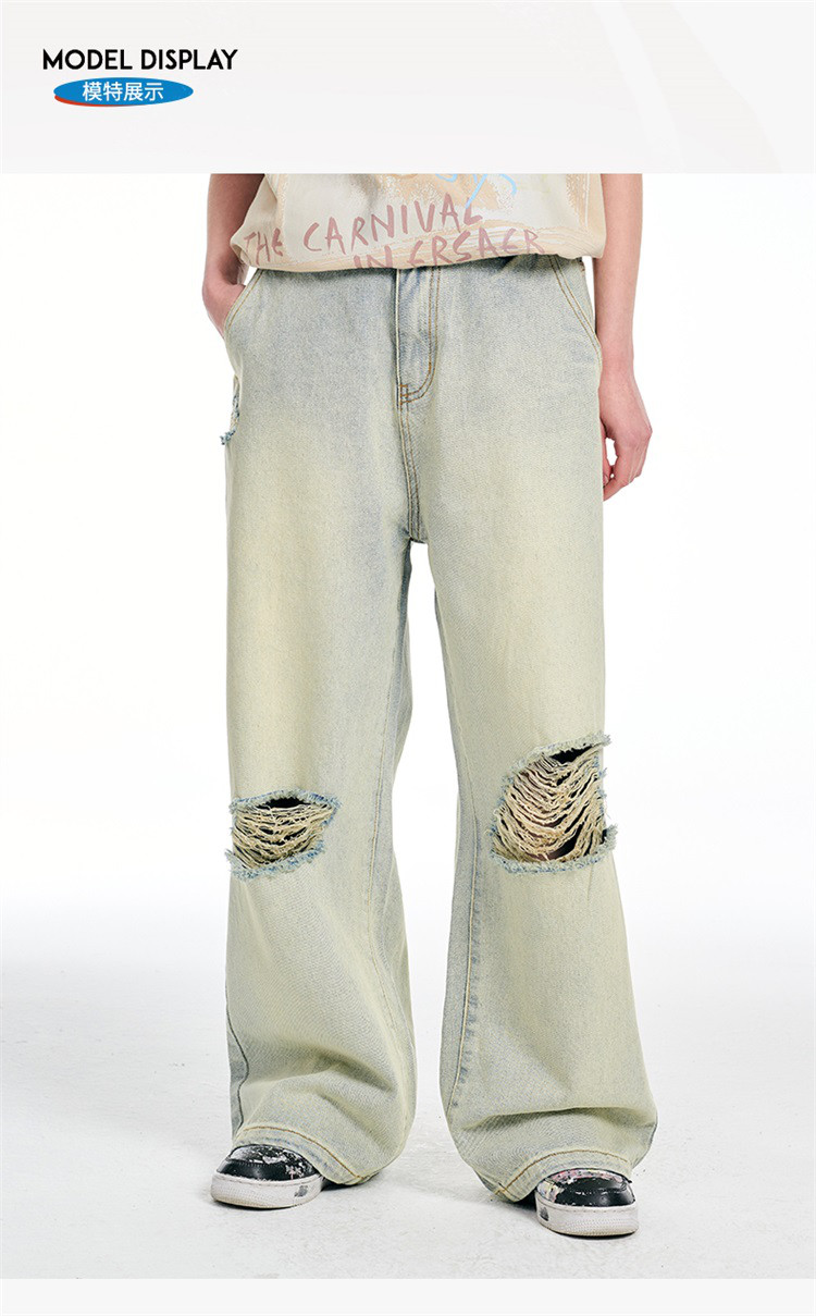 商品名称:复古破洞黄泥牛仔裤夏薄款潮牌直筒宽松美式高街阔腿长裤男女同款 353047
