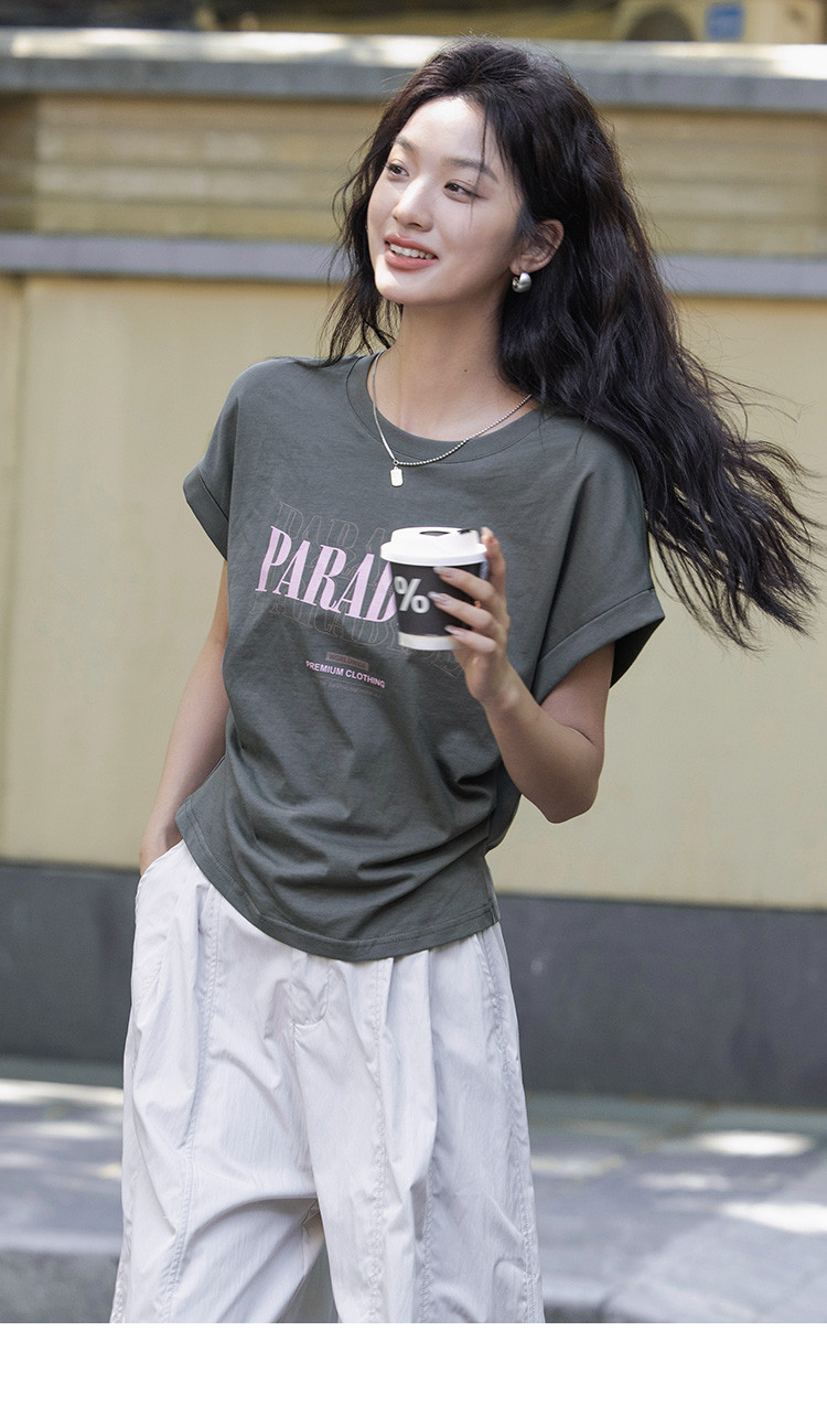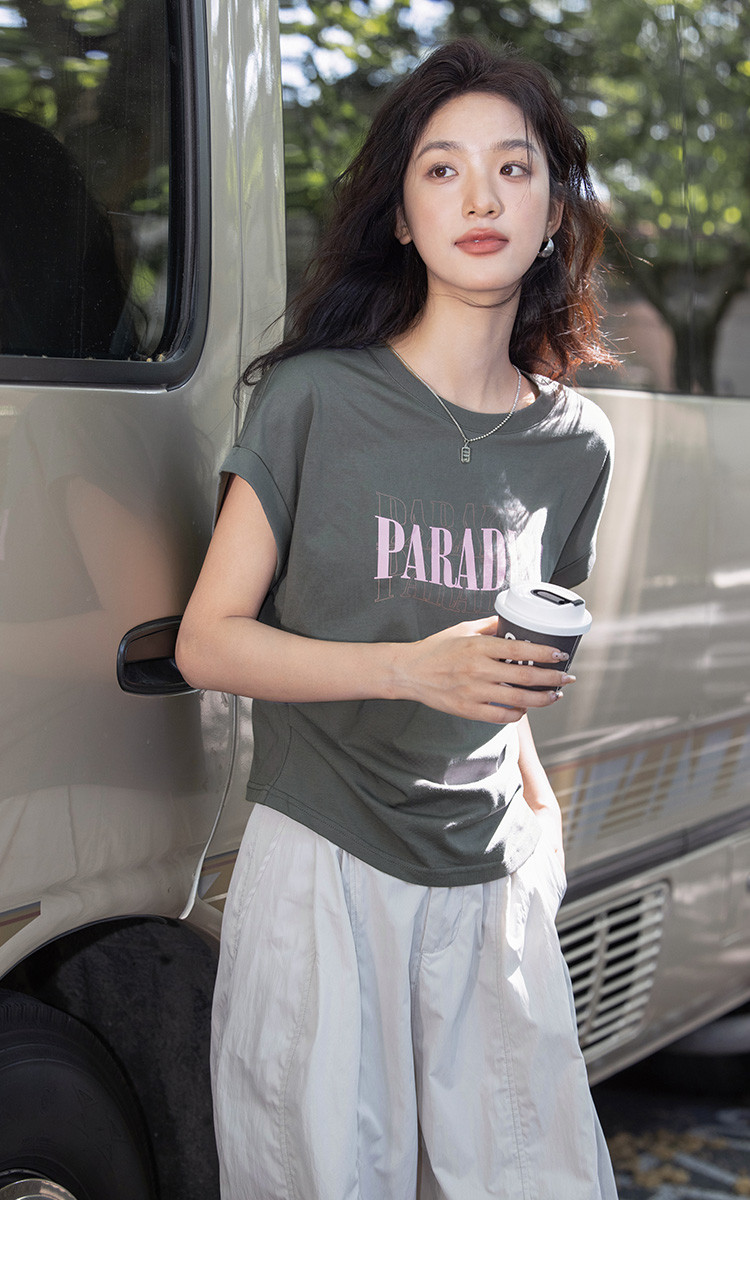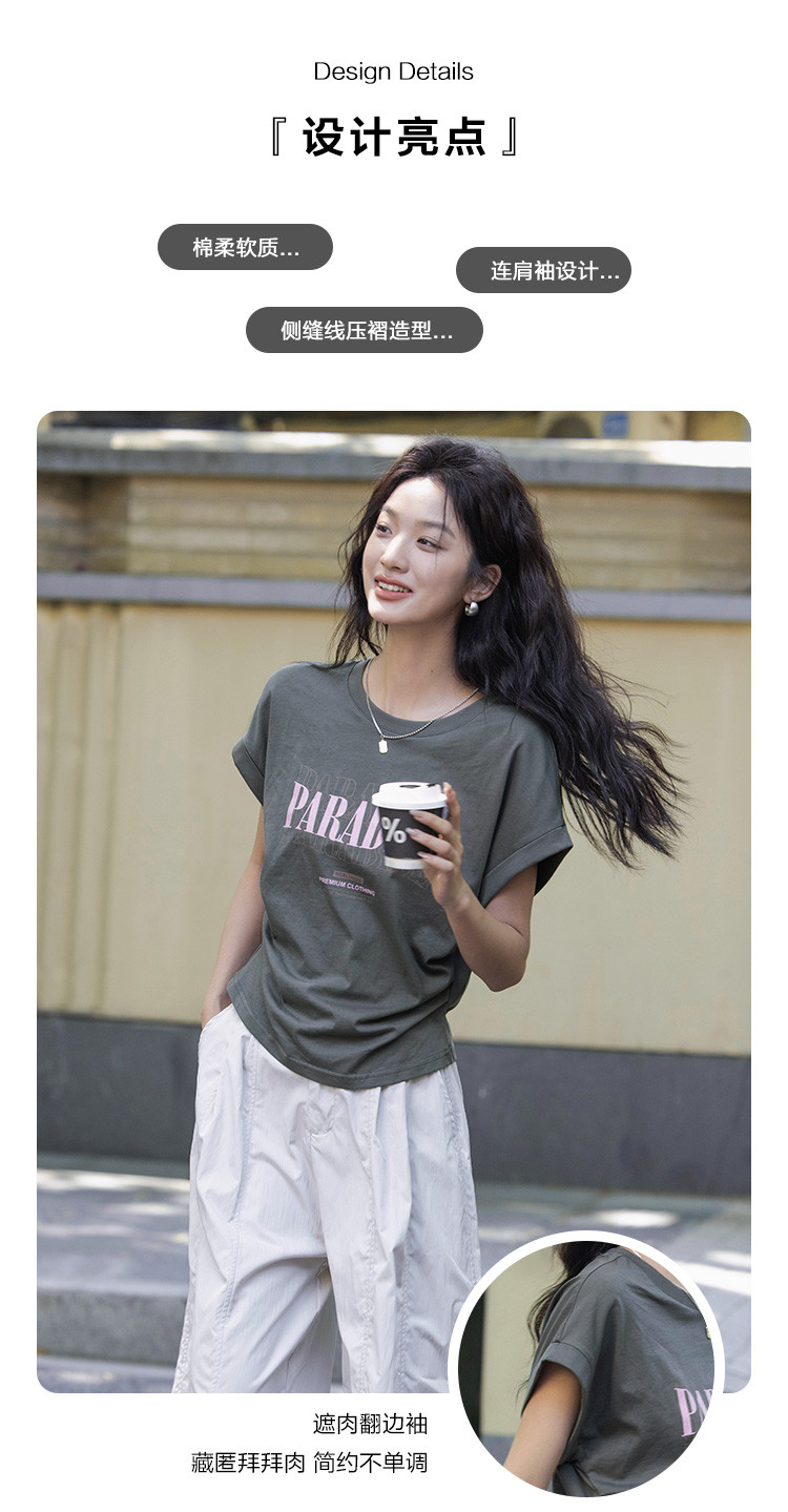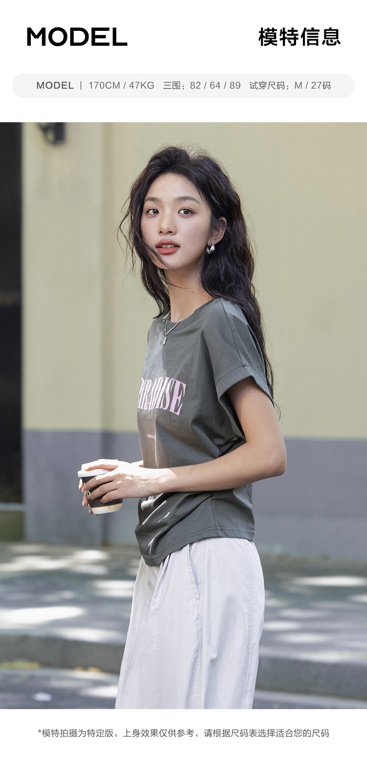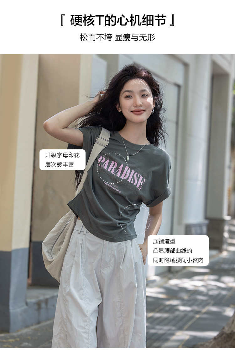 米子旗夏季女圆领字母印花T恤短款修身显瘦短袖上衣 687258