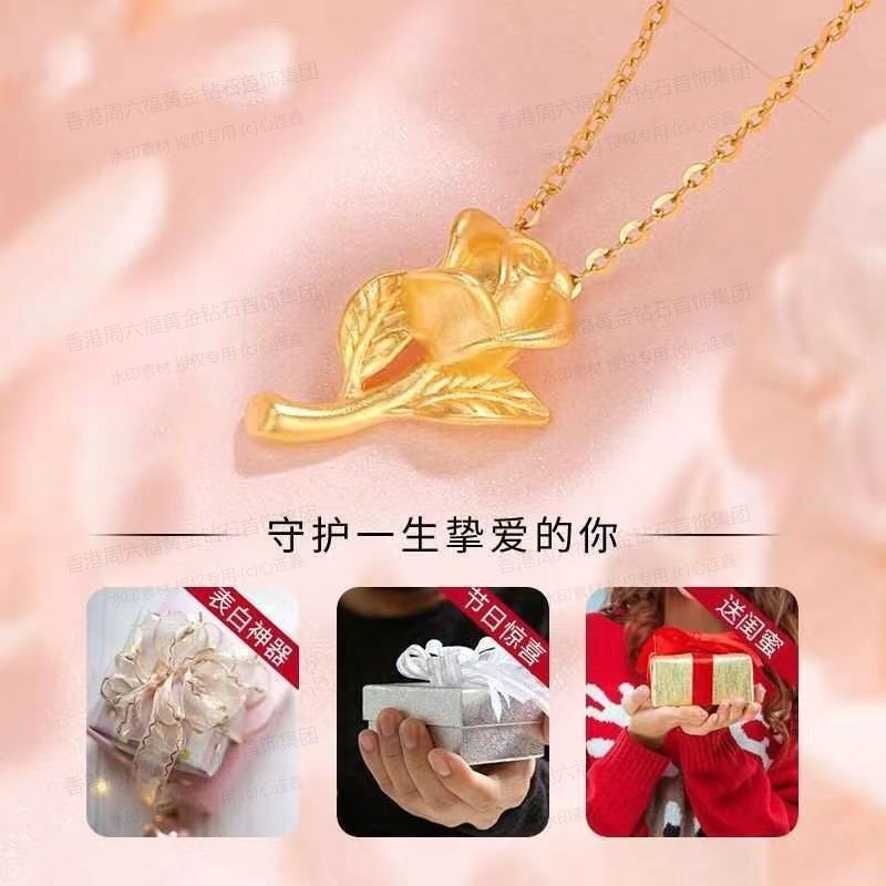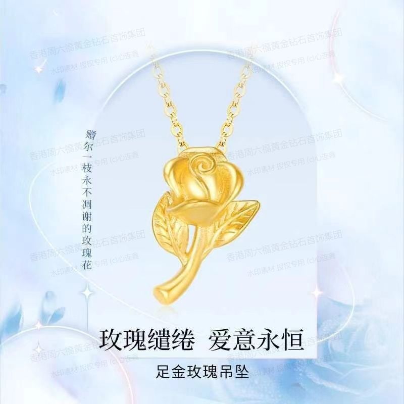 香港周六福黄金钻石首饰5D足金玫瑰花吊坠(附赠K金项链)