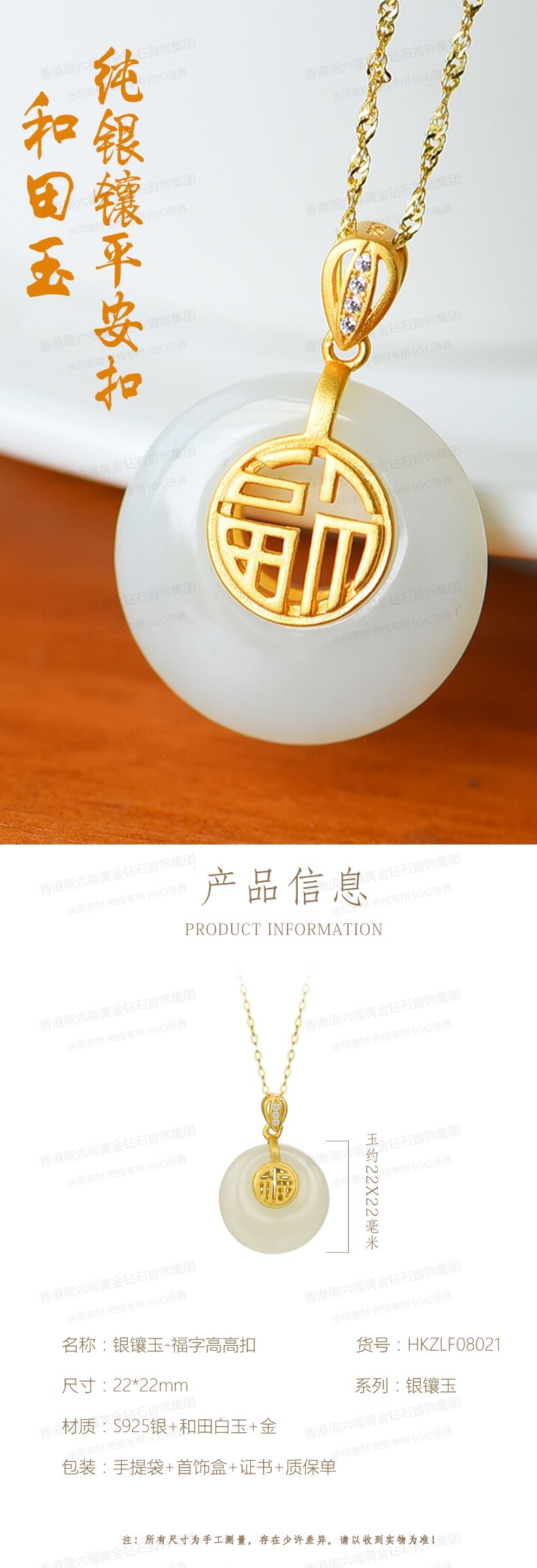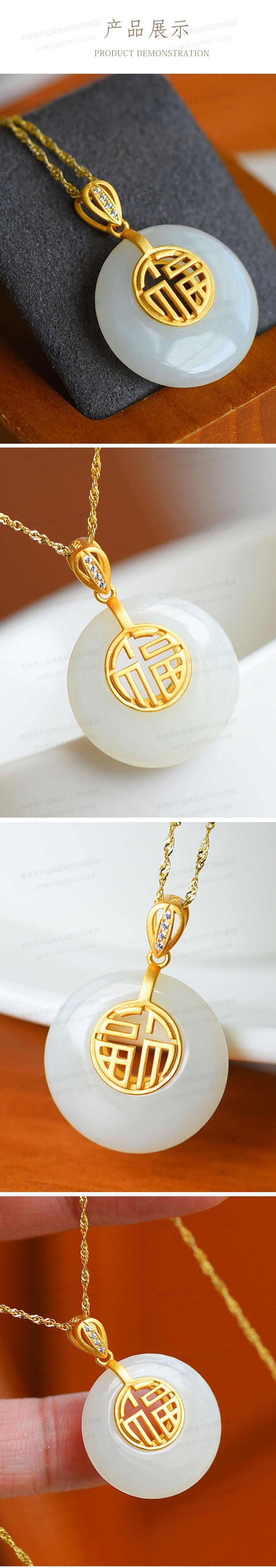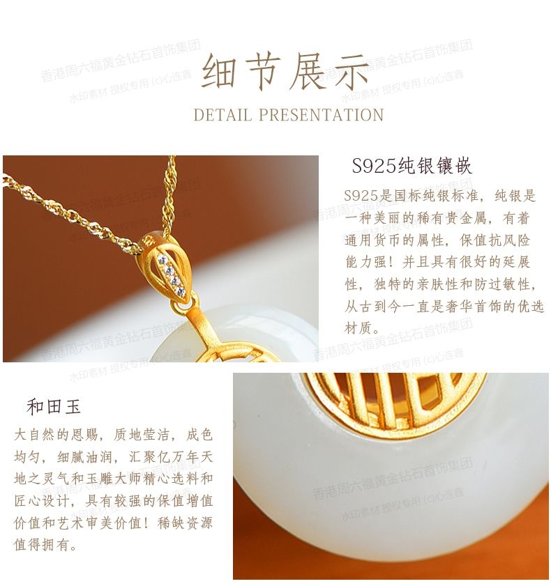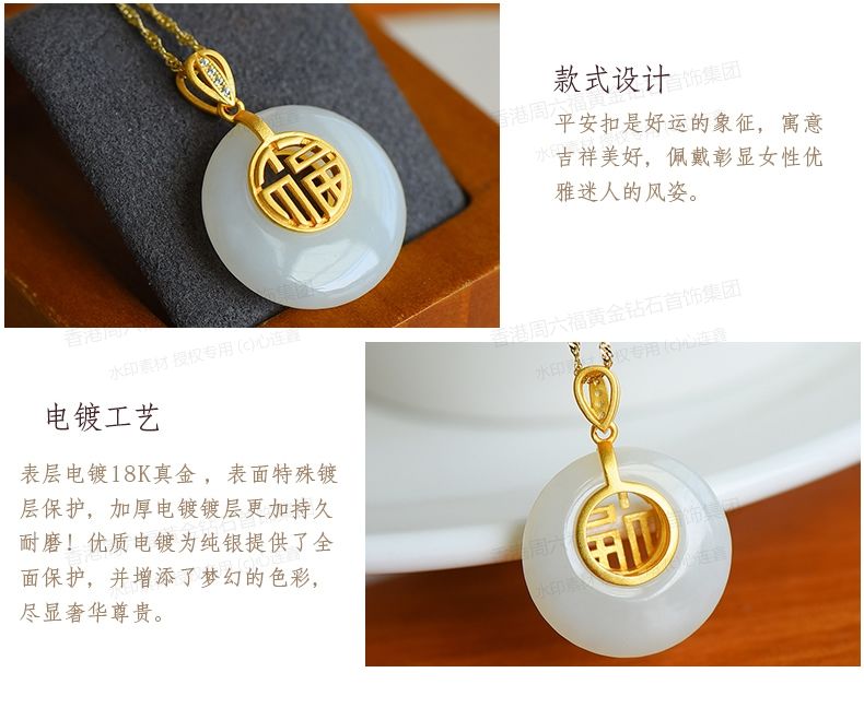 商品名称:香港周六福黄金钻石首饰古法银镶嵌和田玉-福字高高扣