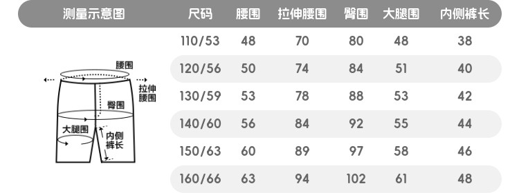 | 尺码 | 身高(cm) | 腰围(cm) | 裤长(cm) | 臀围(cm) | 适合年龄 | 号型 |