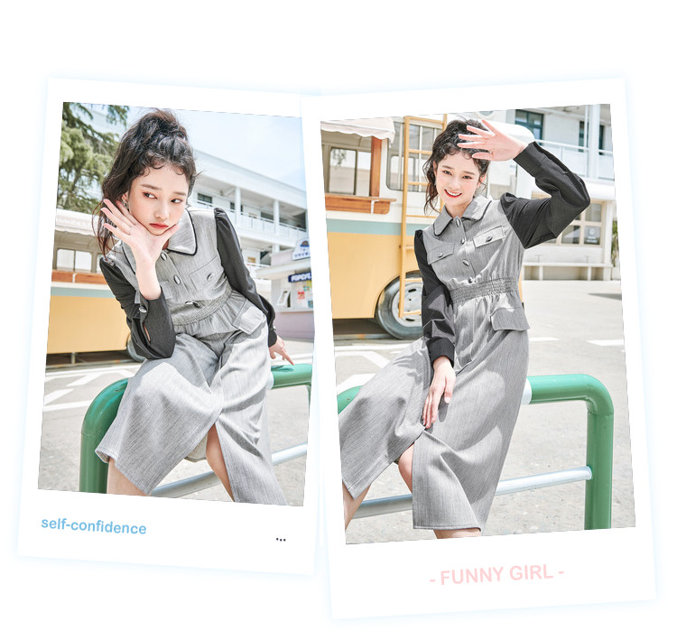 春秋复古法式翻领拼接高腰连衣裙女气质收腰衬衫裙 751572