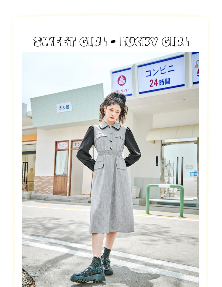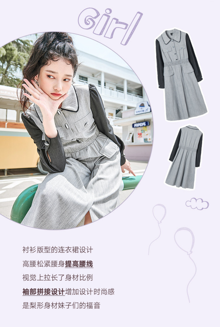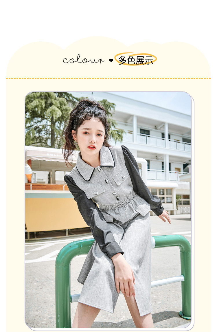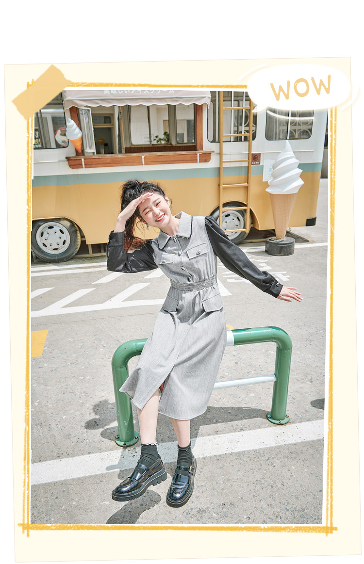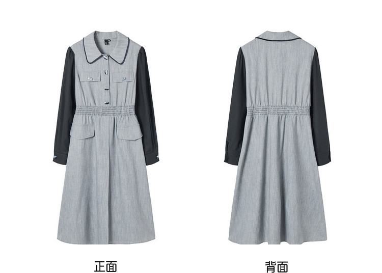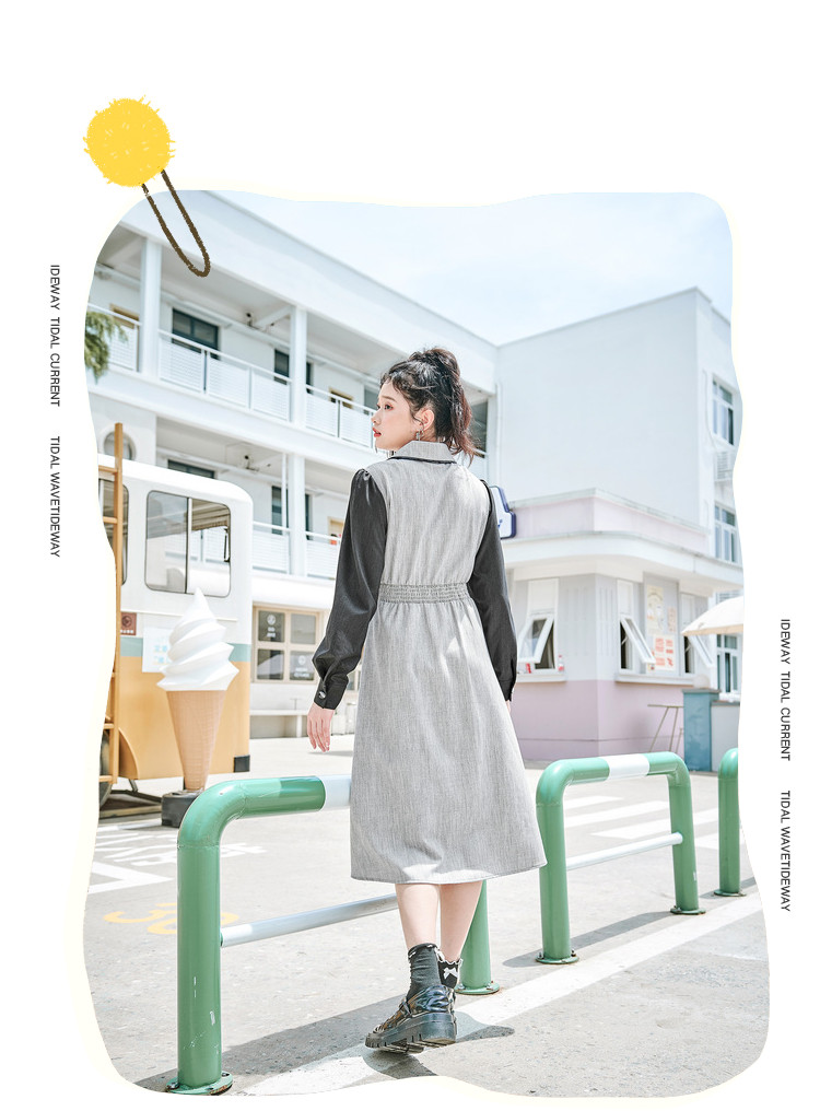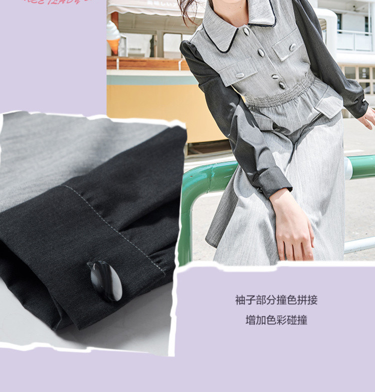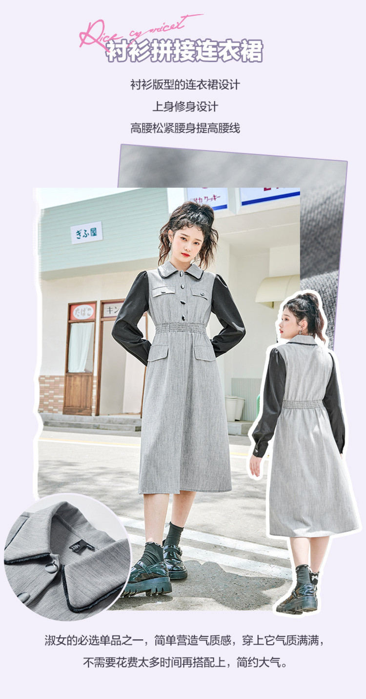 商品名称:春秋复古法式翻领拼接高腰连衣裙女气质收腰衬衫裙 751572