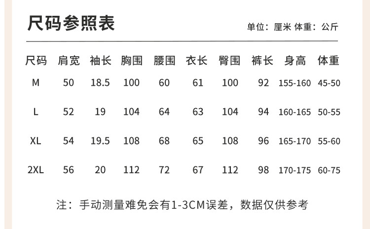| 尺码 | 肩宽(cm) | 袖长(cm) | 上装号型 | 下装号型 | 衣长(cm) | 身高(cm) | 腰围(cm) | 裤长(cm) | 体重(kg) | 臀围(cm) | 胸围(cm) | 号型 |