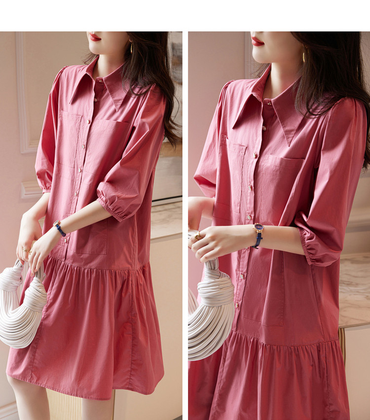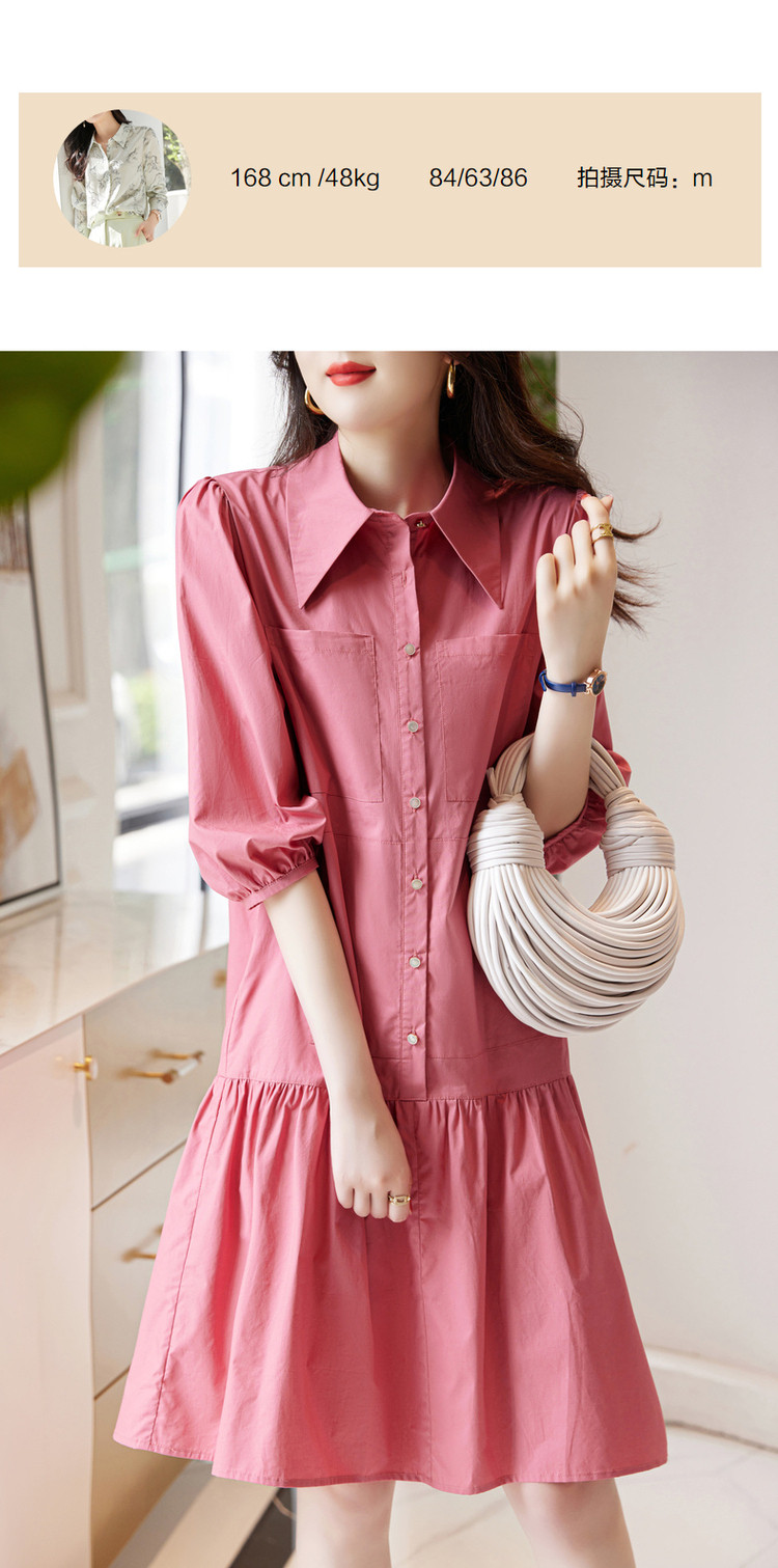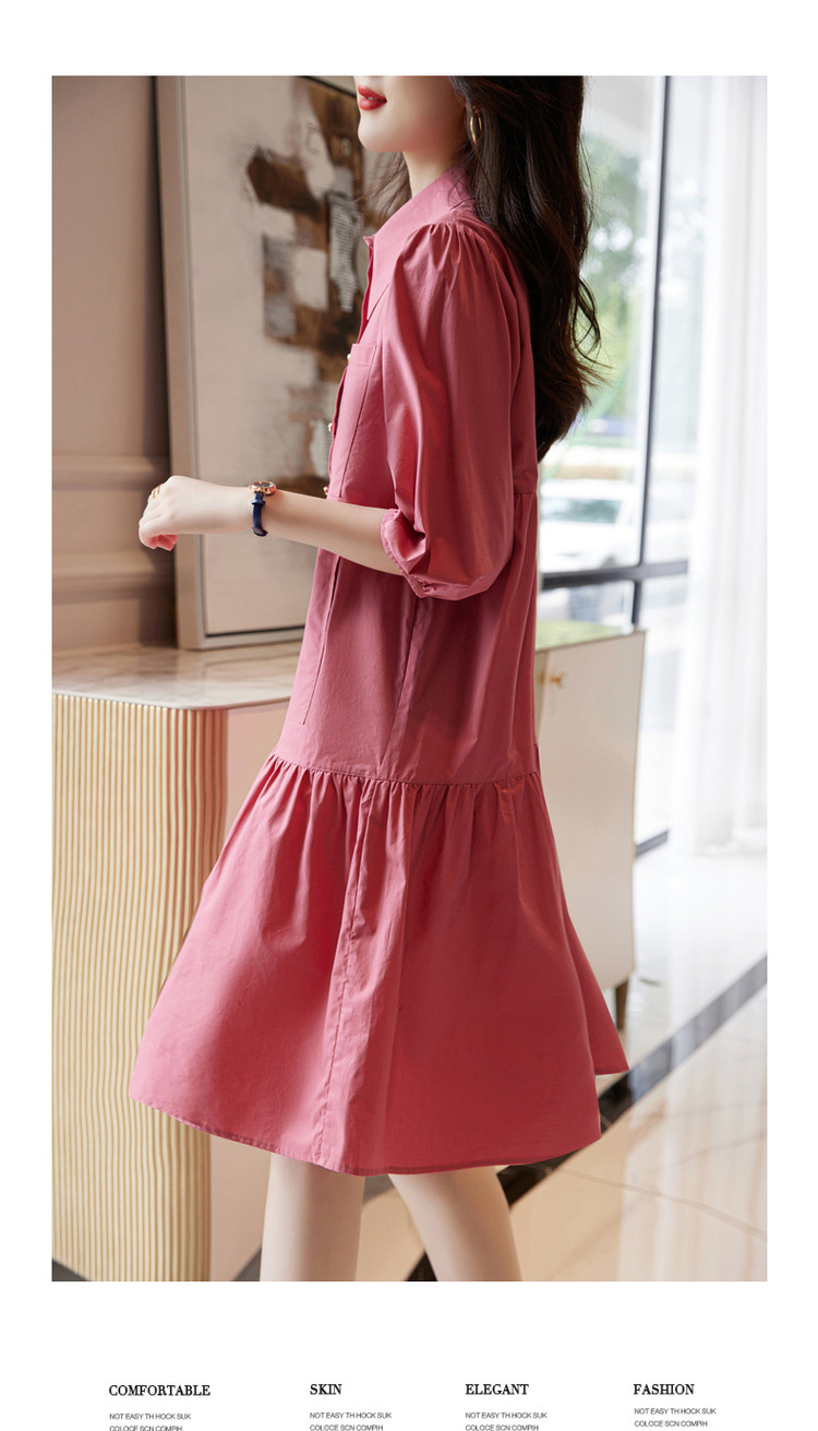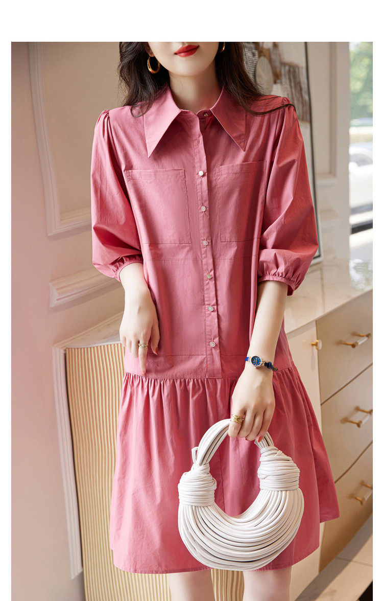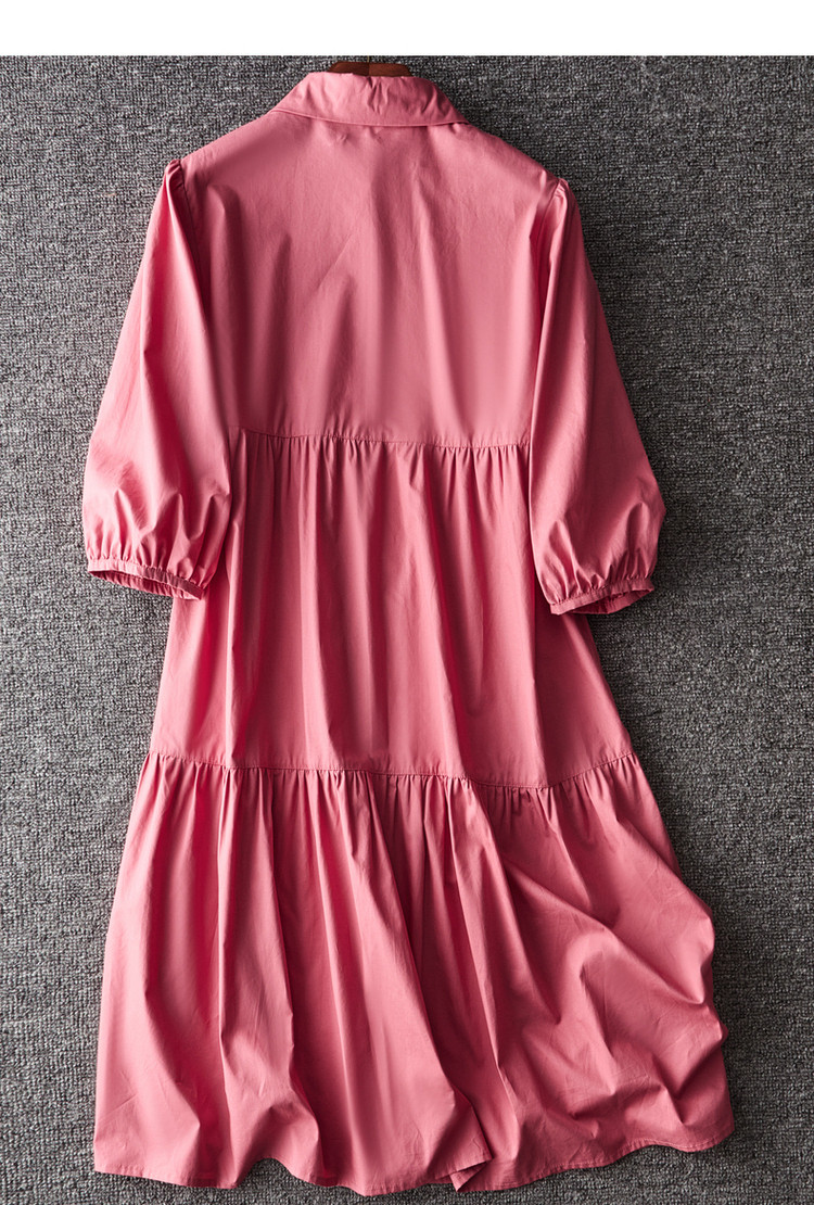 【a字娃娃裙】春秋翻领宽松七分袖抽褶简约中腰连衣裙女 015809