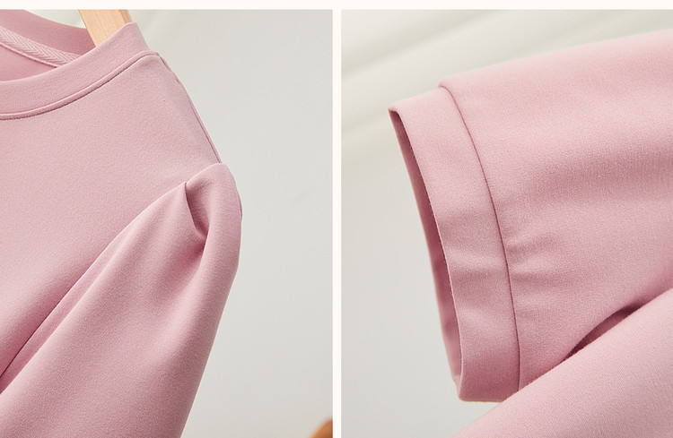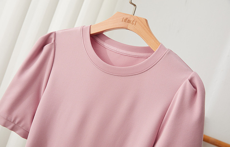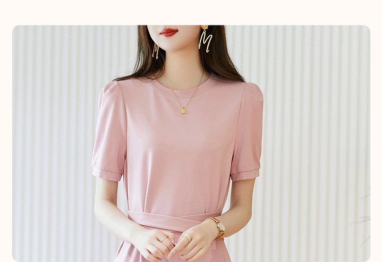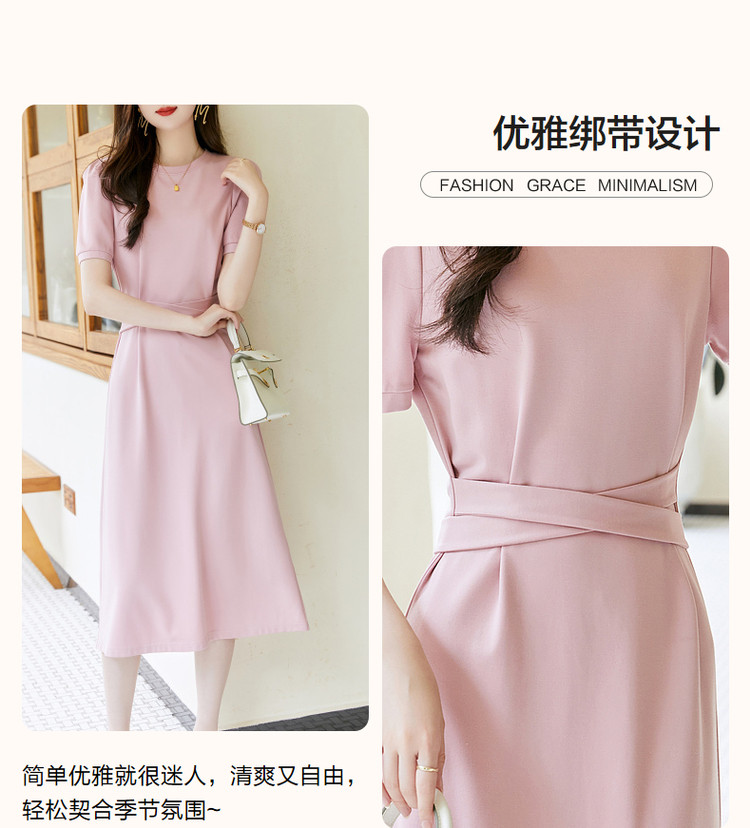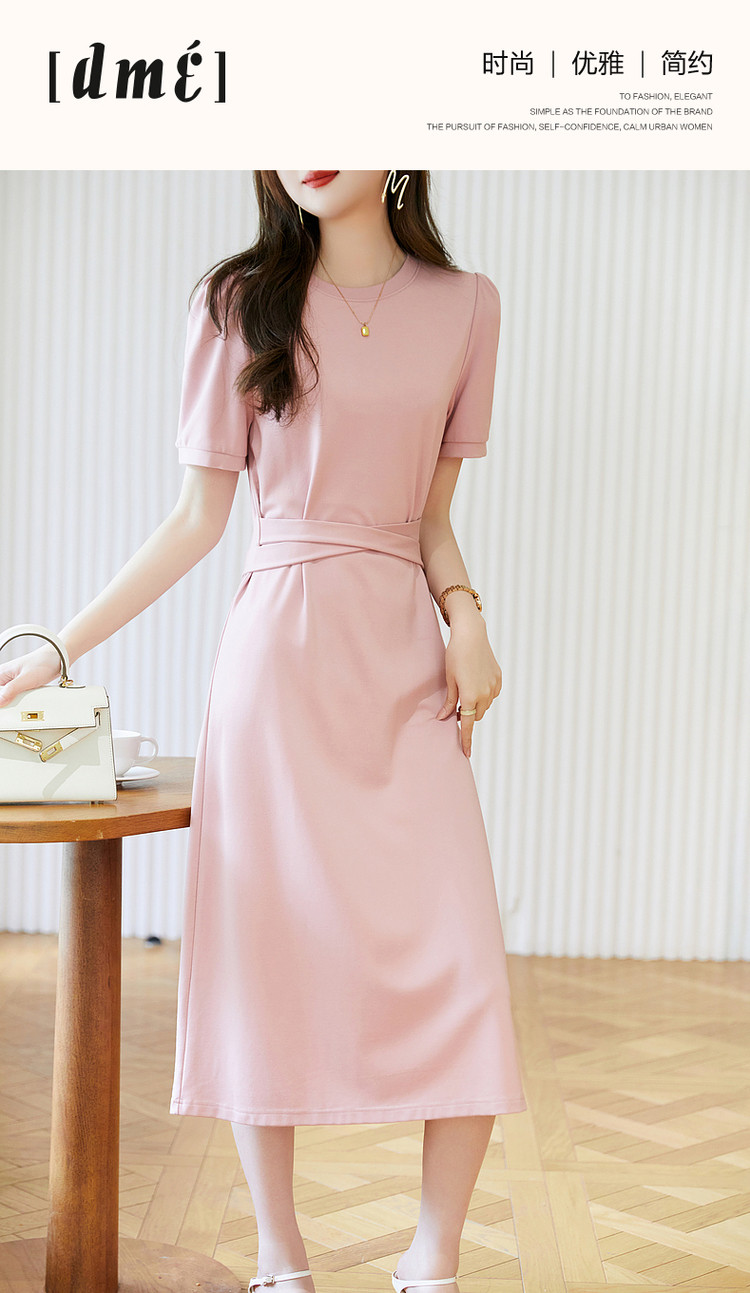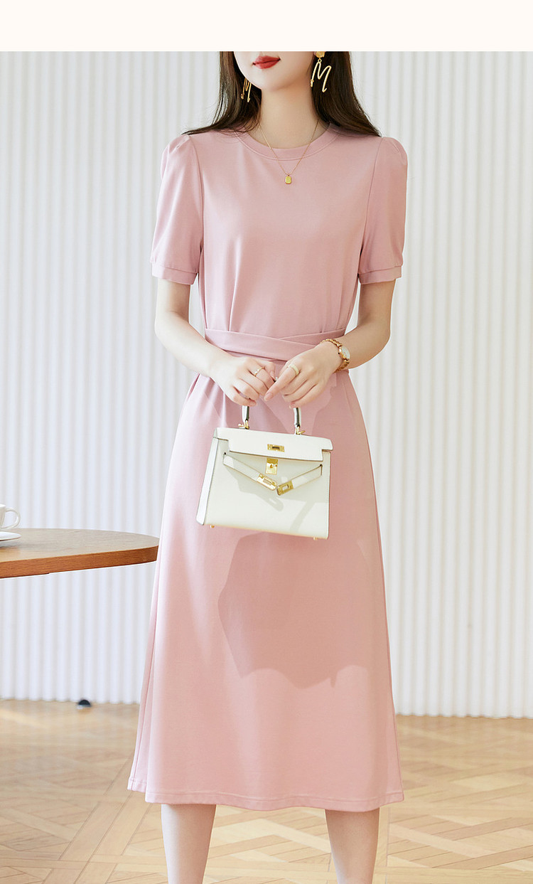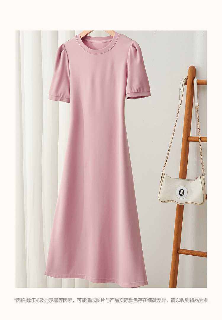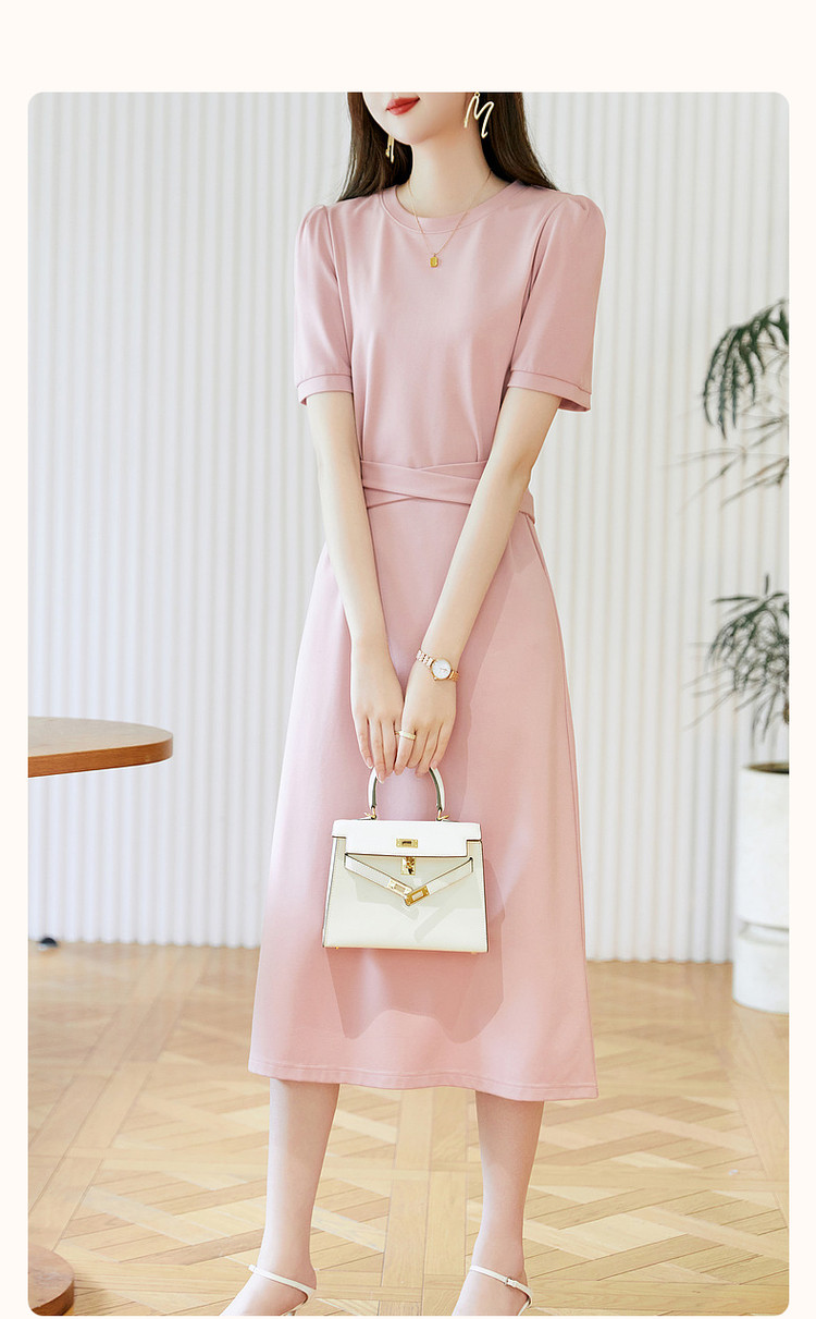 商品名称:【绑带泡泡袖针织伞裙】春秋圆领短袖连衣裙女中长款 849089