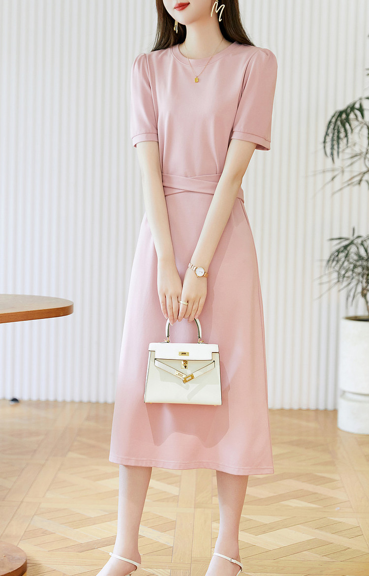 【绑带泡泡袖针织伞裙】春秋圆领短袖连衣裙女中长款 849089