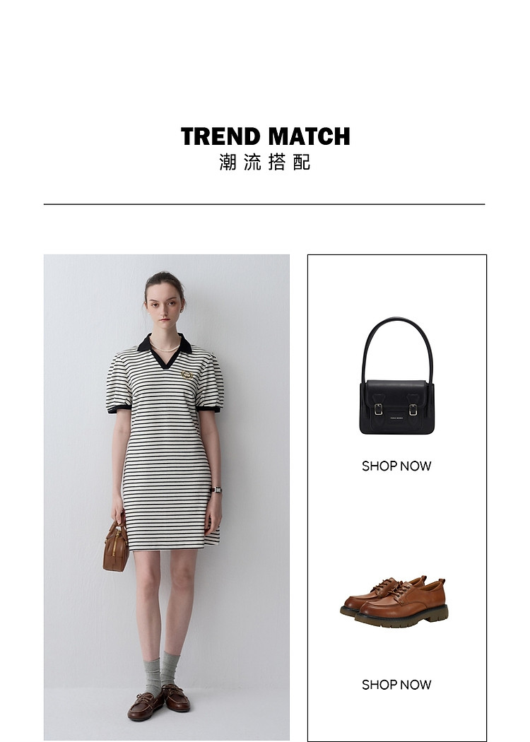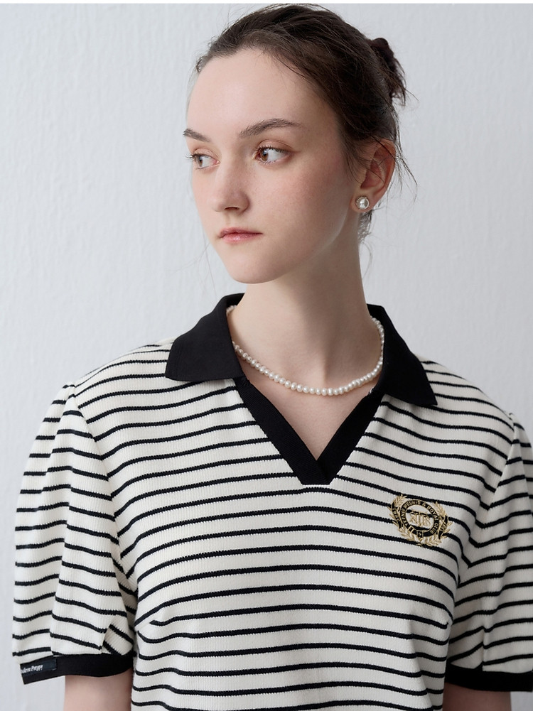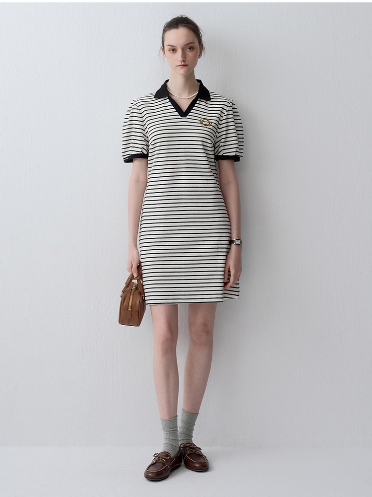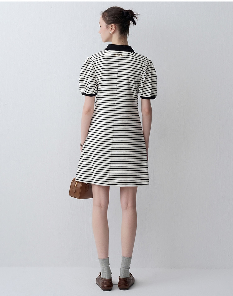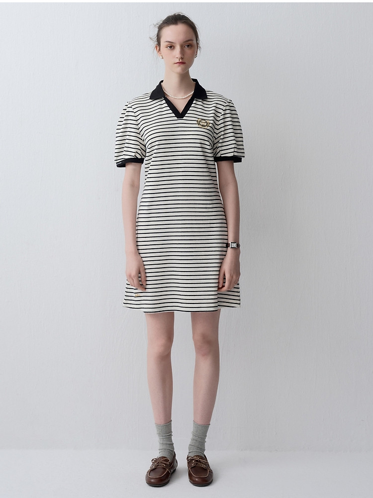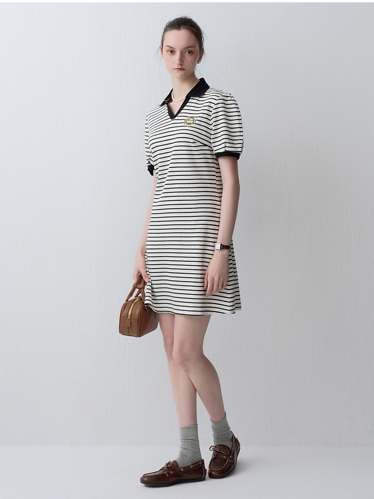 小熊款夏季条纹V领针织POLO连衣裙收腰中裙女装 341697