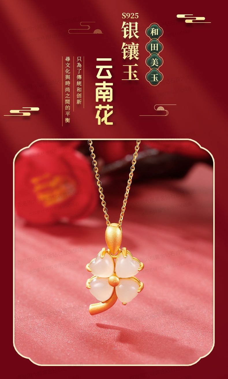 香港周六福黄金钻石首饰古法银镶嵌和田玉-云南花