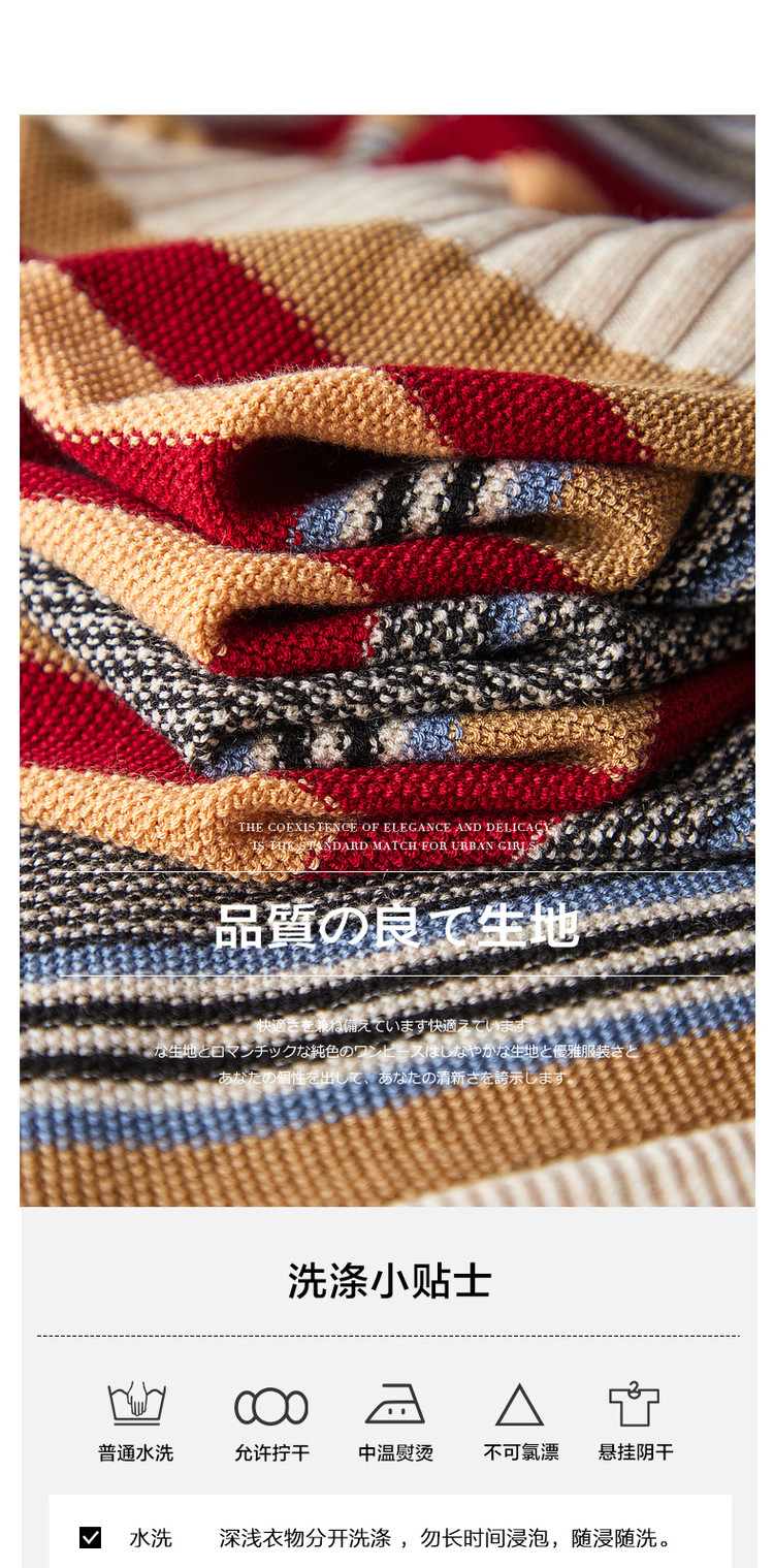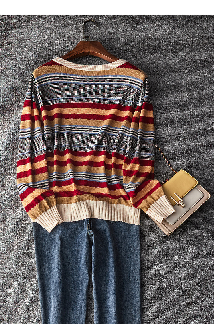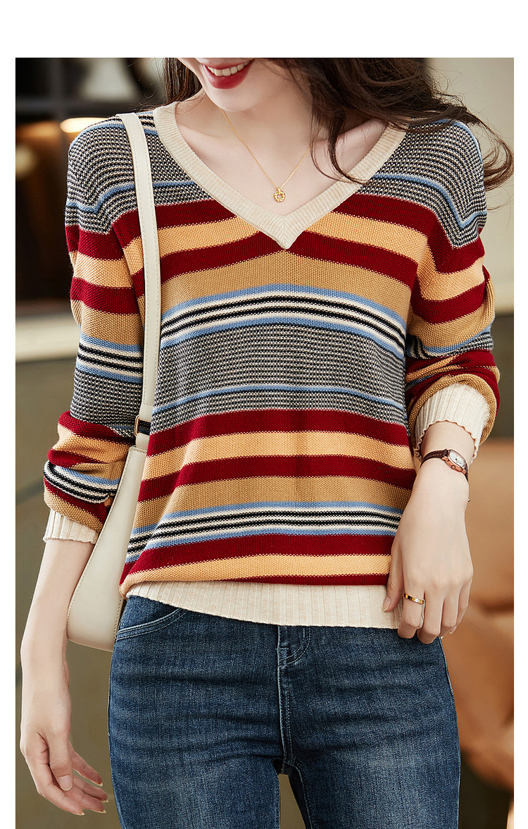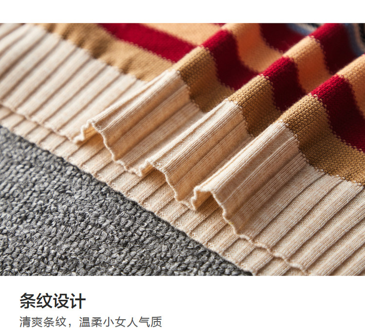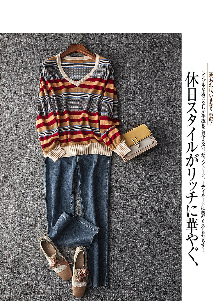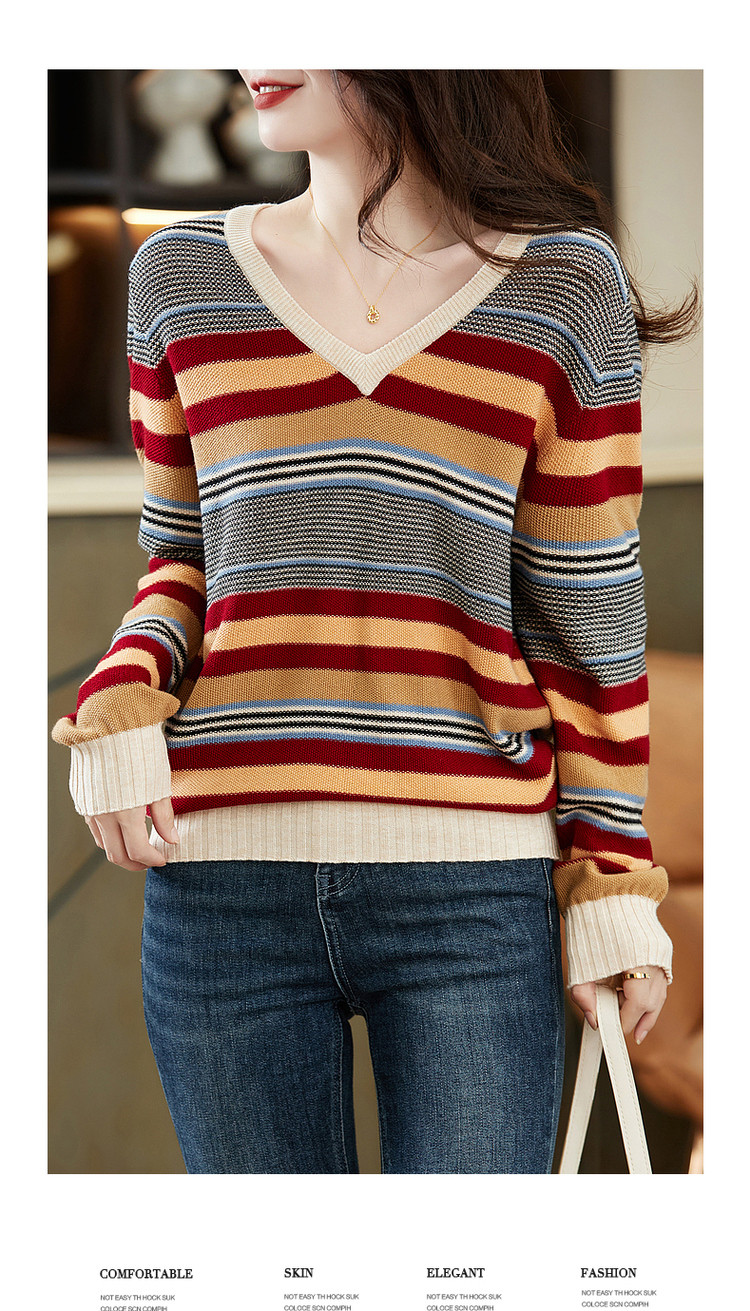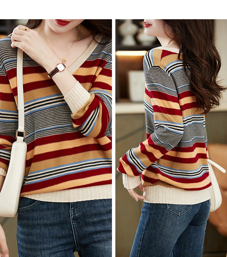 【撞色条纹针织衫】春秋季通勤V领宽松长袖简约毛衣女 173569