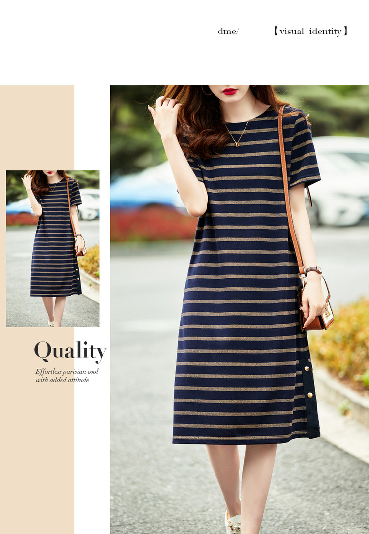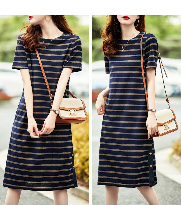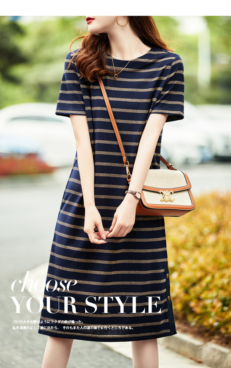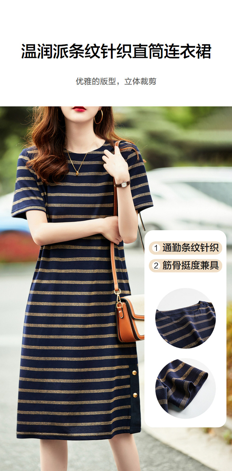 【条纹针织】春秋圆领宽松直筒短袖H型连衣裙女中长款 617281
