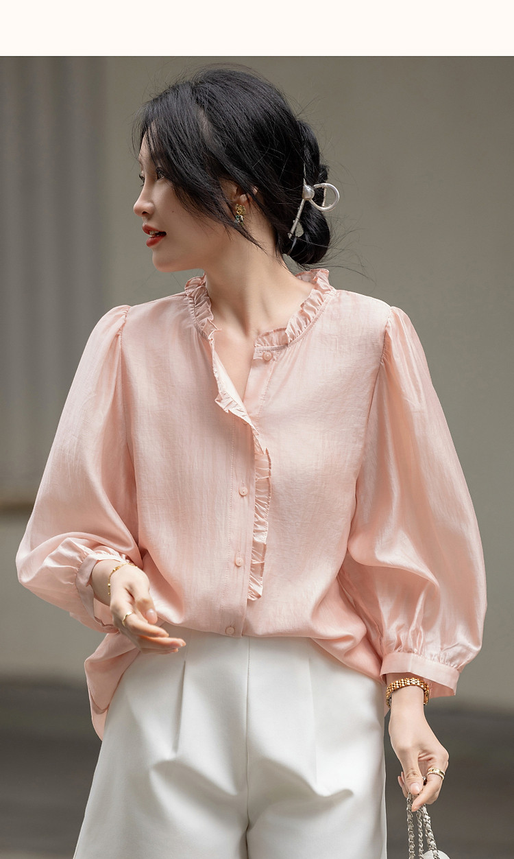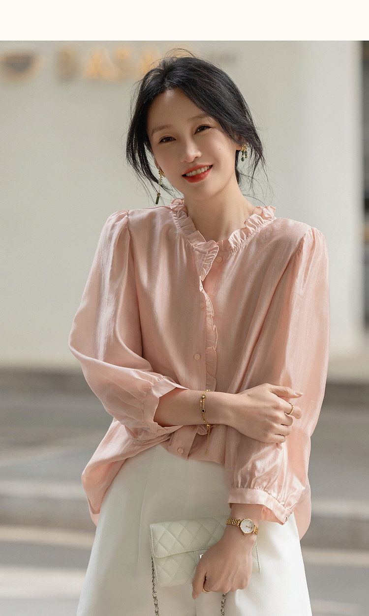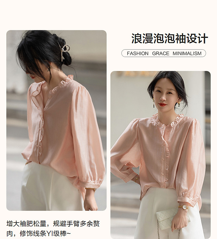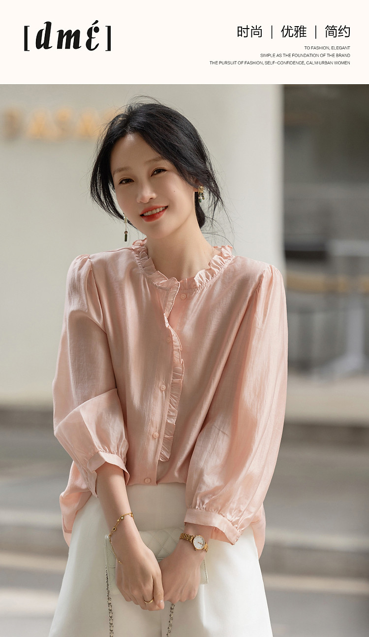 【珠光感莱赛尔】春秋法式圆领泡泡袖木耳边衬衫小个子衬衣女上衣 959041