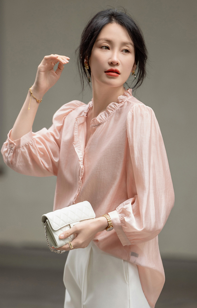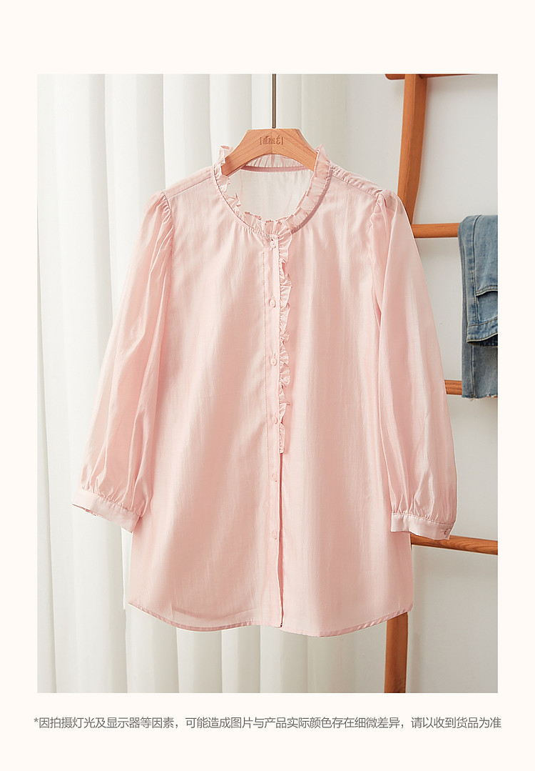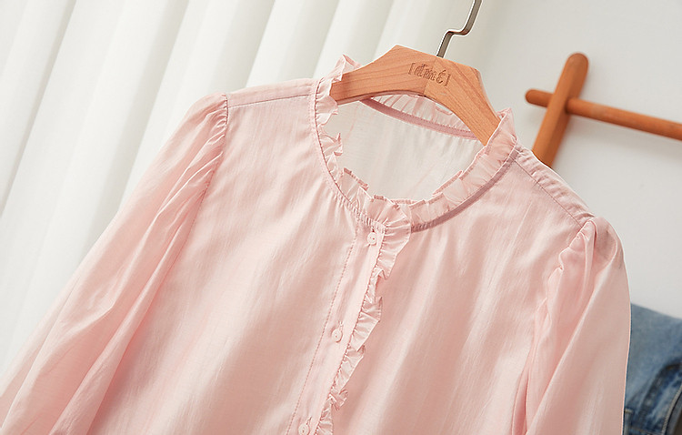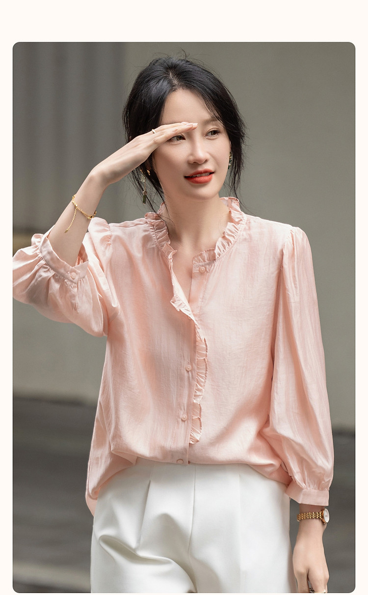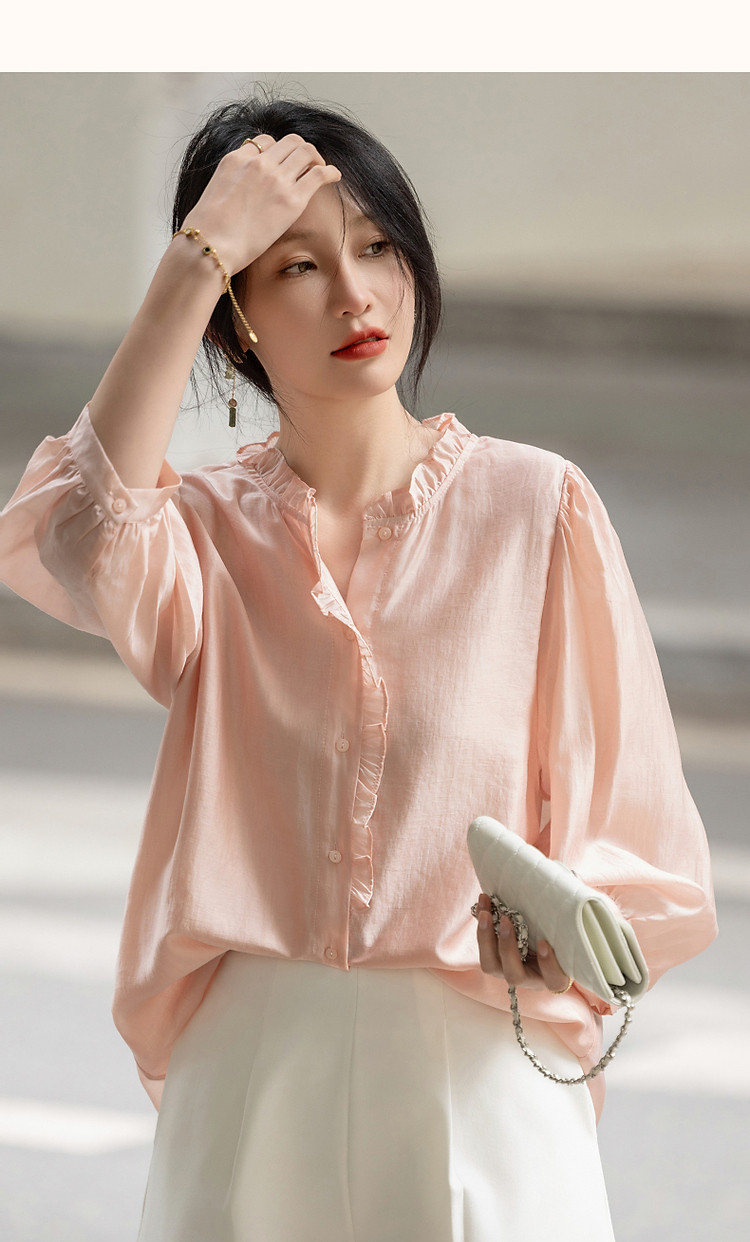 【珠光感莱赛尔】春秋法式圆领泡泡袖木耳边衬衫小个子衬衣女上衣 959041