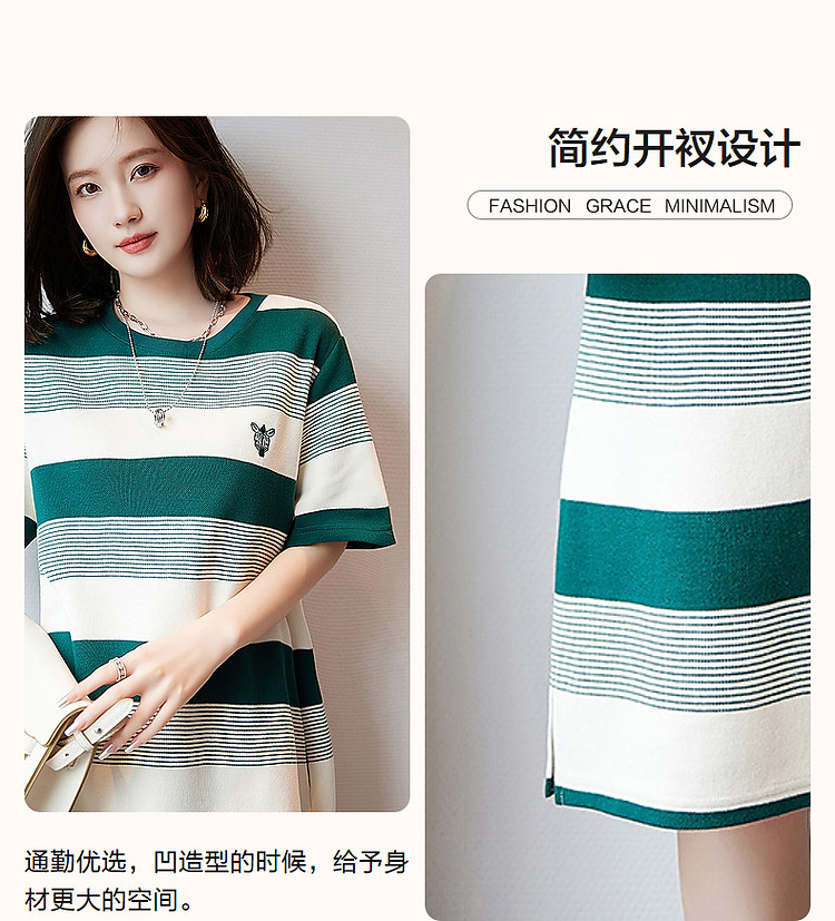 商品名称:【条纹珠地斑马绣花t恤裙】春秋圆领开衩短袖连衣裙女中长款 204609