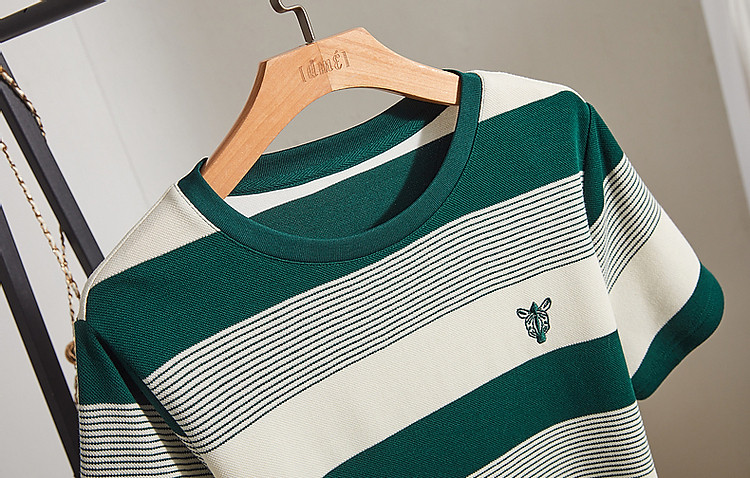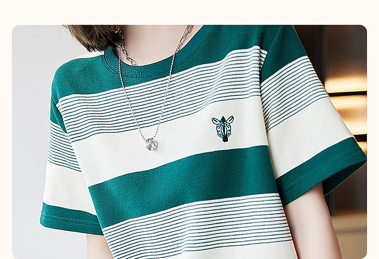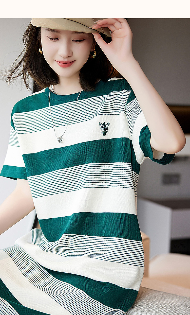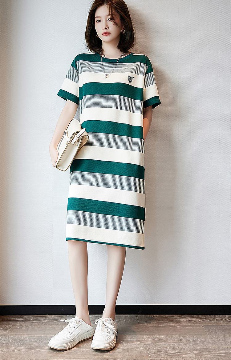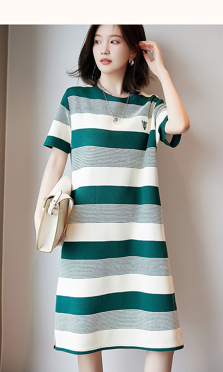 【条纹珠地斑马绣花t恤裙】春秋圆领开衩短袖连衣裙女中长款 204609