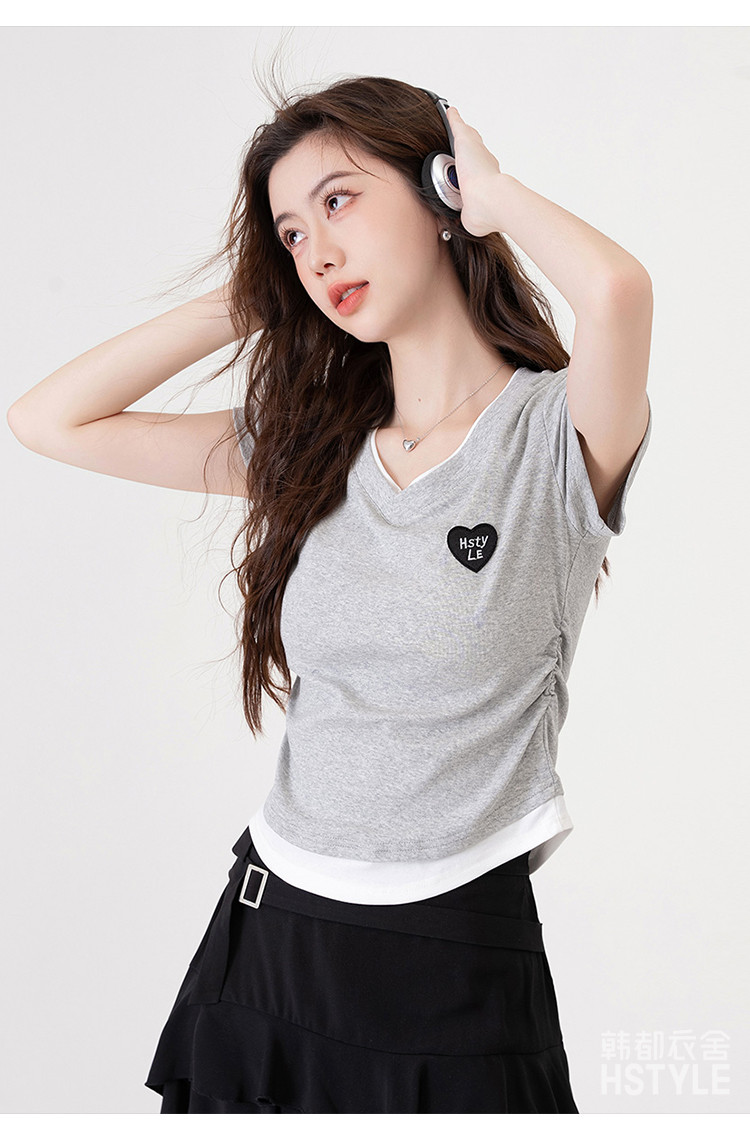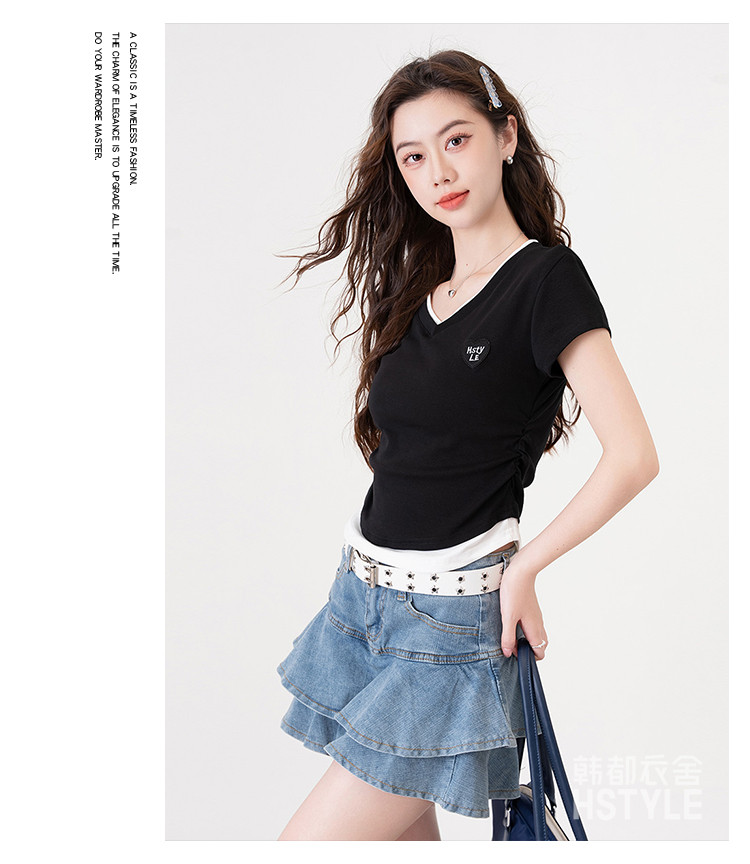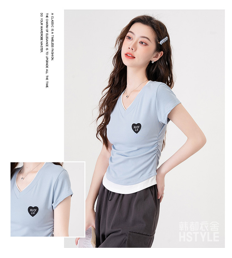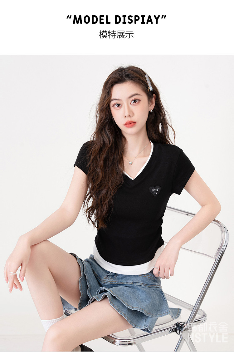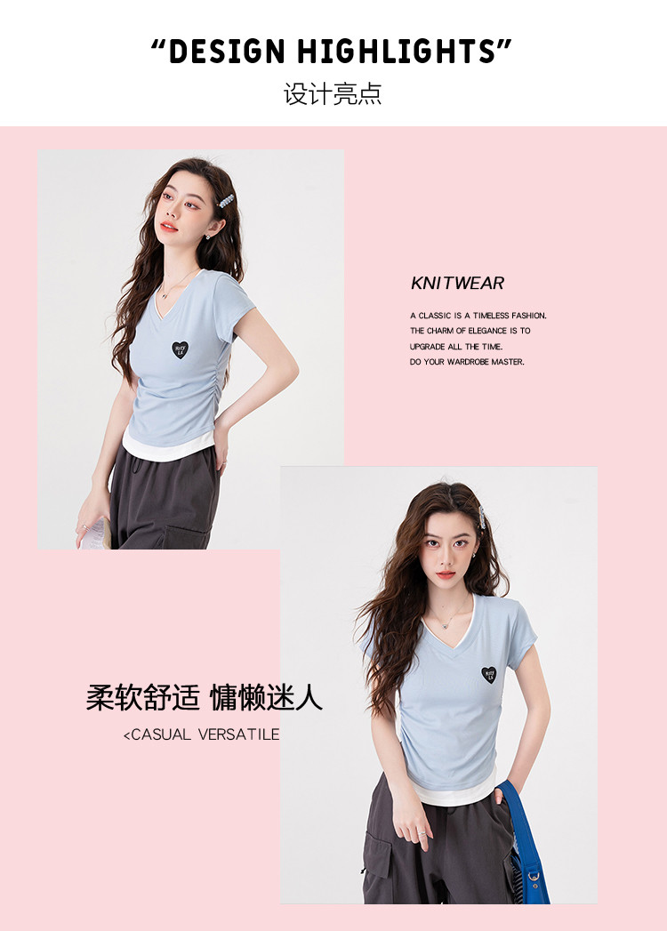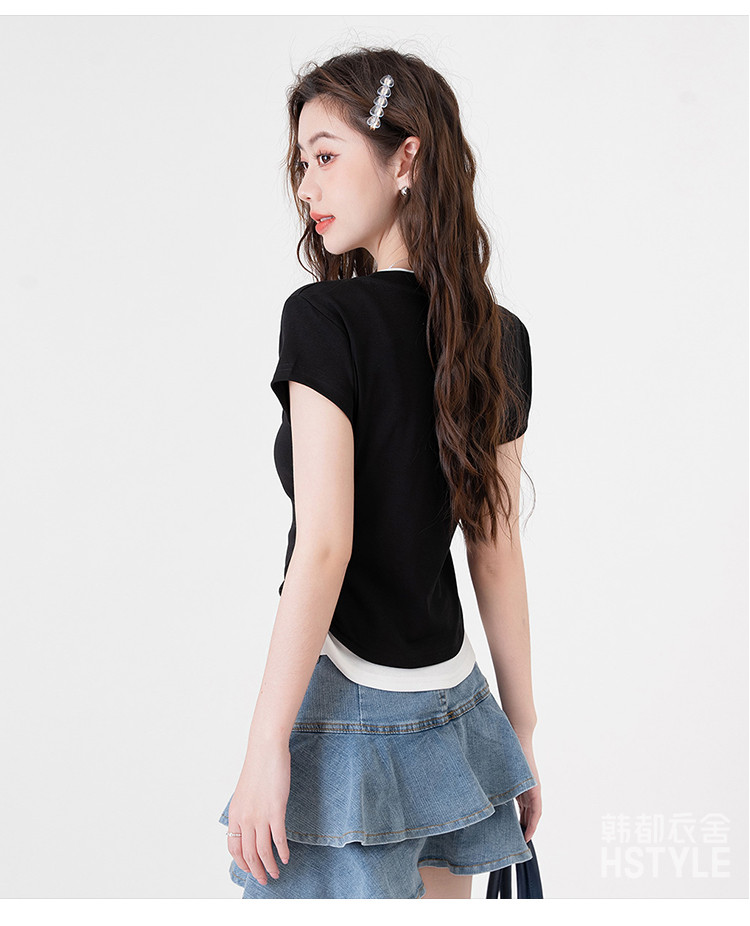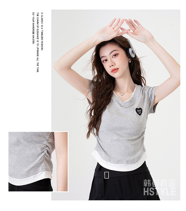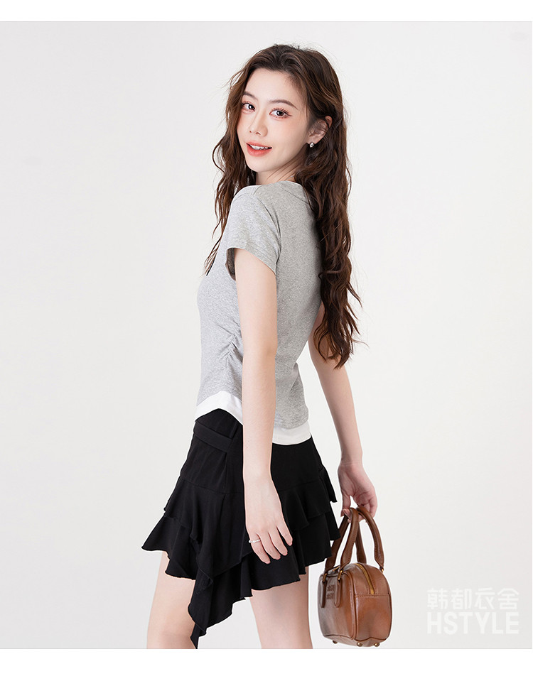 假两件抽褶收腰女式t恤夏拼色短袖上衣女修身内搭打底 916363