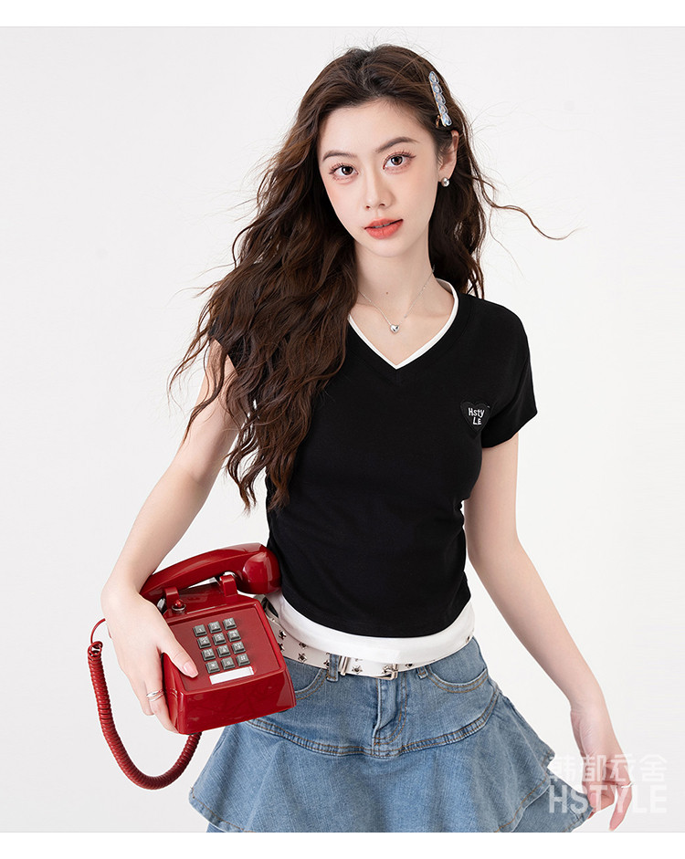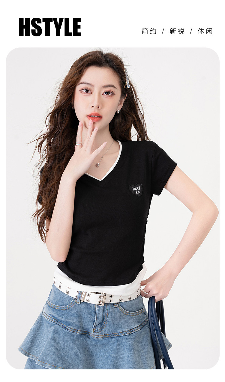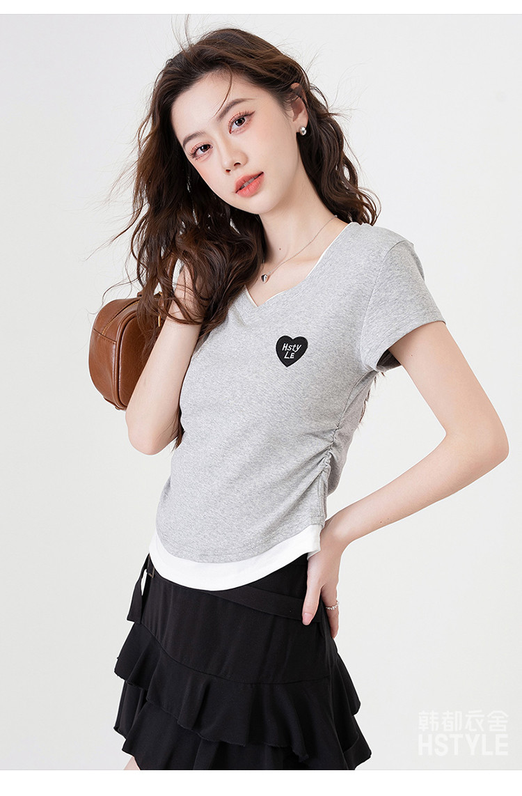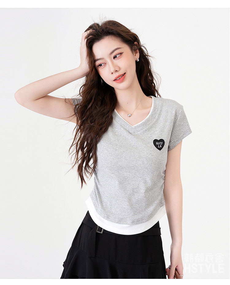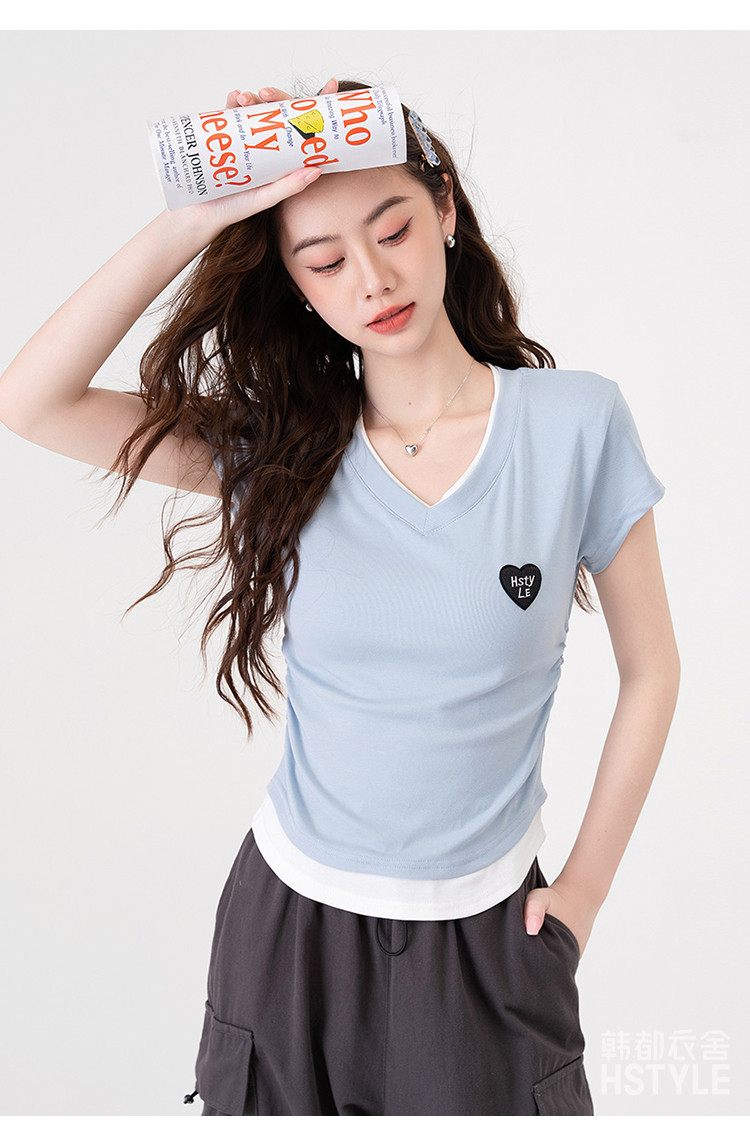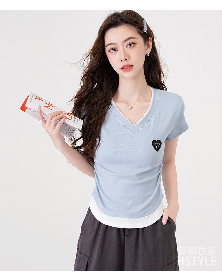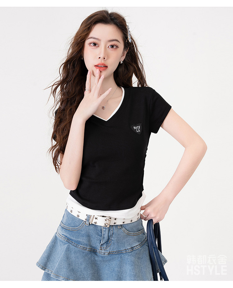 假两件抽褶收腰女式t恤夏拼色短袖上衣女修身内搭打底 916363
