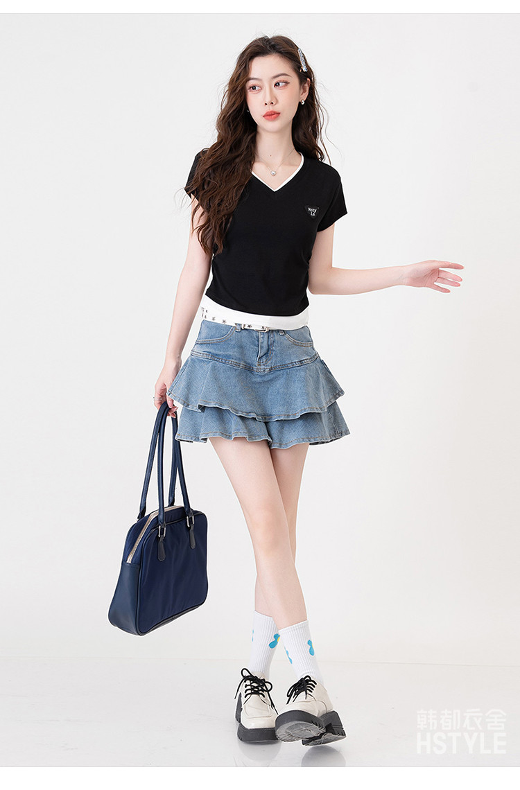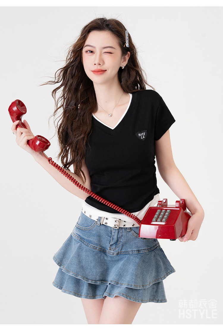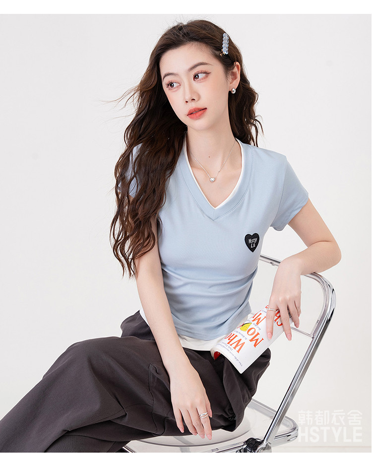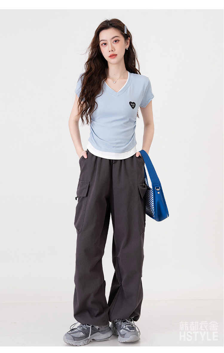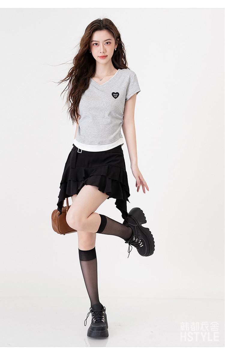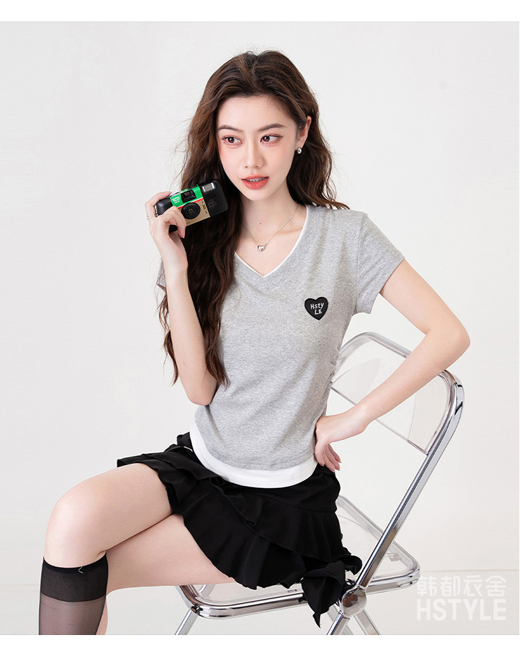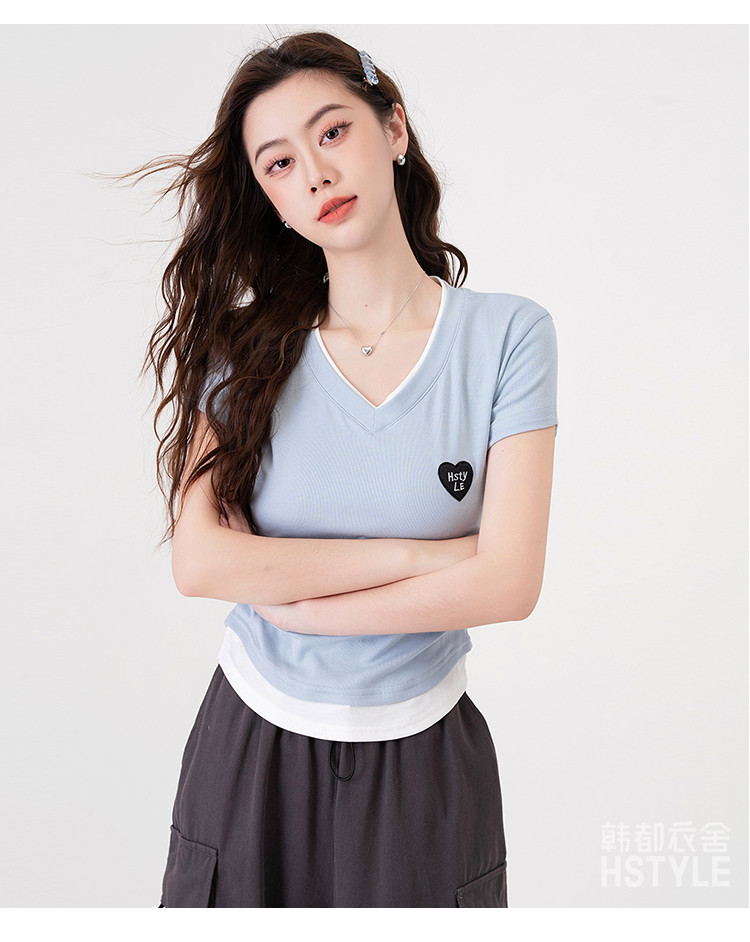假两件抽褶收腰女式t恤夏拼色短袖上衣女修身内搭打底 916363