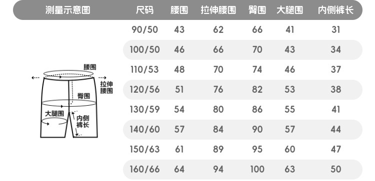 | 尺码 | 身高(cm) | 腰围(cm) | 裤长(cm) | 臀围(cm) | 适合年龄 | 号型 |