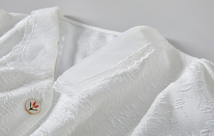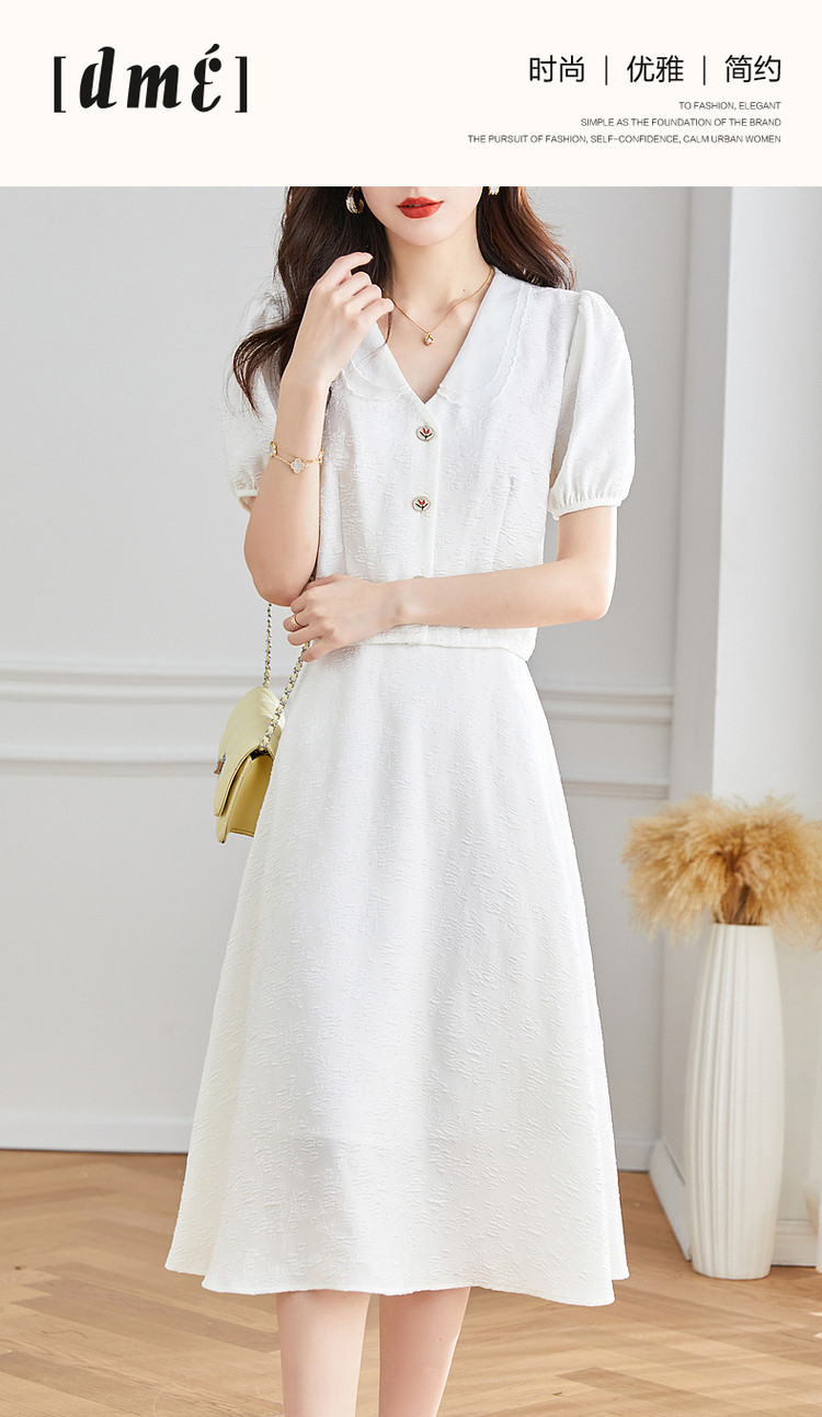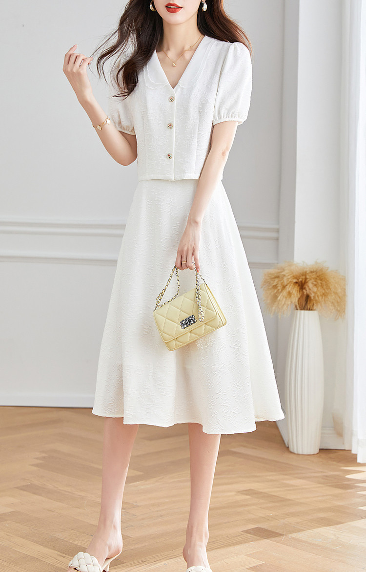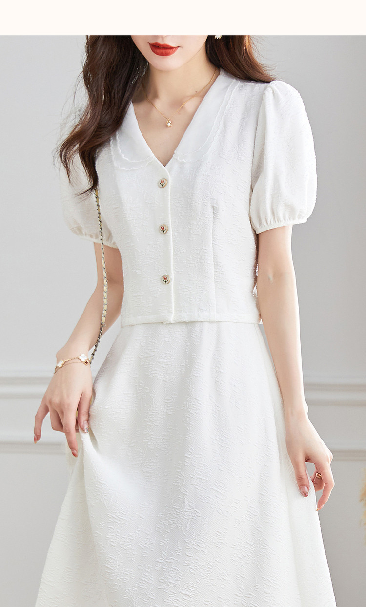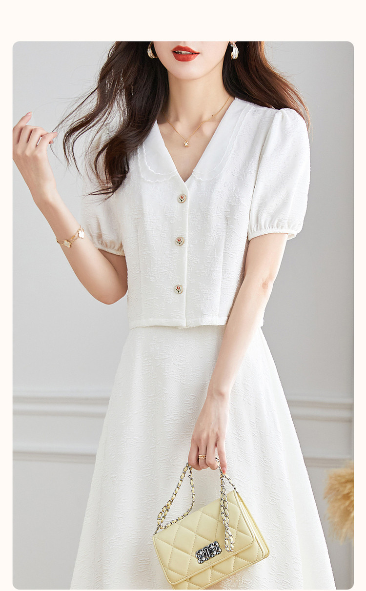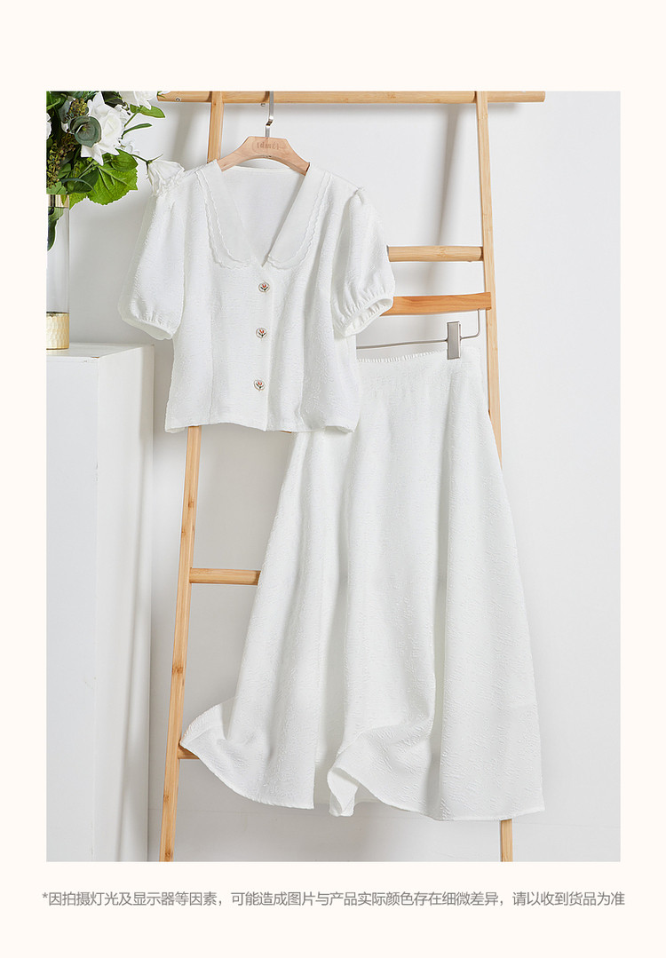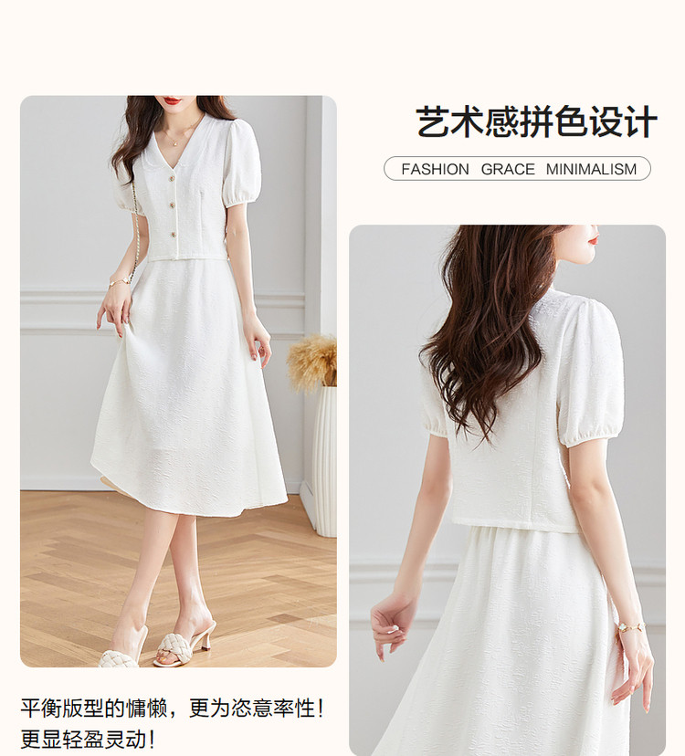 商品名称:【浮雕花卉套装】夏泡泡袖拼色欧根纱绣花两件套 865409