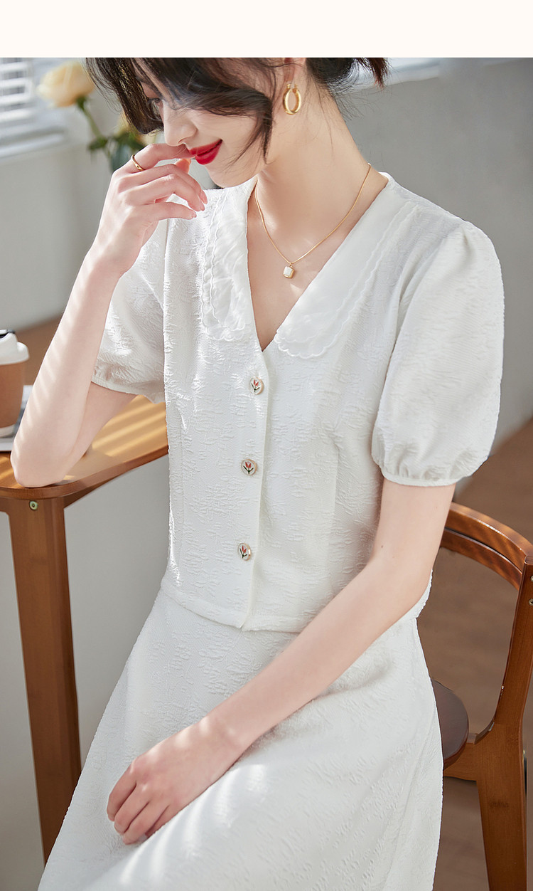 【浮雕花卉套装】夏泡泡袖拼色欧根纱绣花两件套 865409