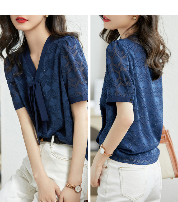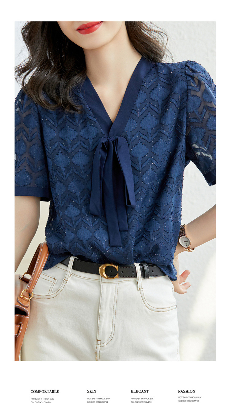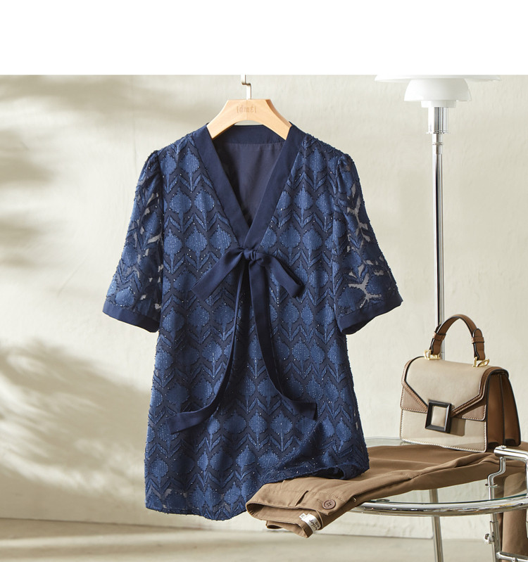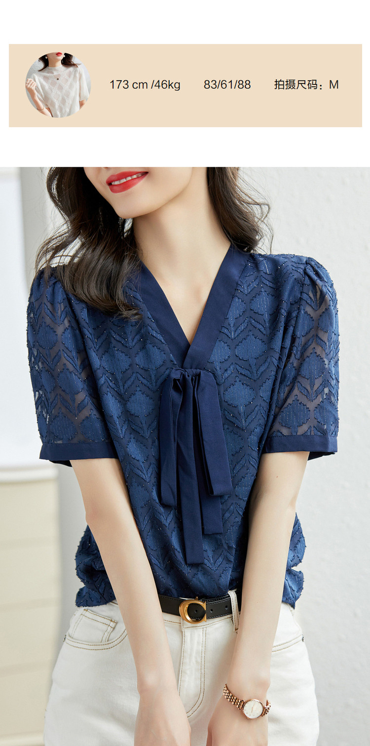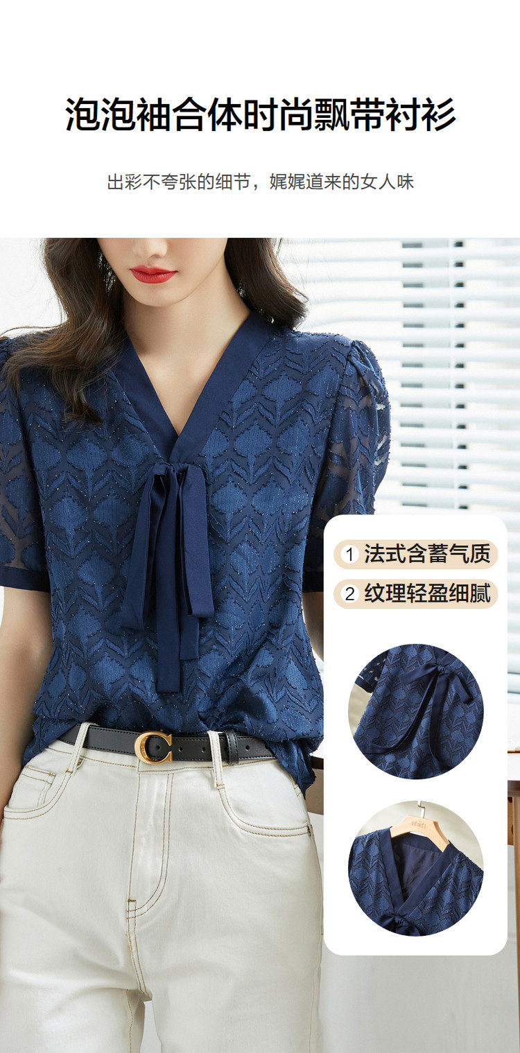 商品名称:【泡泡袖系带衬衫】夏季雅致V领短袖提花水洗衬衣女式上衣 675713