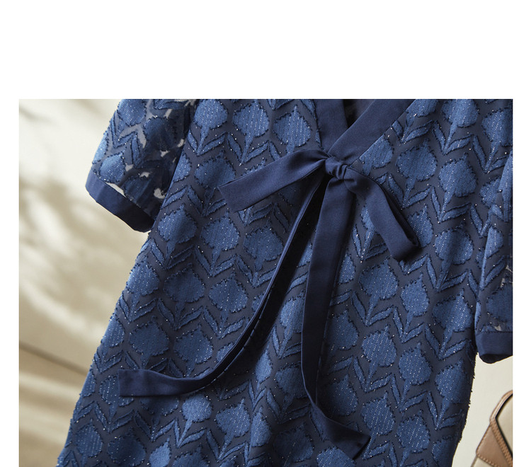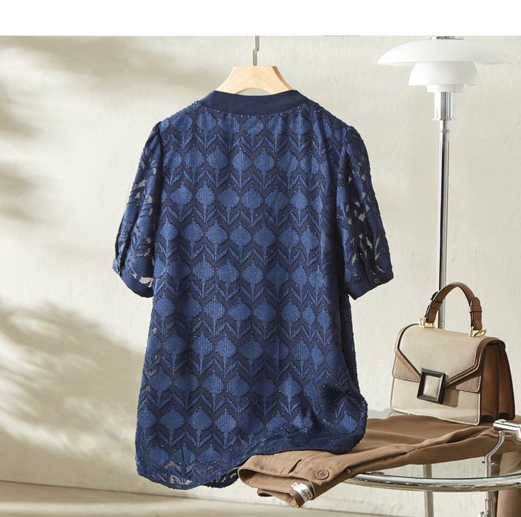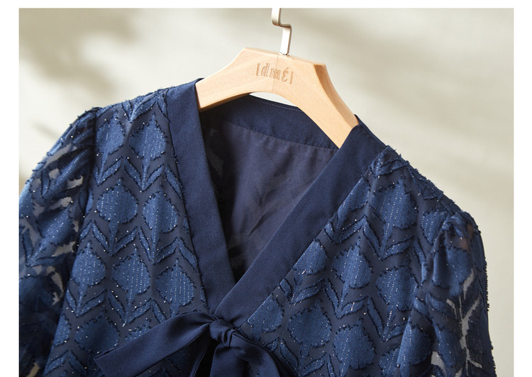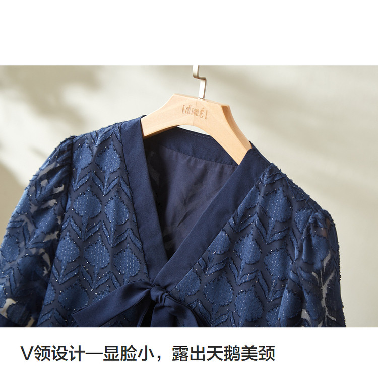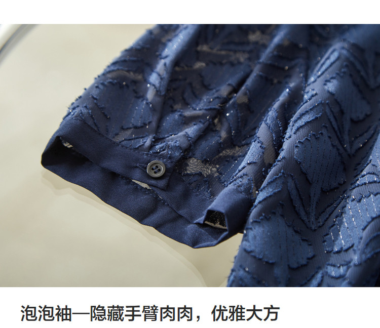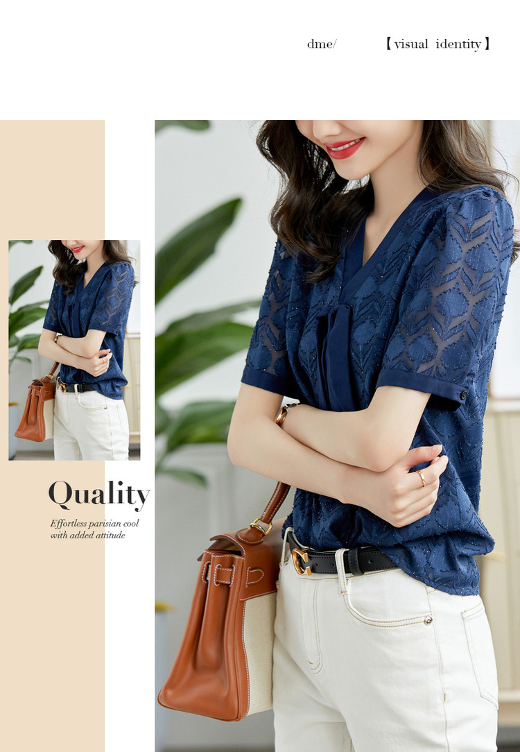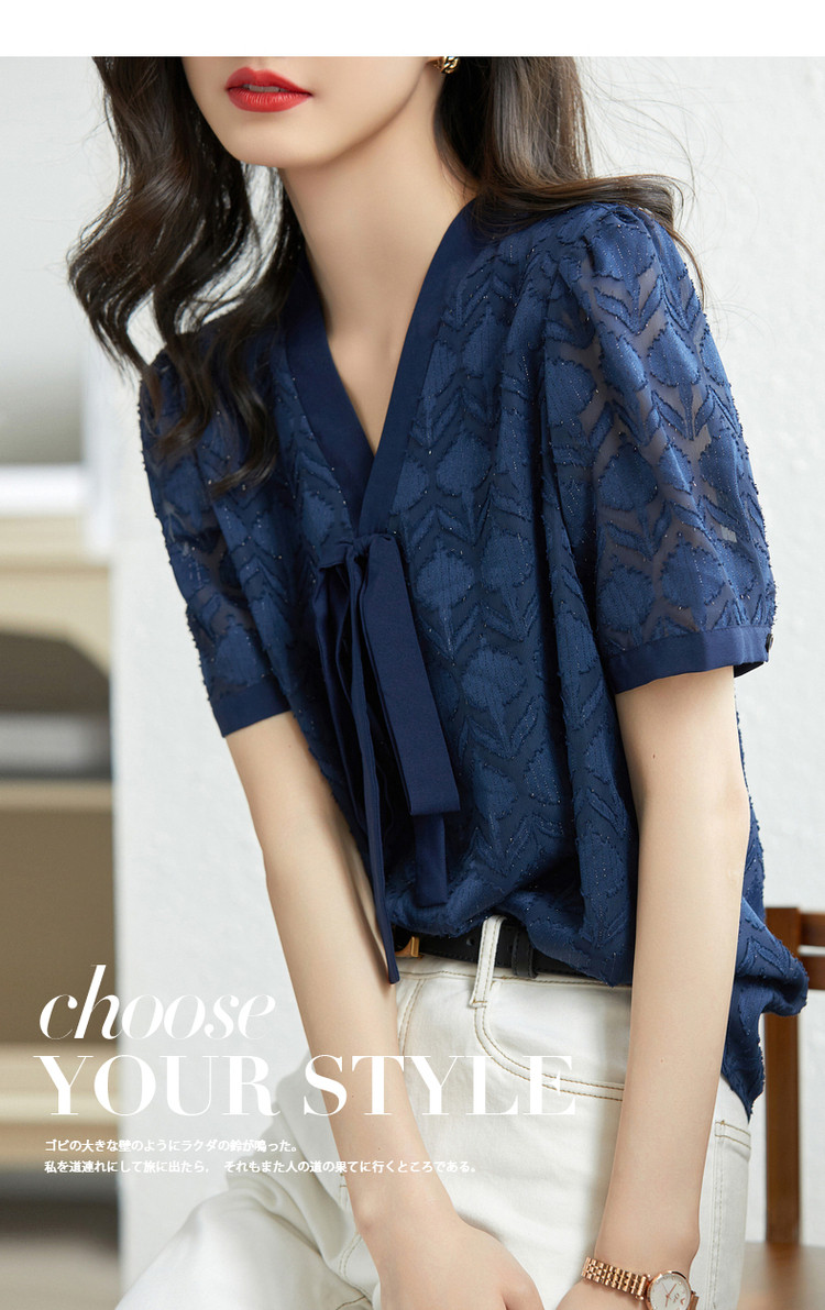 商品名称:【泡泡袖系带衬衫】夏季雅致V领短袖提花水洗衬衣女式上衣 675713