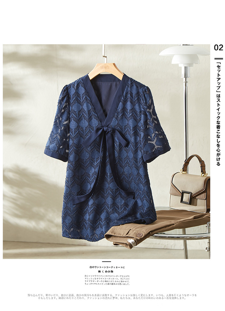 【泡泡袖系带衬衫】夏季雅致V领短袖提花水洗衬衣女式上衣 675713