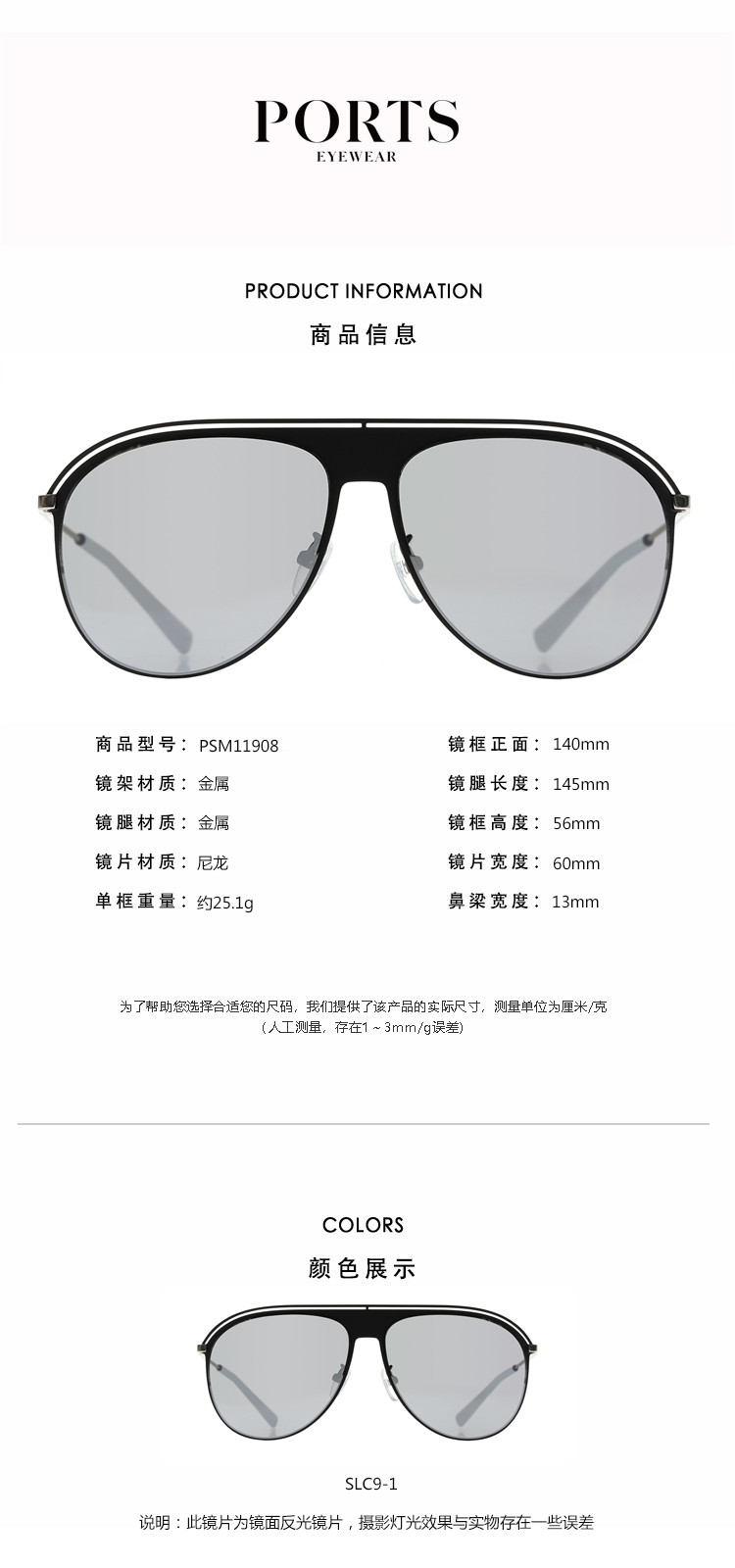 商品名称:PORTS休闲男款个性粗梁飞行员框男士太阳镜PSM11908 086922