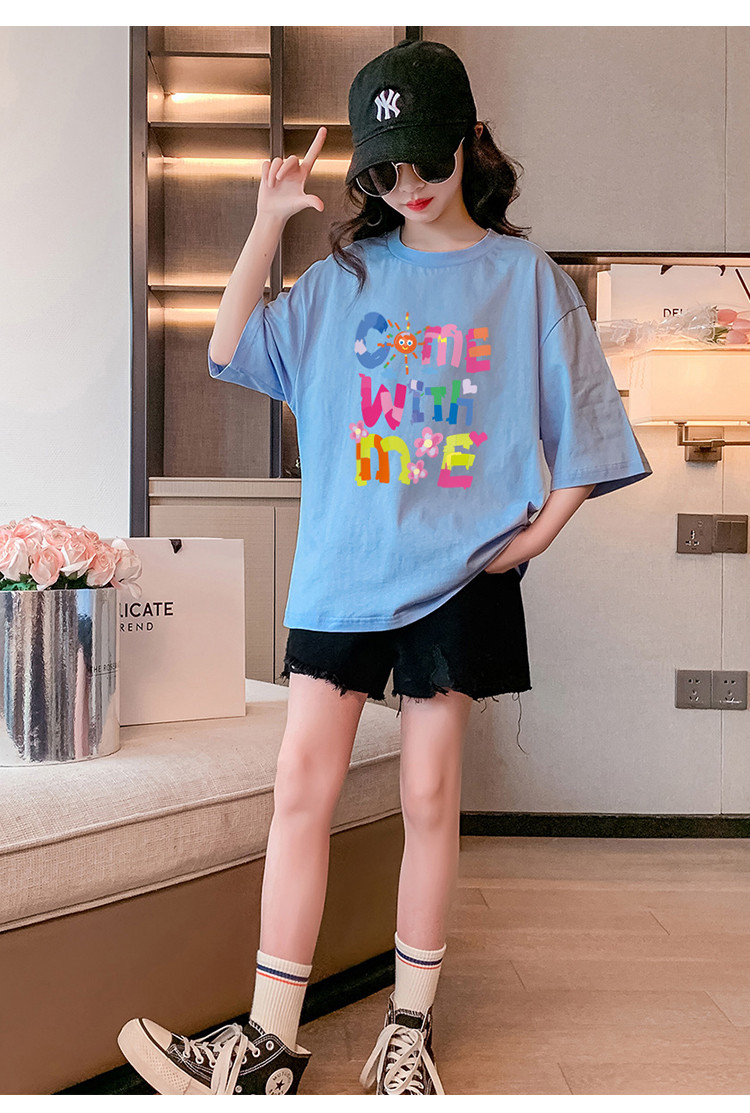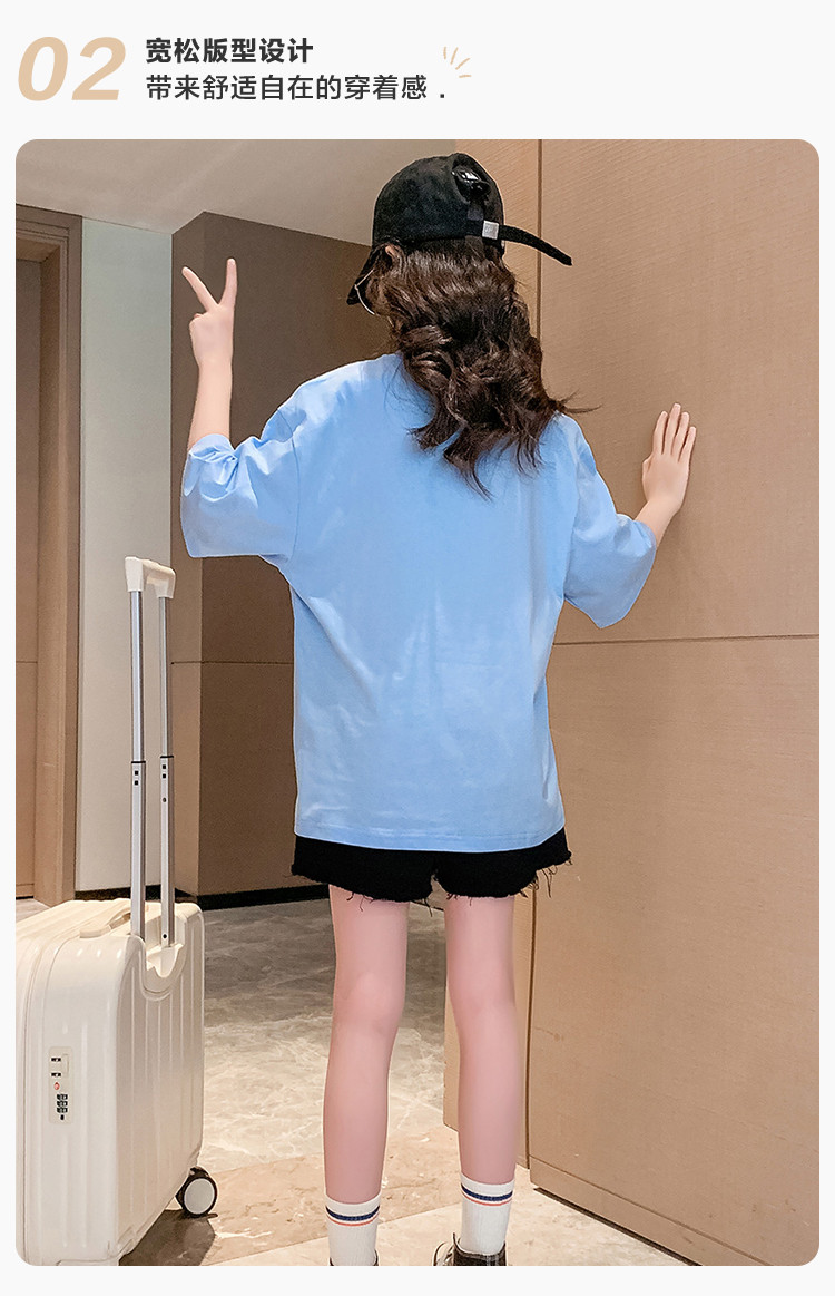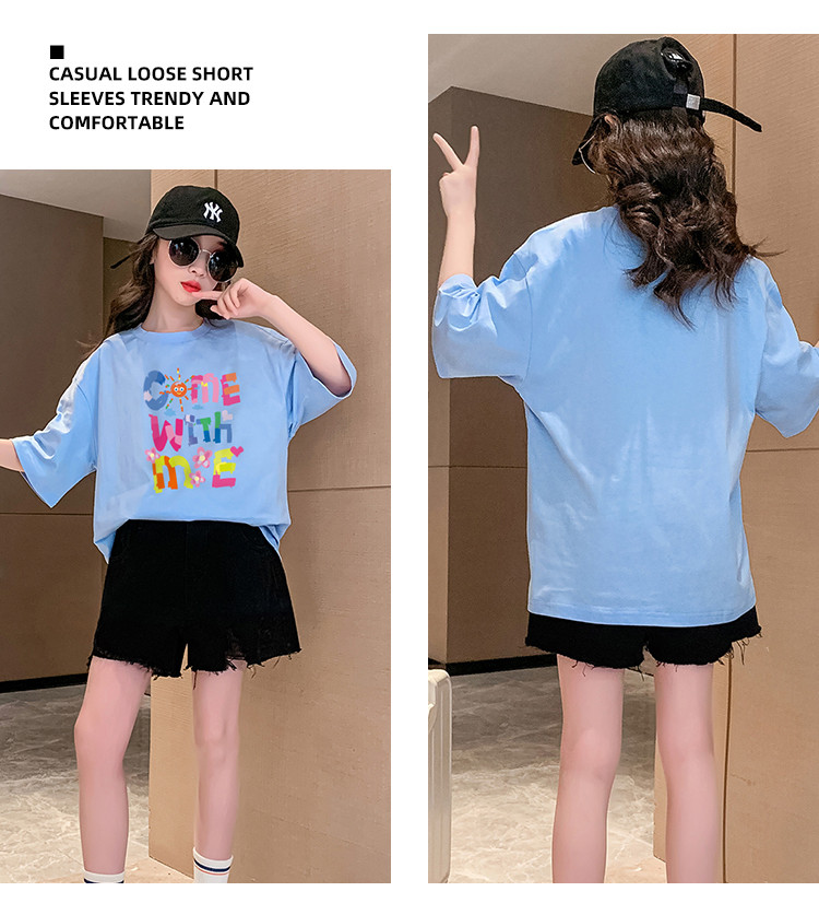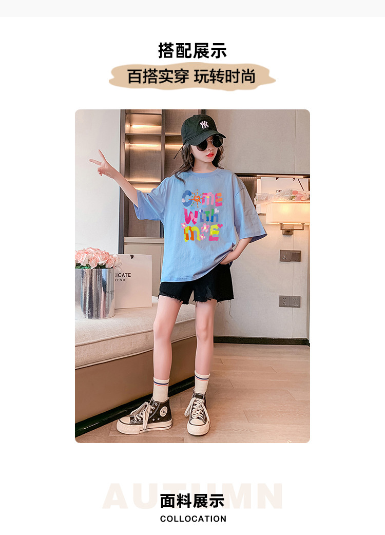 【纯棉吸汗】女童T恤春秋时尚儿童短袖衫中大童落肩短袖T恤上衣 002639